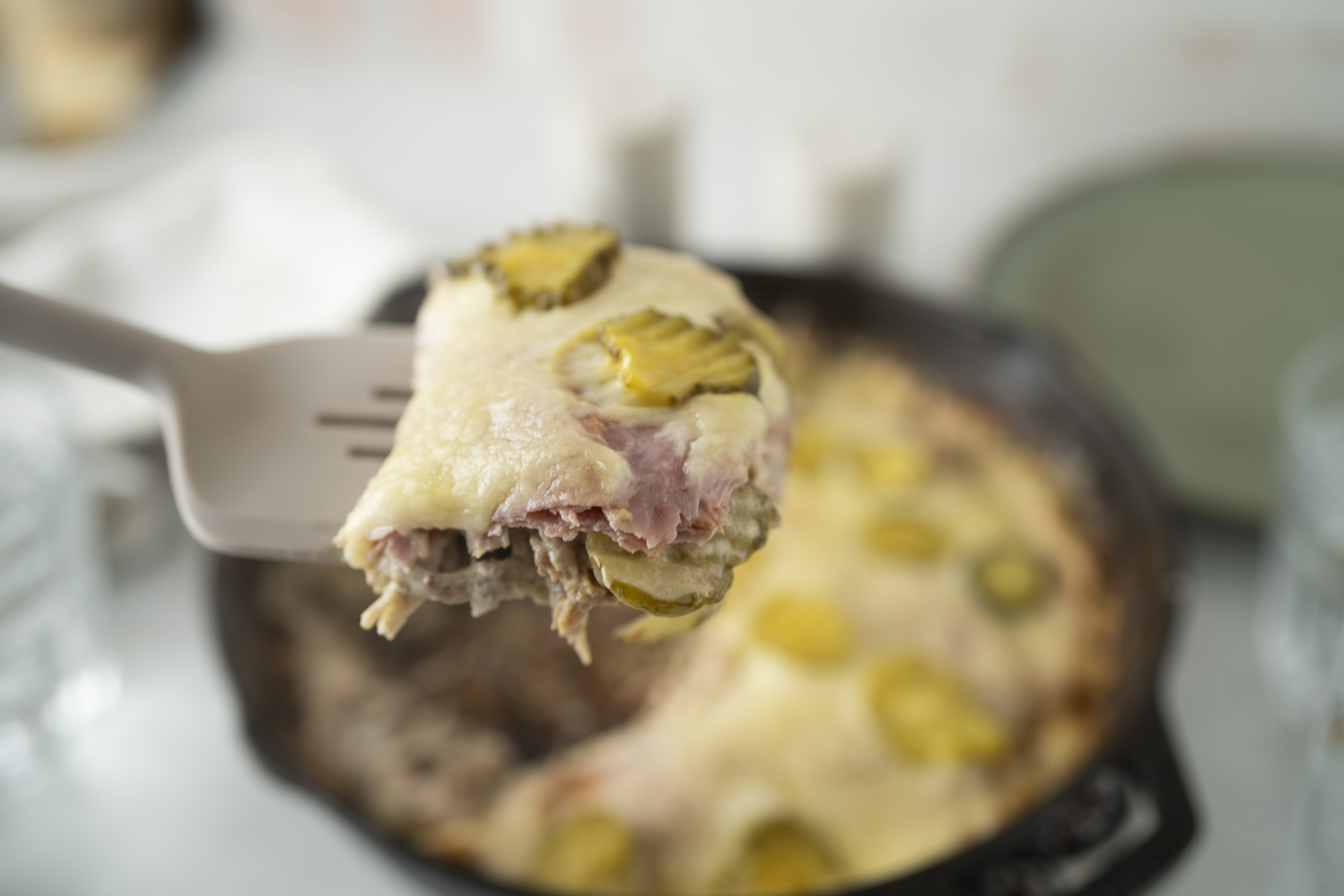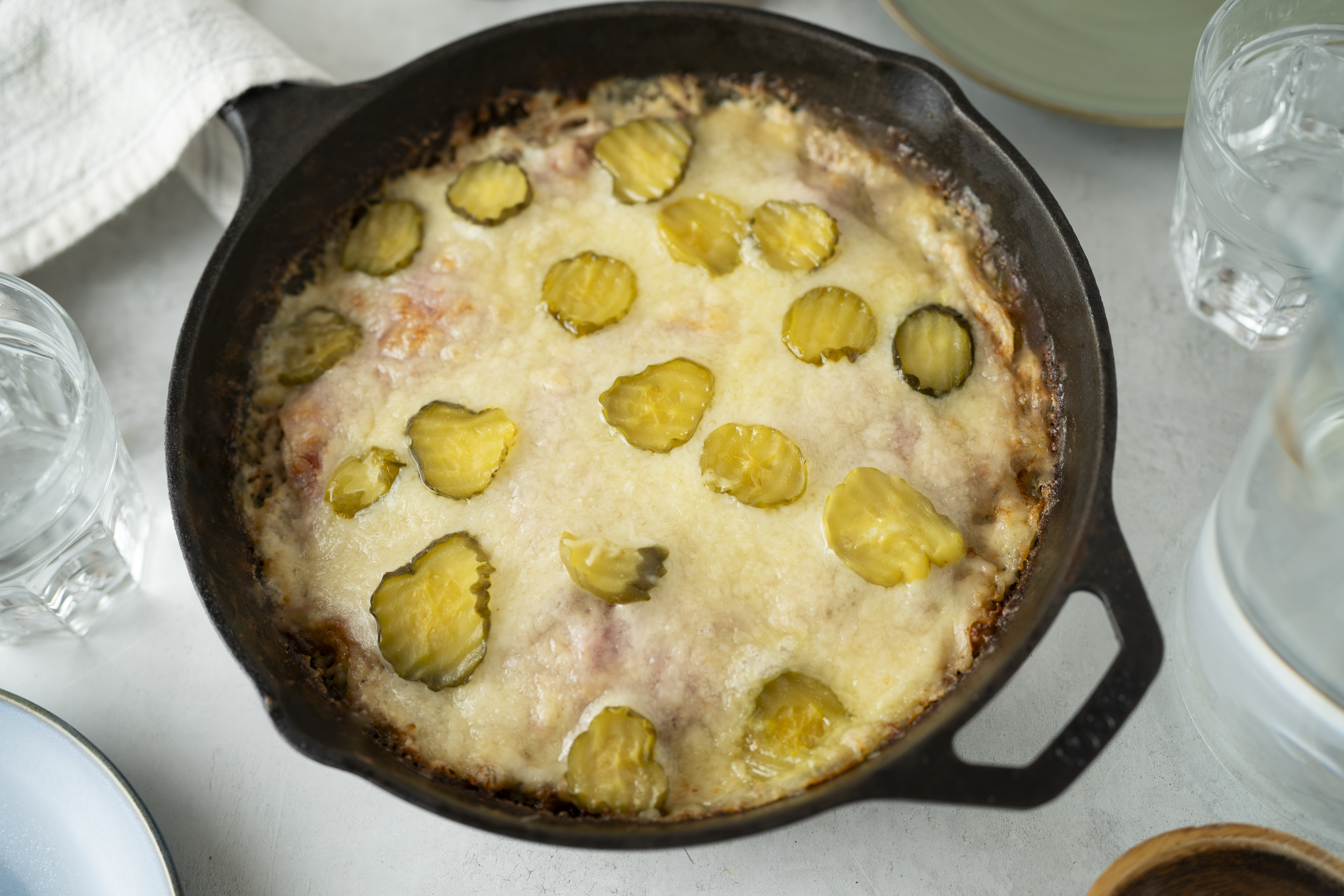 Step 4 -Top the pork mixture with the sliced ham, the Swiss cheese, and the remaining pickles and bake until the Swiss cheese is golden and bubbly, about 15-20 minutes.