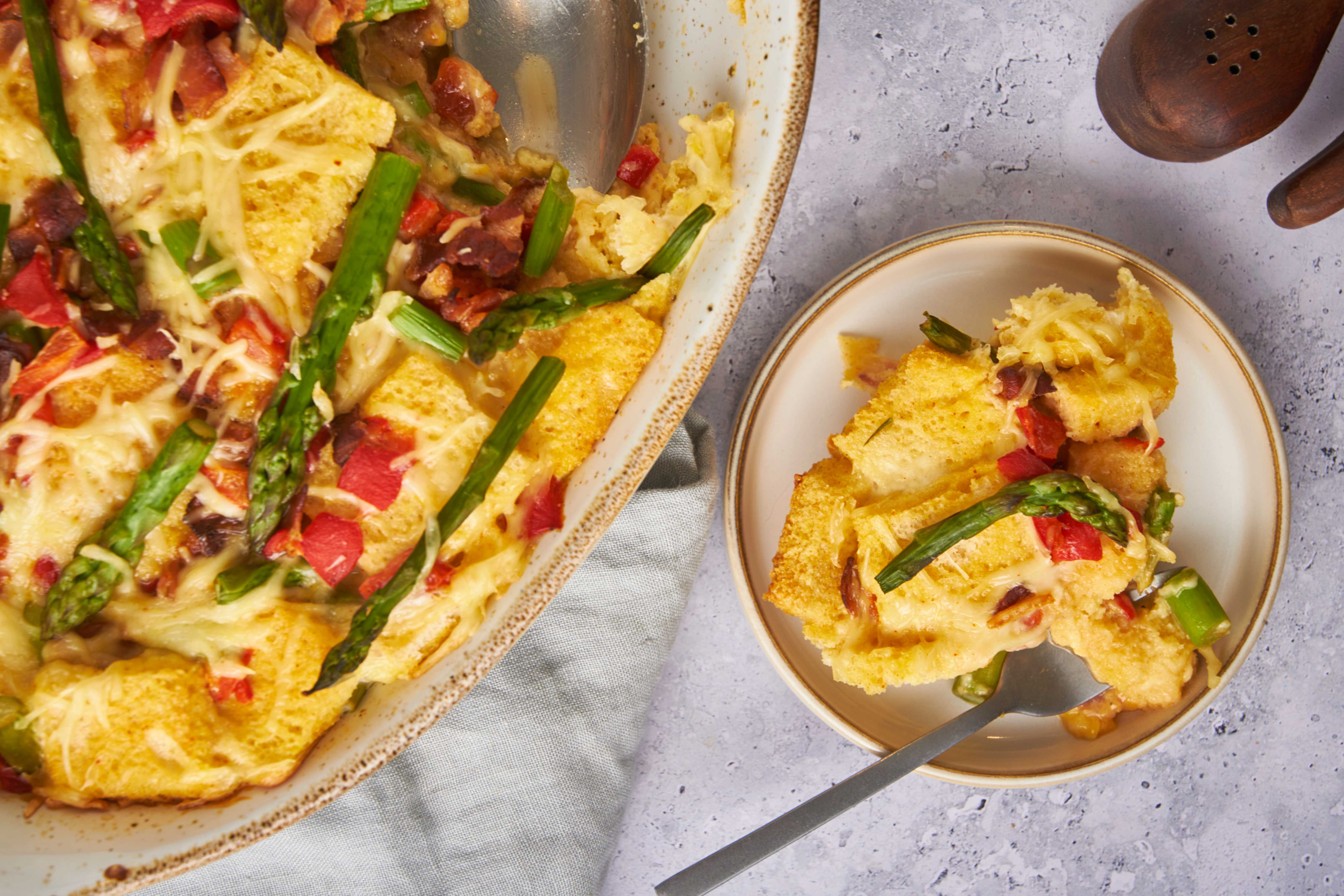 Step 2 -In a medium bowl, combine the bacon, the asparagus, and the red peppers.
