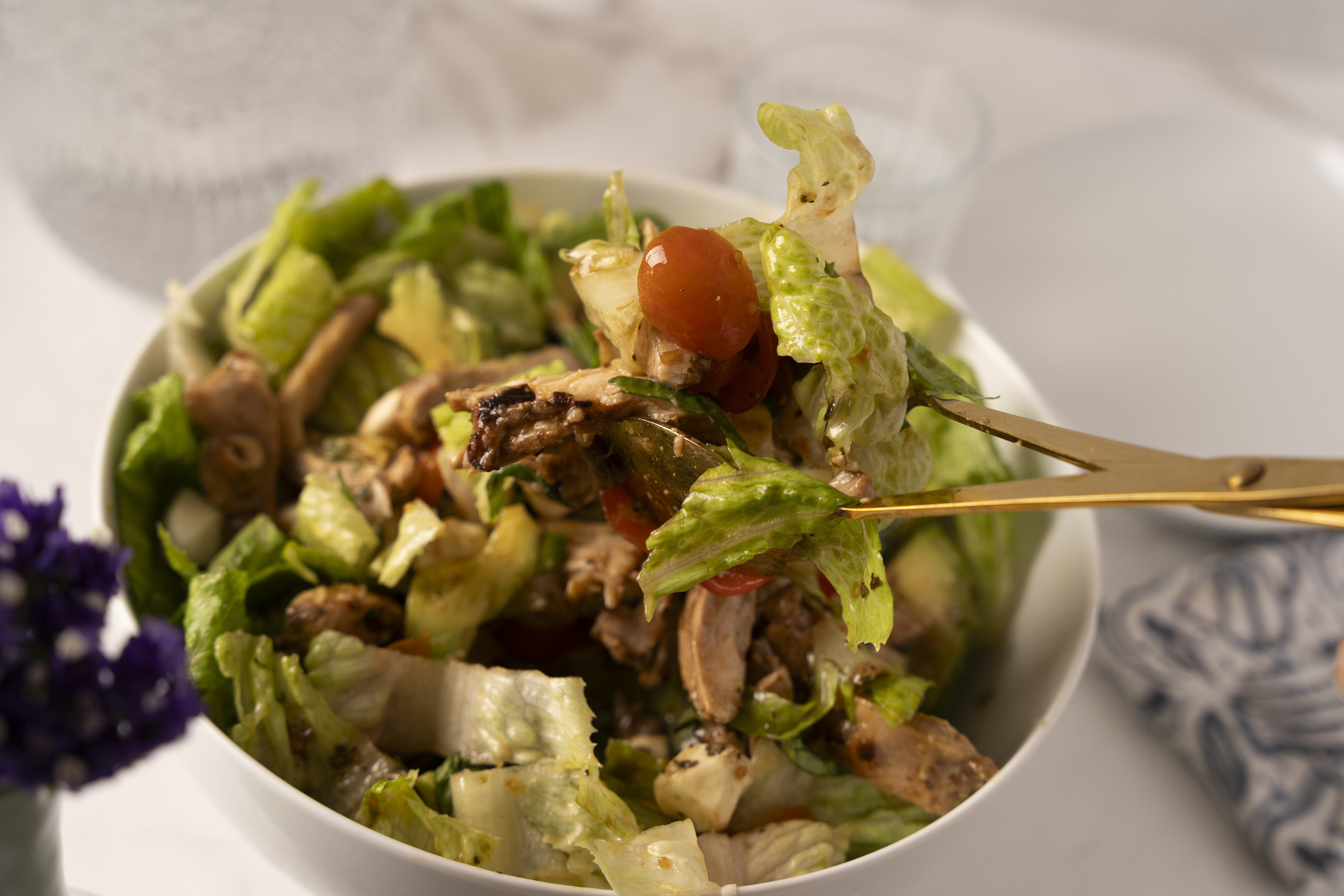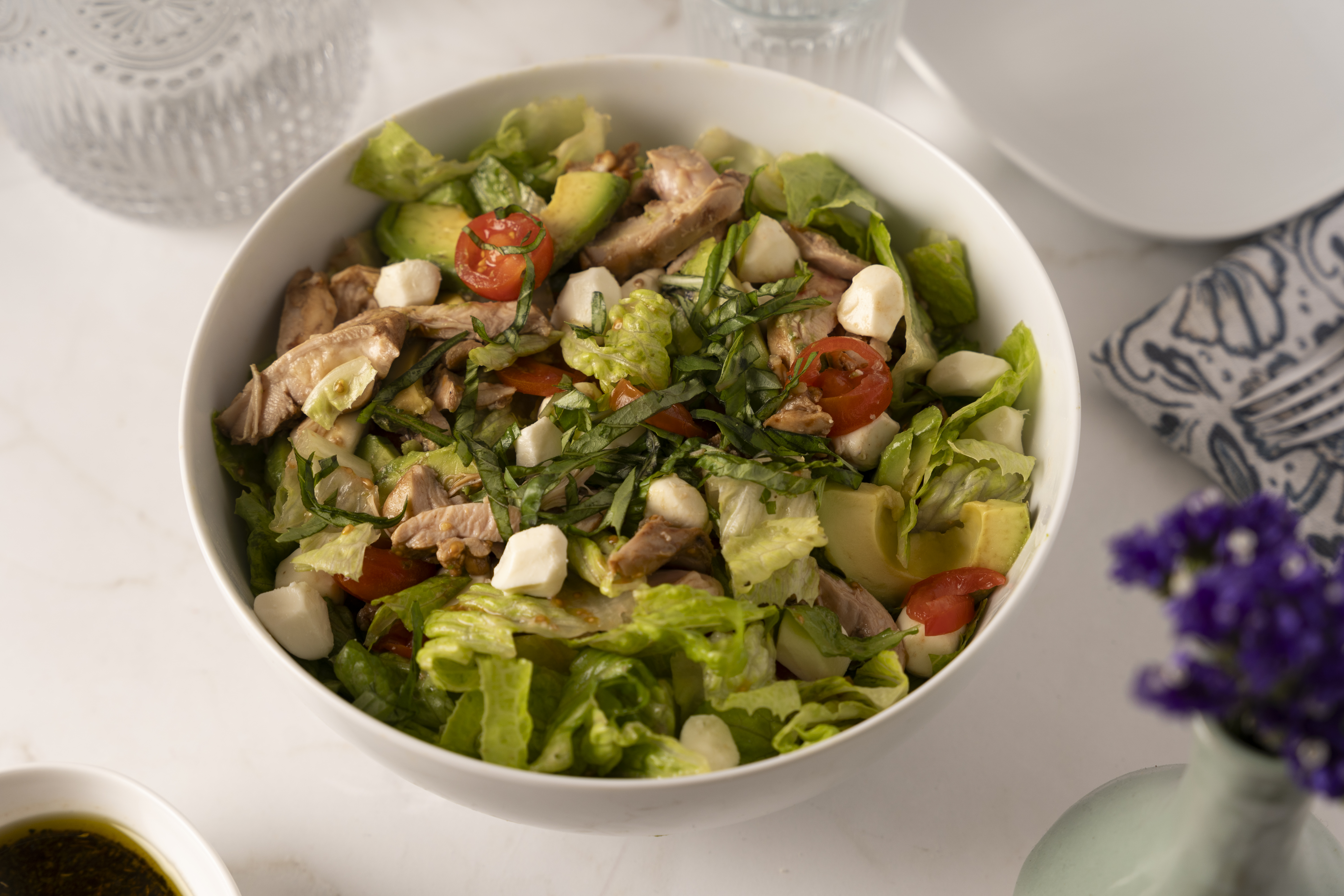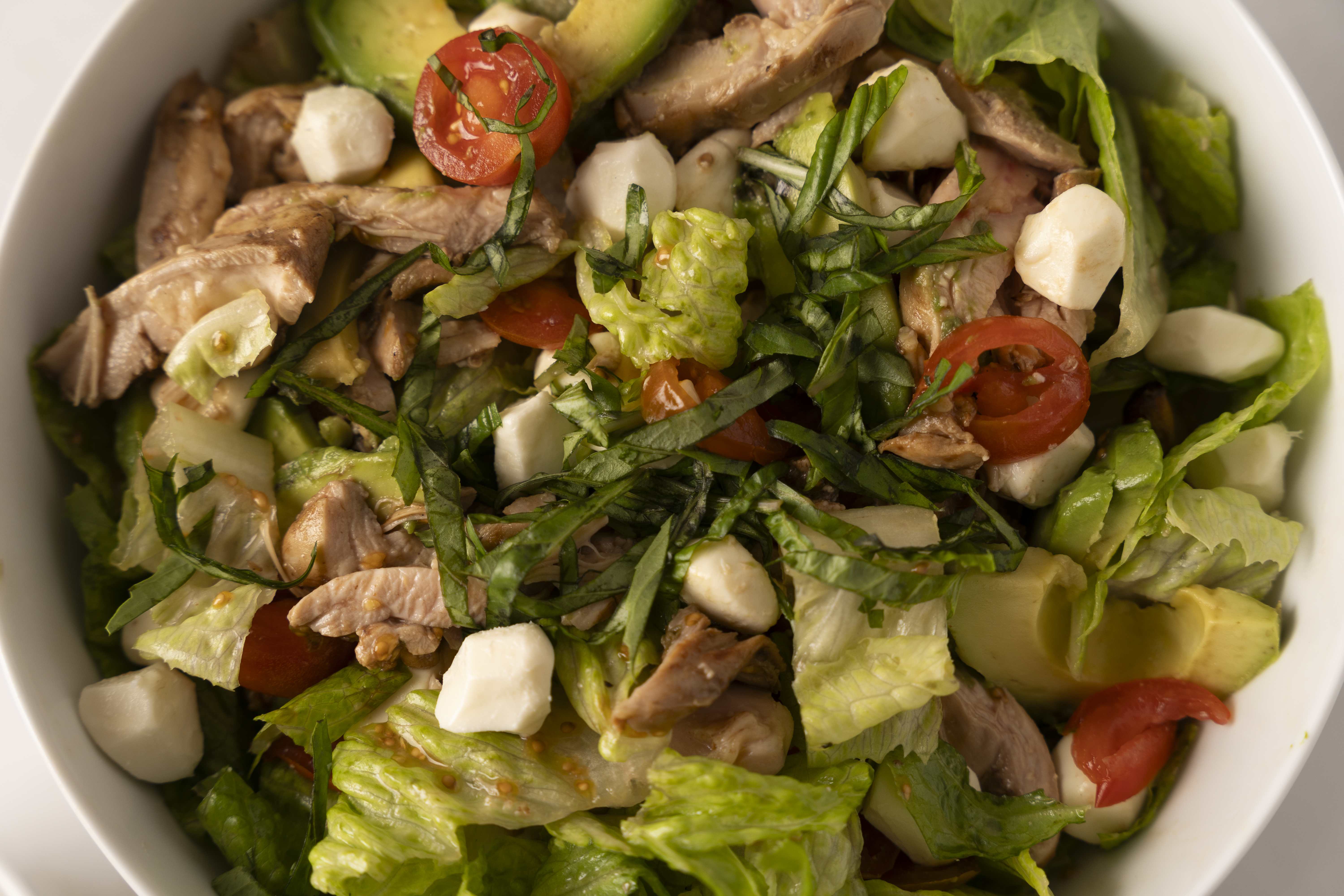 Step 7 -In a serving bowl, add the romaine, the avocado slices, the tomatoes, the mozzarella, and the chicken strips.