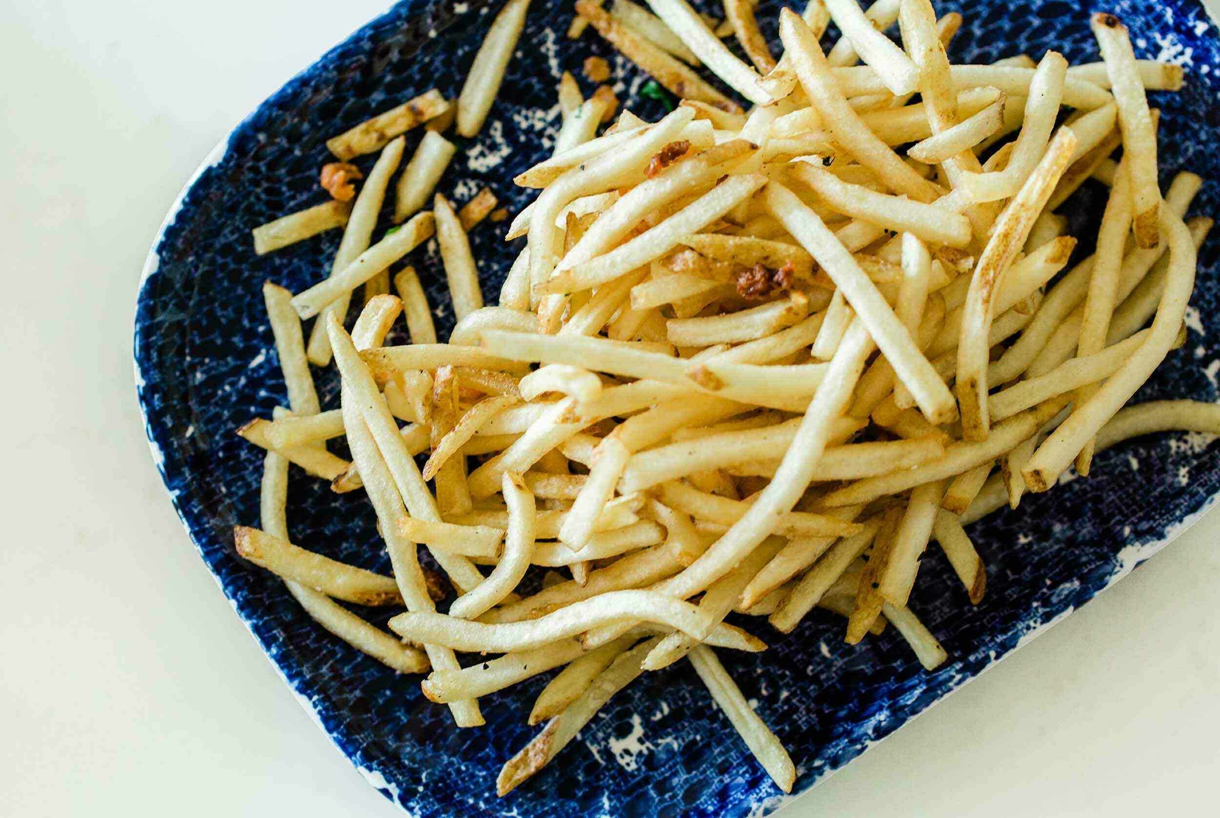 - 2 pounds russet potatoes, peeled, cut into 1/4-inch fries, submerged in a bowl of water after cutting