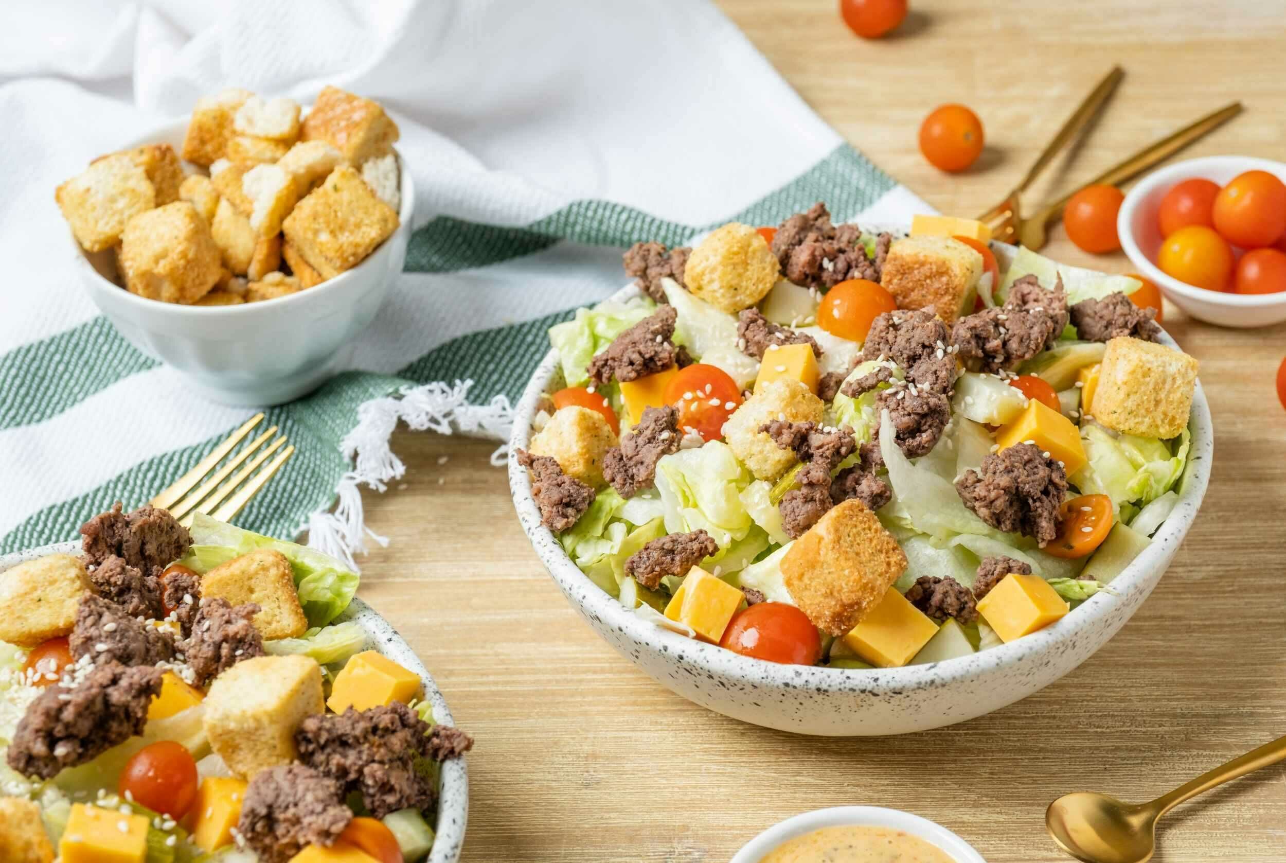 From incredibly catchy jingles to late-night trips to the drive-thru, everyone knows the Big Mac®, a classic of the burger world. It's hard to say no to it, even if you feel more inclined to a refreshing salad instead. The Big Mac Salad transforms the fast-food favorite into a savory salad that will blow traditional caesar salads out of the water: the dressing has all the tang and creaminess of the special sauce, the lettuce is crisp, the cheese is cheesy (always a plus), and the crumbled beef is just as juicy and meaty as the two all-beef patties. The Big Mac Salad is a healthy alternative to its namesake sandwich, which just means you'll be enjoying the amazing flavors guilt-free and without having to look for the golden arches!
