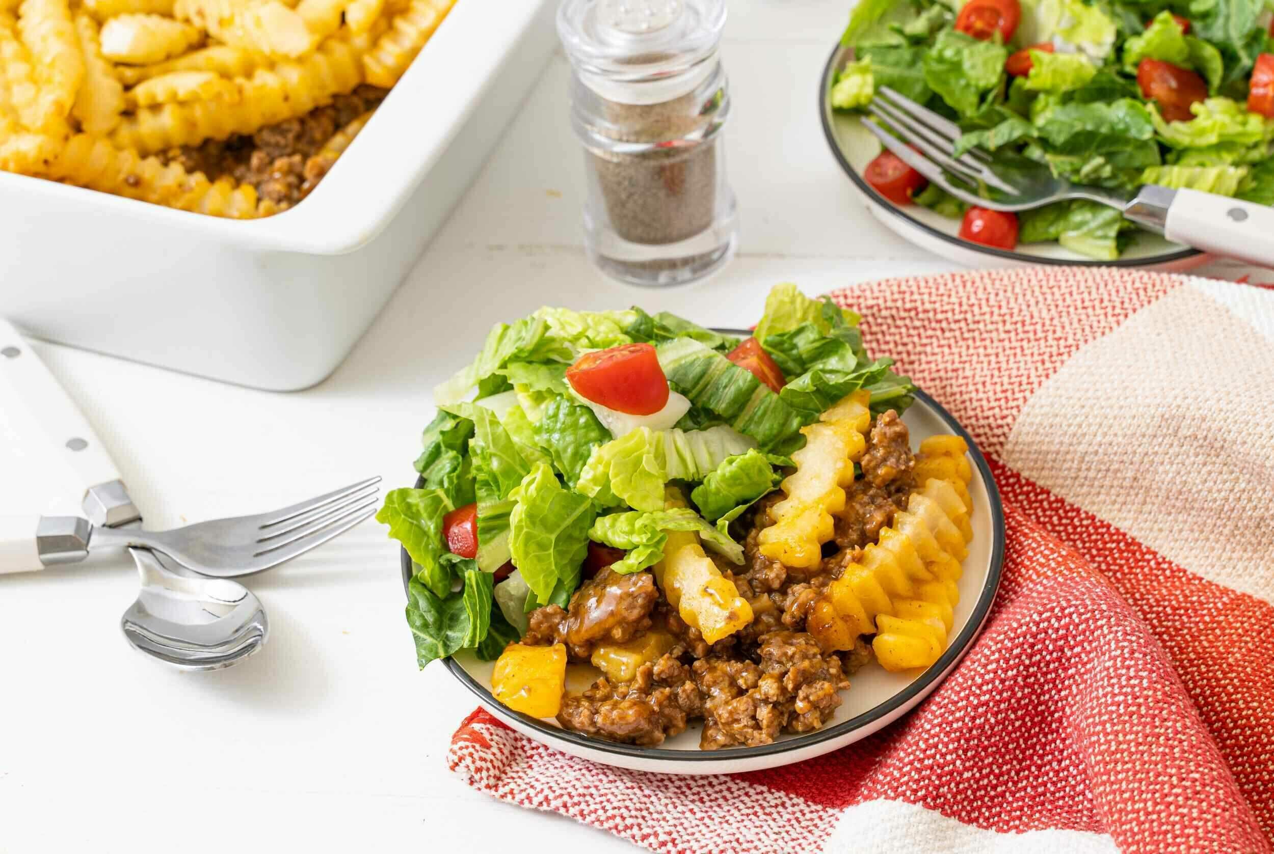 Step 7 -Arrange the french fries over the top and fully cover the beef mixture.