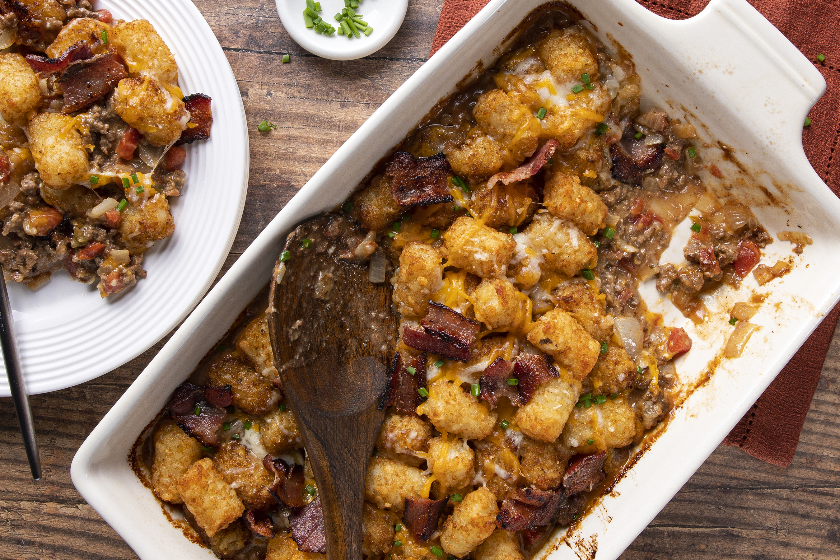 This casserole is everything you love about hamburgers just without the buns! Bun-Free Casserole places the juicy, savory hamburger meat front and center, packing it with plenty of wonderful umami and spicy flavors to ensure each bite is exciting and dynamic! The hamburger meat is topped with melty cheese and crispy, fluffy-on-the-inside tater tots for the full burgers-and-fries experience... and that's all before the crunchy bacon gets sprinkled on top! Bun-Free Casserole proves you don't need a bun when it's burger time!