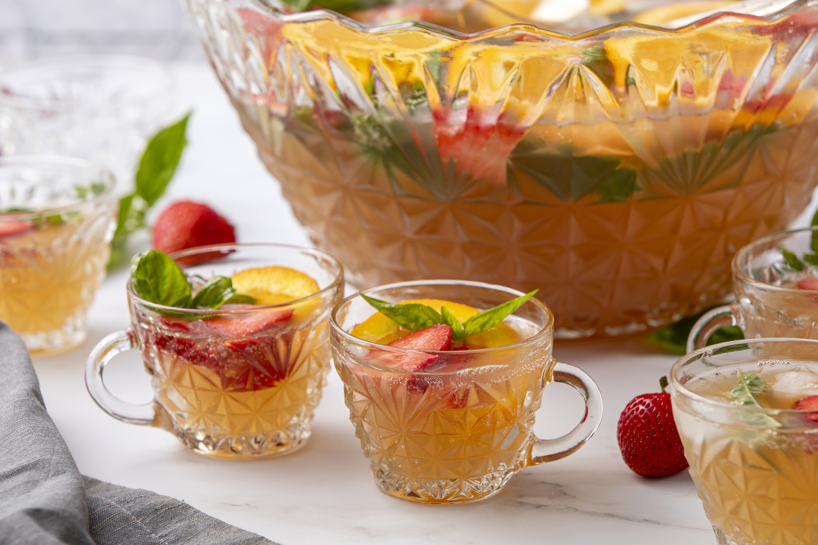 Fruity, refreshing, and fun, all the requirements of a tasty glass-of-class! Champagne Holiday Punch will "wow" your guests and leave them coming back for more. Orange juice and dry Champagne take center stage with cranberry juice, ginger ale, sliced strawberries and oranges, and a little basil all joining in on the punch party. 'Tis the season to celebrate in style with Champagne Holiday Punch. May all your celebrations be bright, and bubbly!