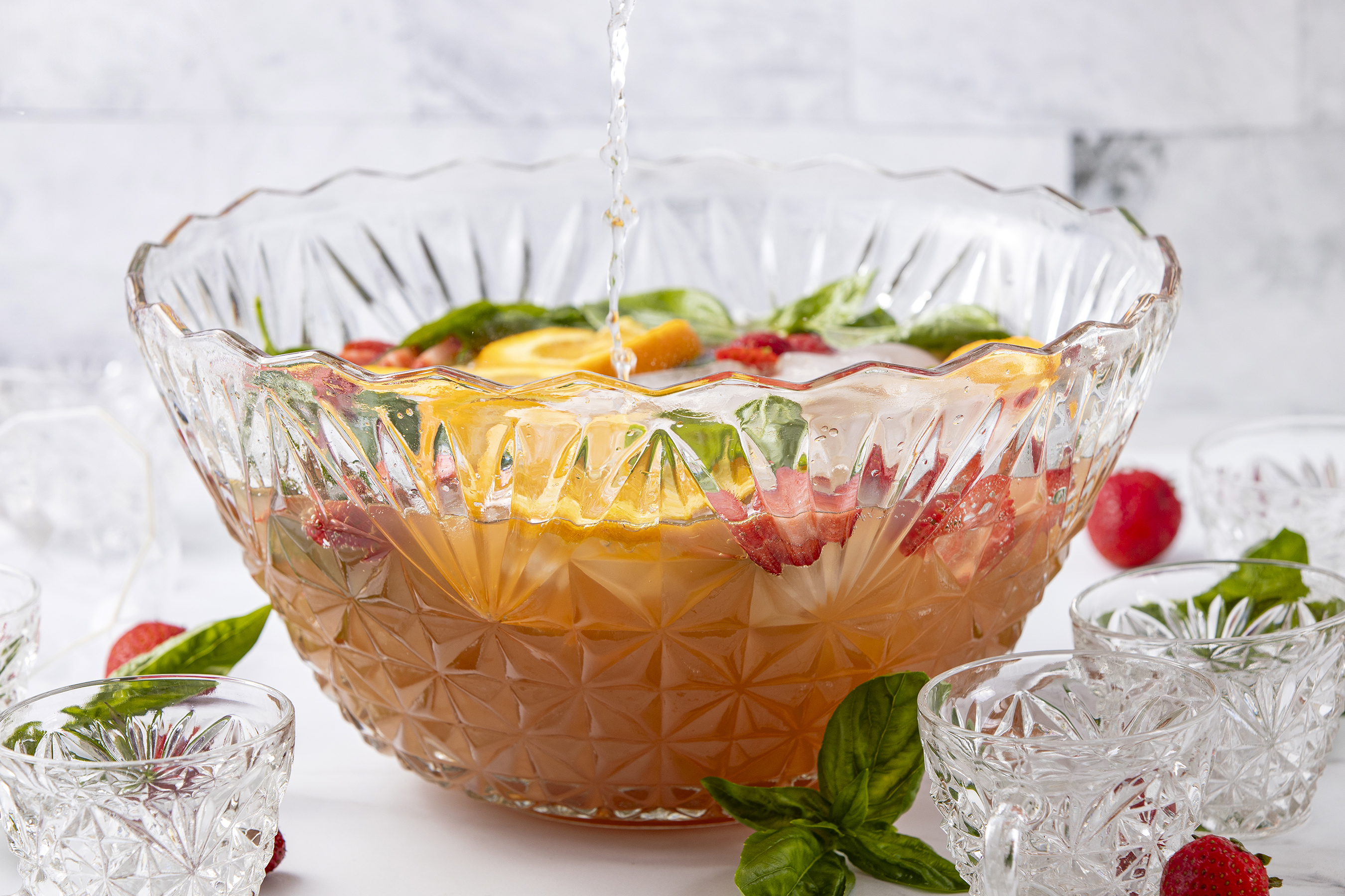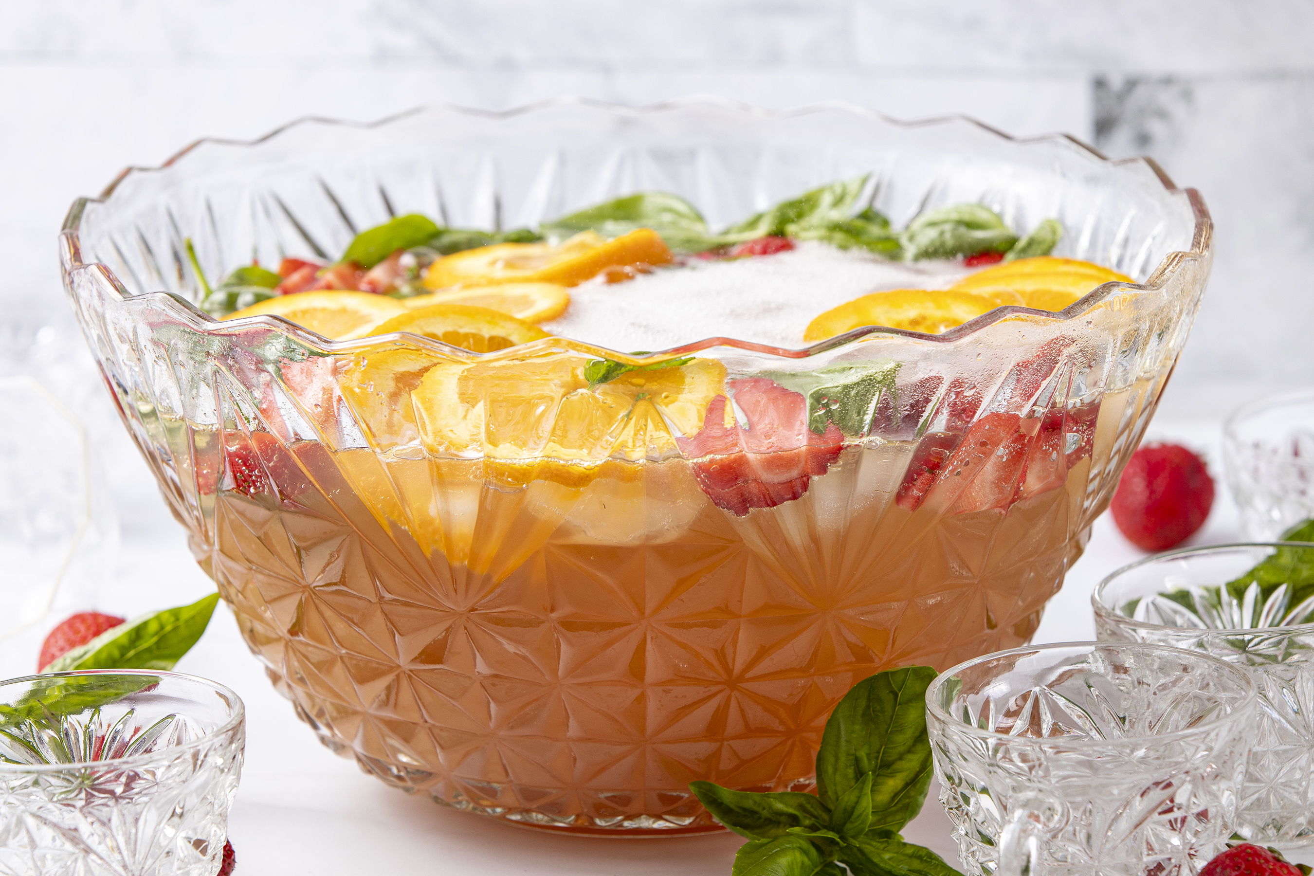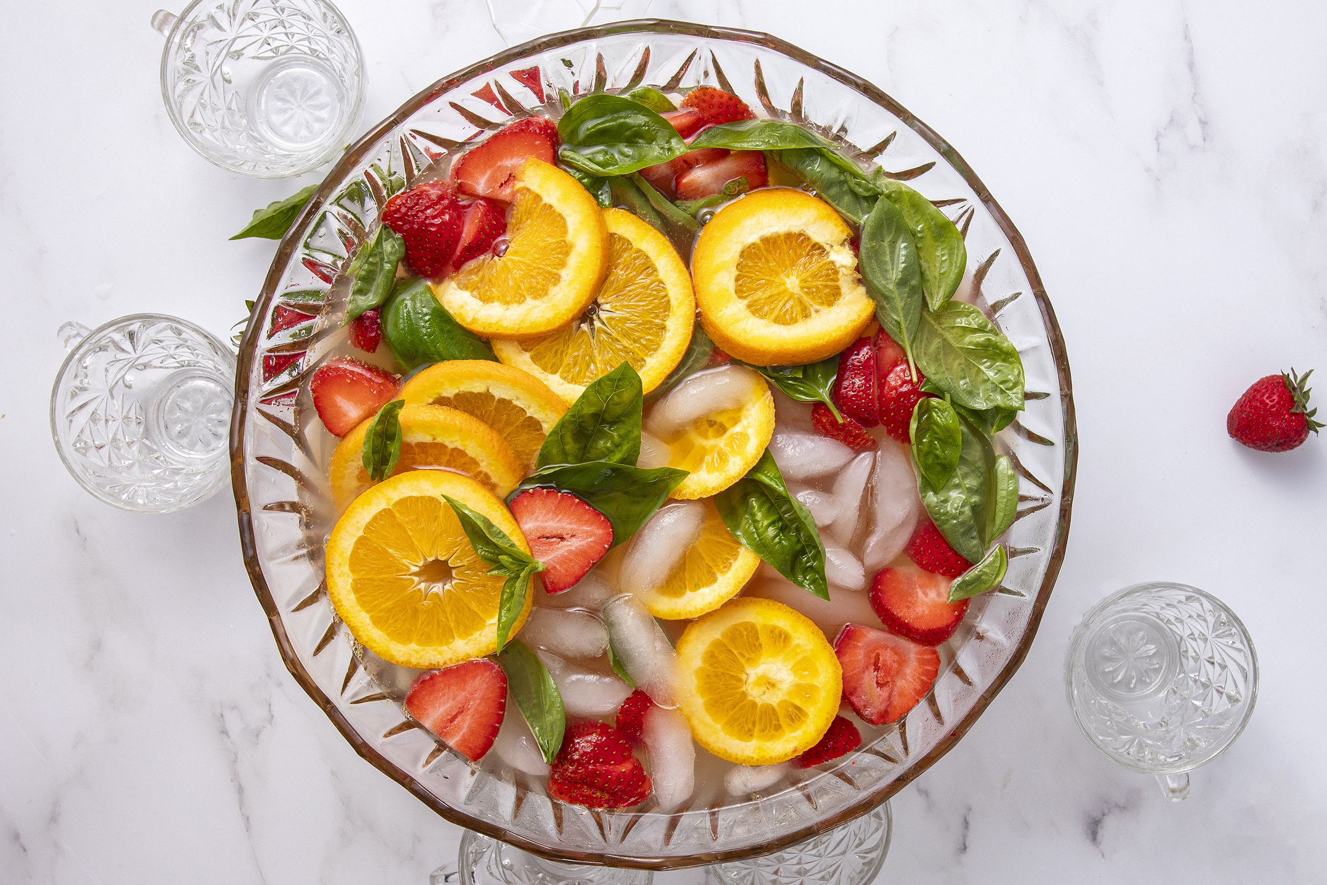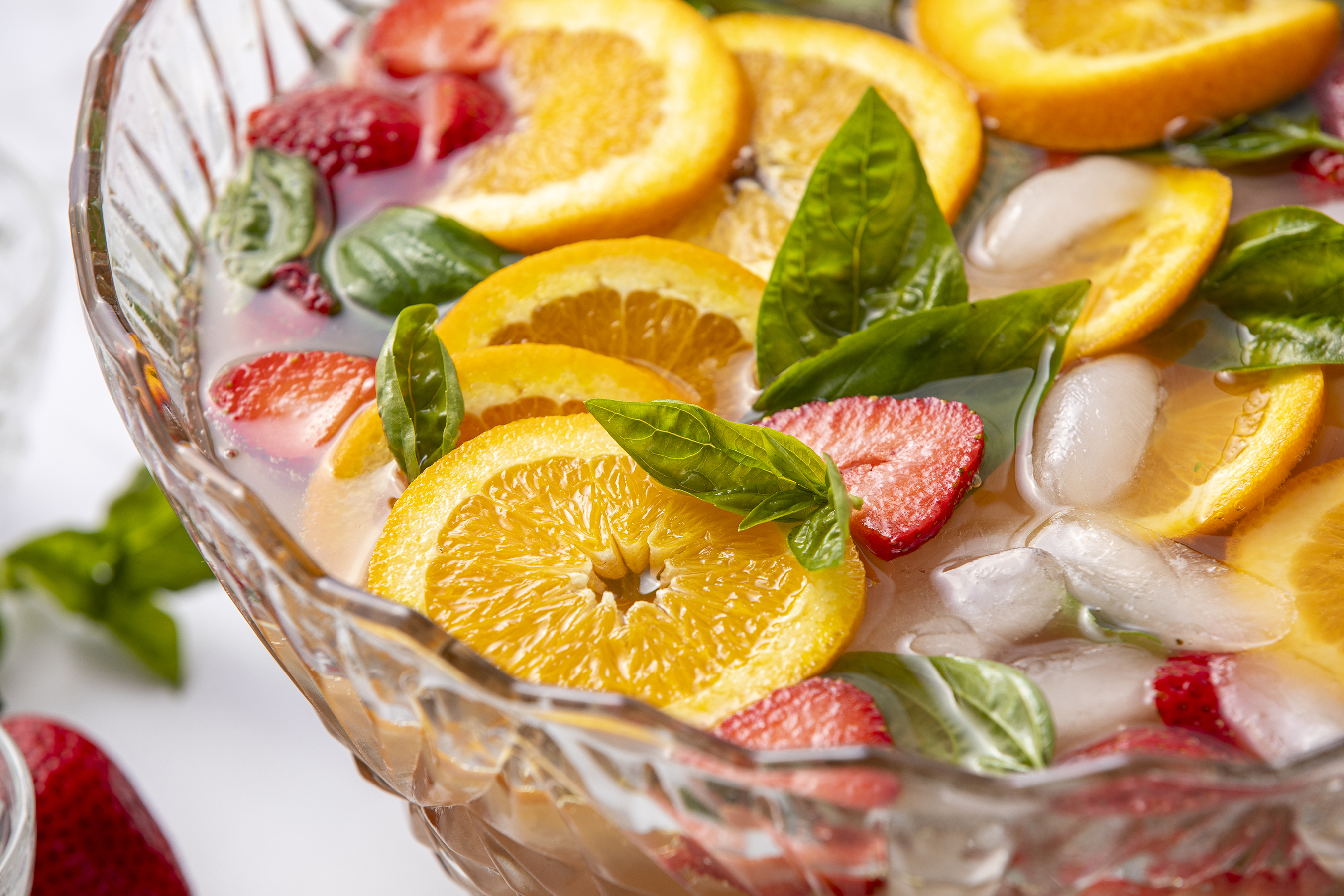 Step 1 -In a large punch bowl, add the orange juice, the cranberry juice, the ginger ale, the sliced strawberries, the basil leaves, and the orange slices and stir together.