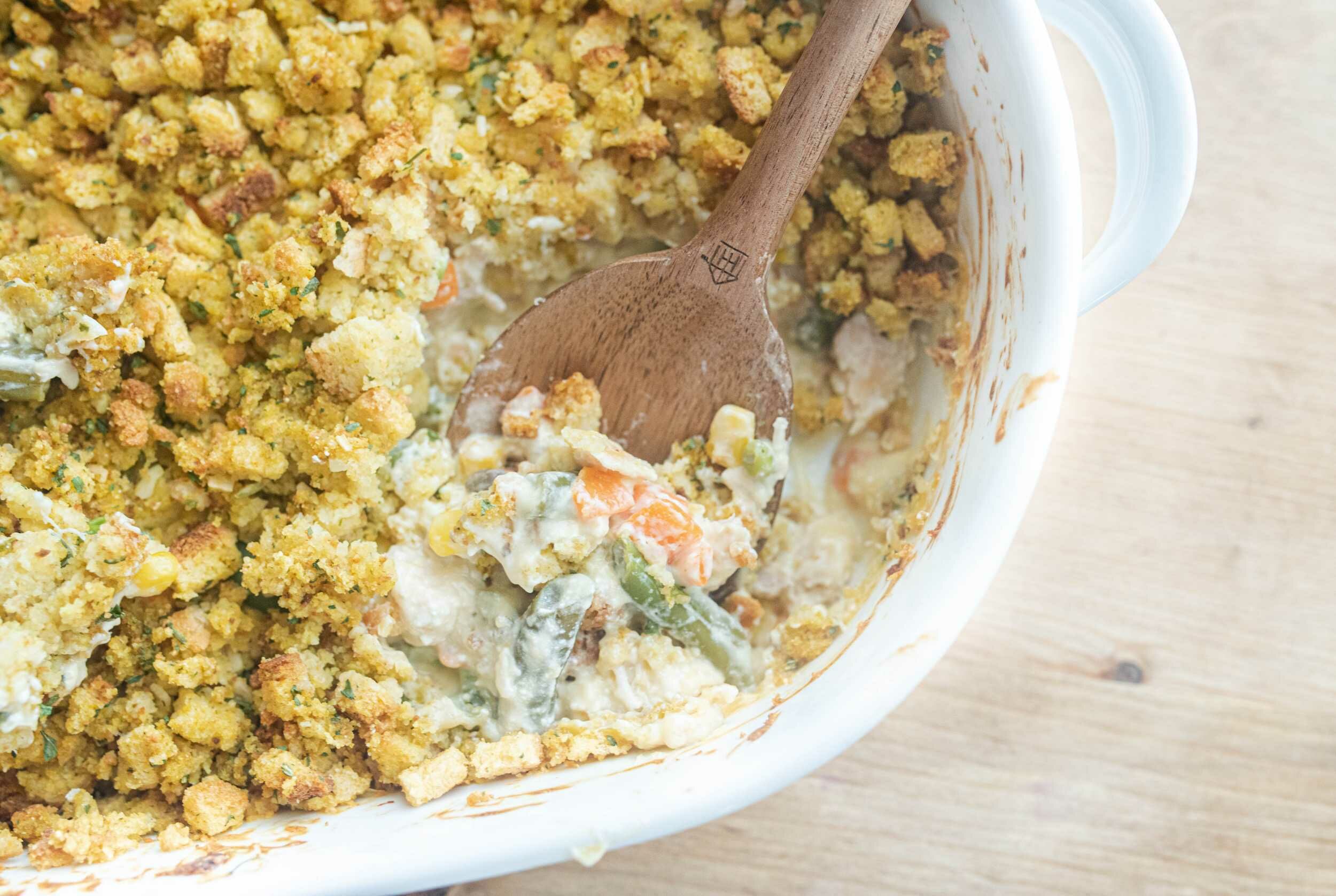 Whether Thanksgiving is right around the corner or months away, everyone loves the taste of fresh stuffing. You can make Chicken Stuffing Casserole any time of year, and in a snap at that! This savory dish, filled with bites of juicy chicken, satisfies that carving for hearty holiday fare no matter when it strikes. A meaty treat and comforting casserole, Chicken Stuffing Casserole is a tender side dish for your next weekday dinner!