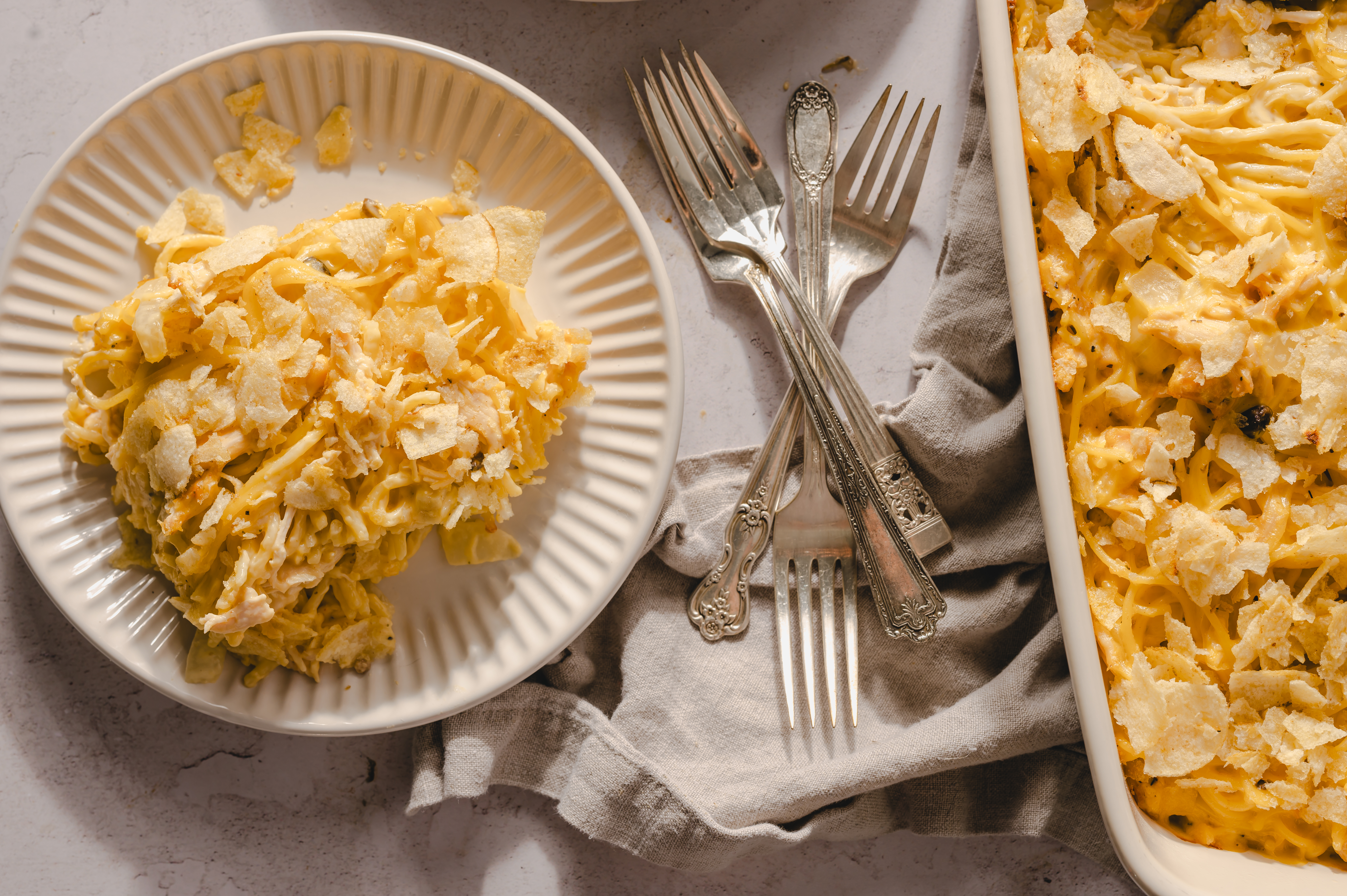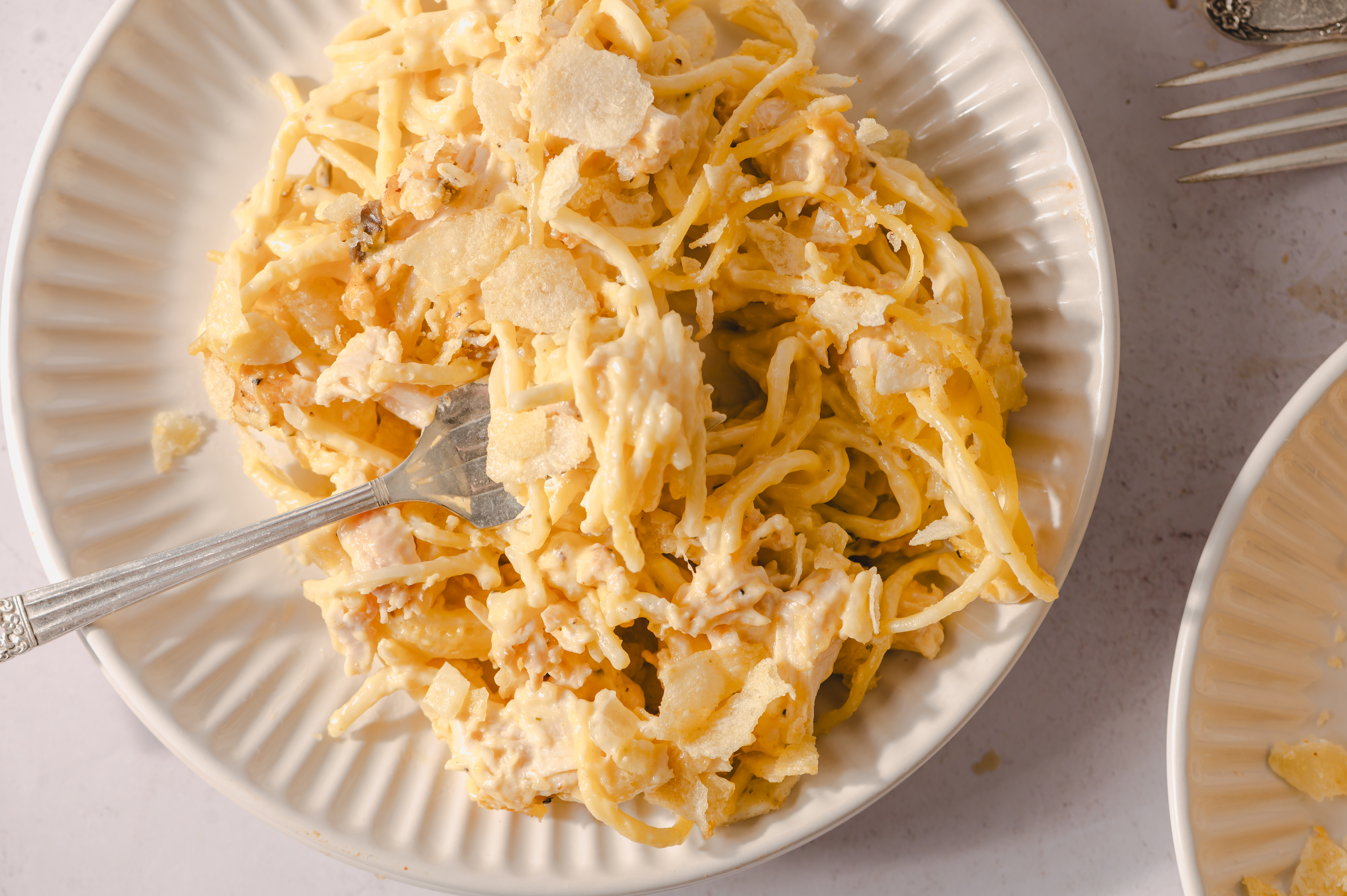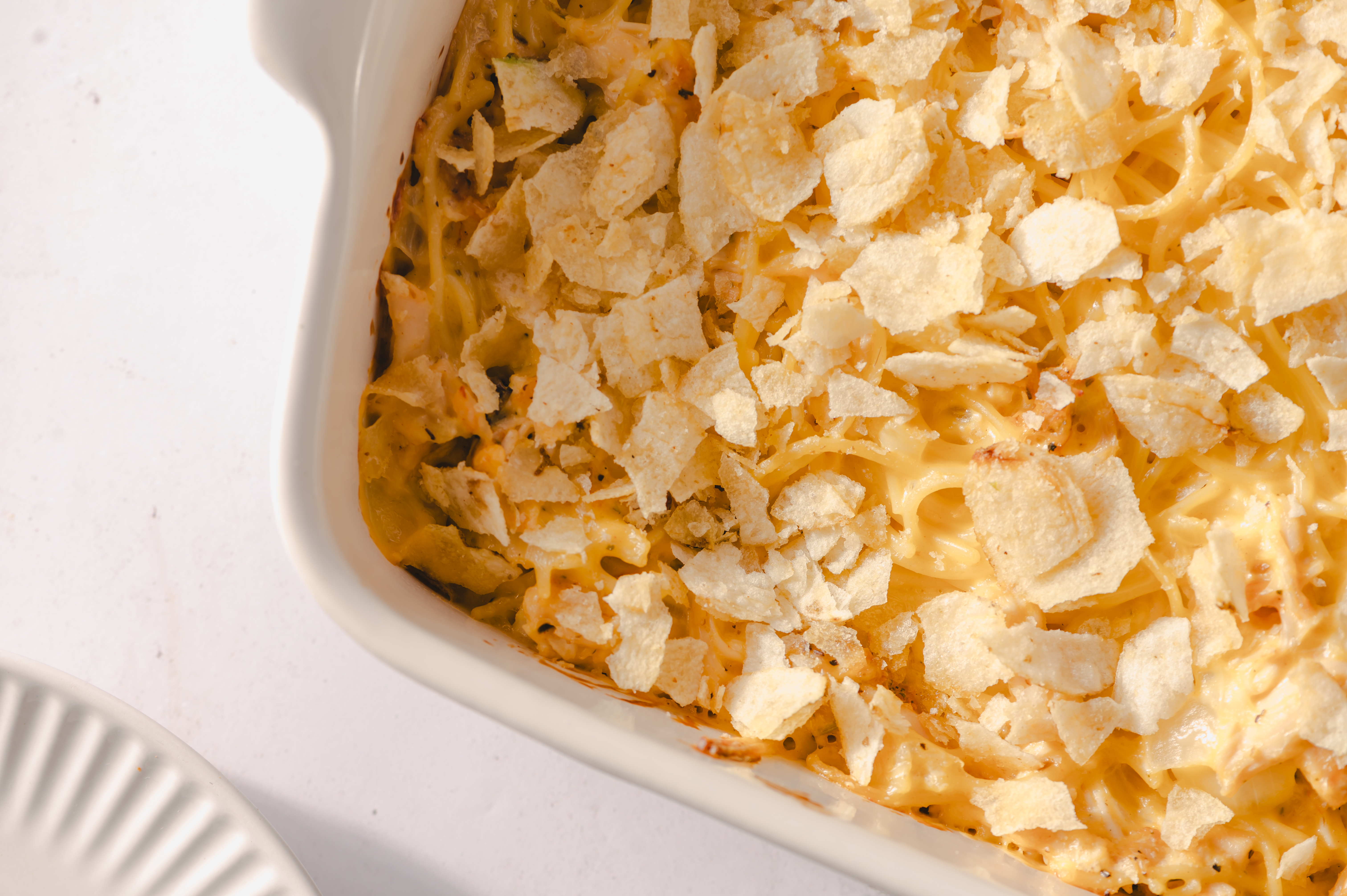 No matter how young or old we are, everyone wants to feel comforted. And with Comfort Spaghetti, we're sure you'll quickly be soothed and satisfied. This cushiony casserole involves a lounge of spaghetti that's covered with a perfectly seasoned Velveeta® cheese sauce. There's shredded chicken in there, too, and it's all topped with crushed potato chips. Then, it's baked until bubbly for a honey-I'm-home-so-let's-eat kind of feeling! Sit back, relax, and wrap yourself up in Comfort Spaghetti for a cozy dinner favorite that involves no worries and no fuss. This is certainly the life!