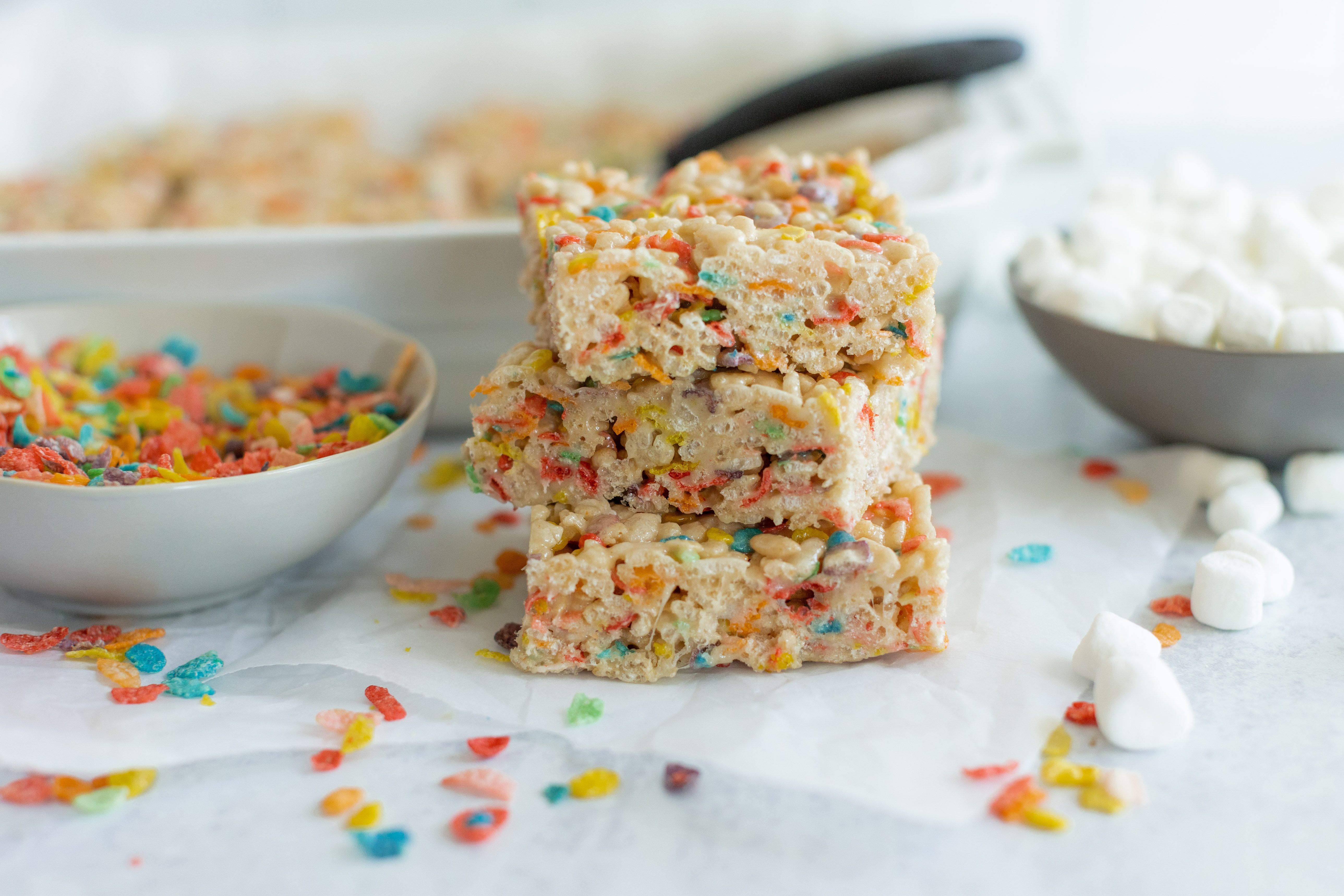 Break out the streamers, the balloons, and the Confetti Squares because it's time to celebrate! What are we celebrating? Well, we're celebrating how delicious these Confetti Squares taste of course! They aren't your ordinary rice squares; they're filled with bursts of fruit flavors, a nutty richness from brown butter, the sweetness of bourbon, and of course sprinkles for colors of pure joy! Plus, it takes less than half an hour to put these little festivals together! The party starts right now with this treat on the table!