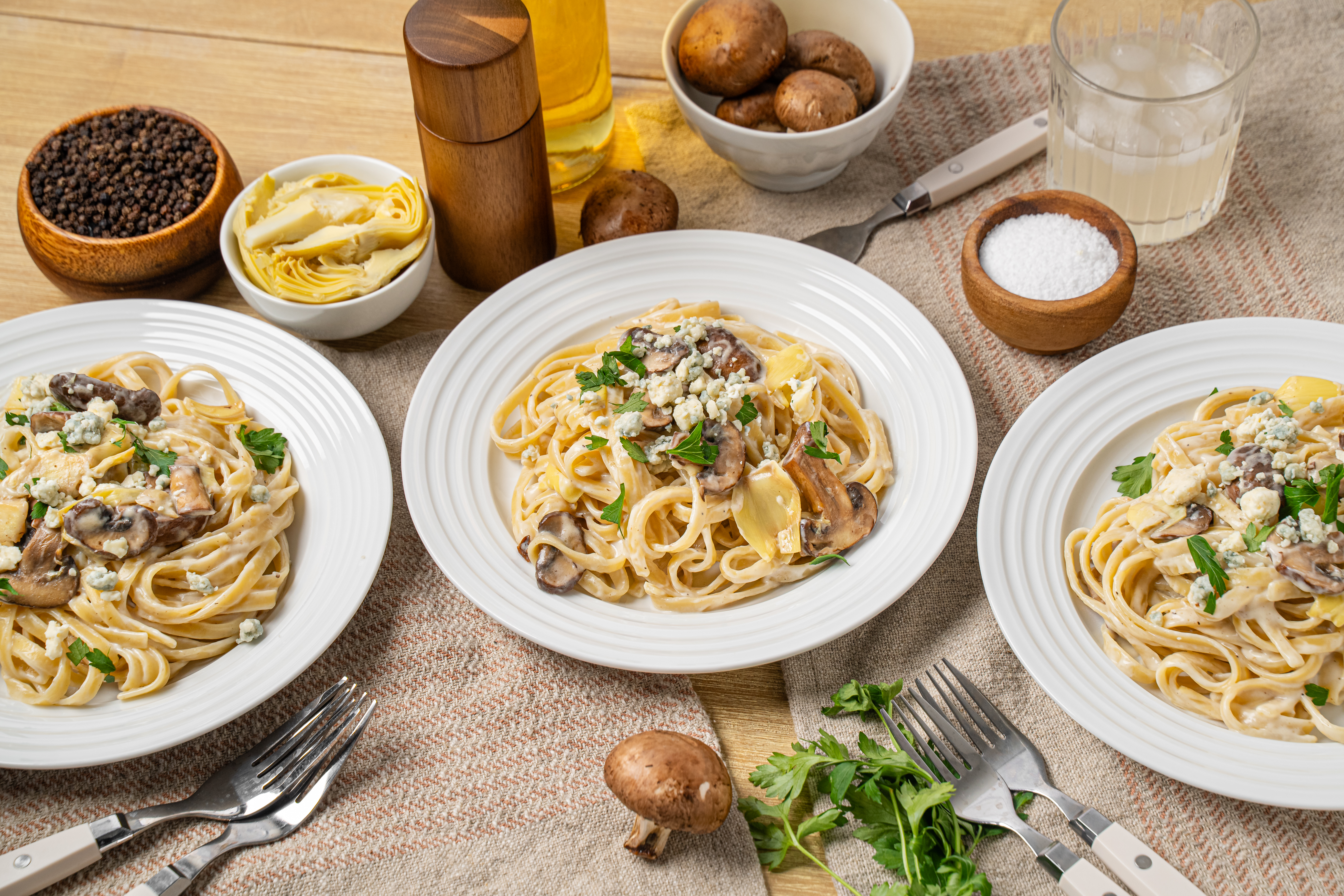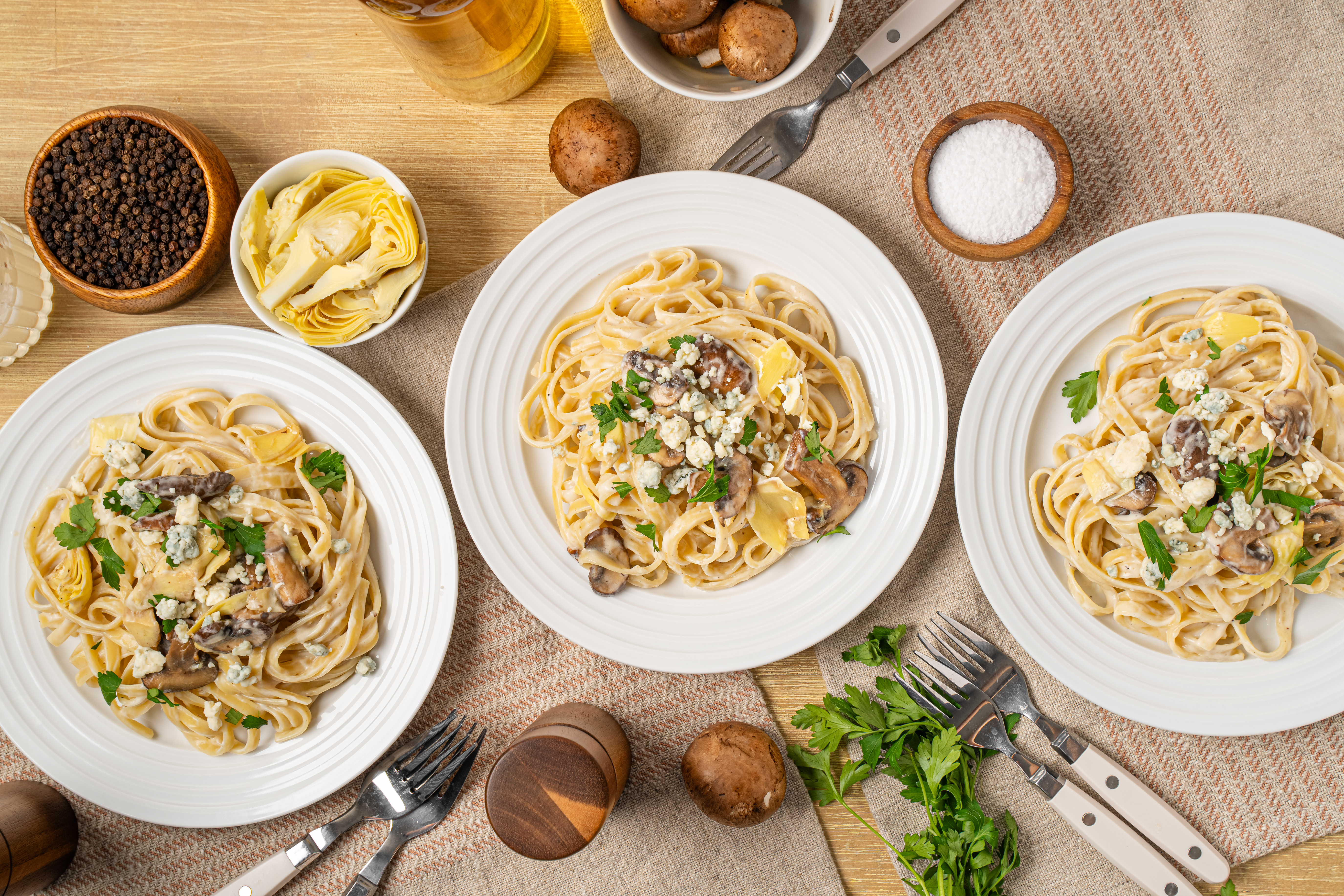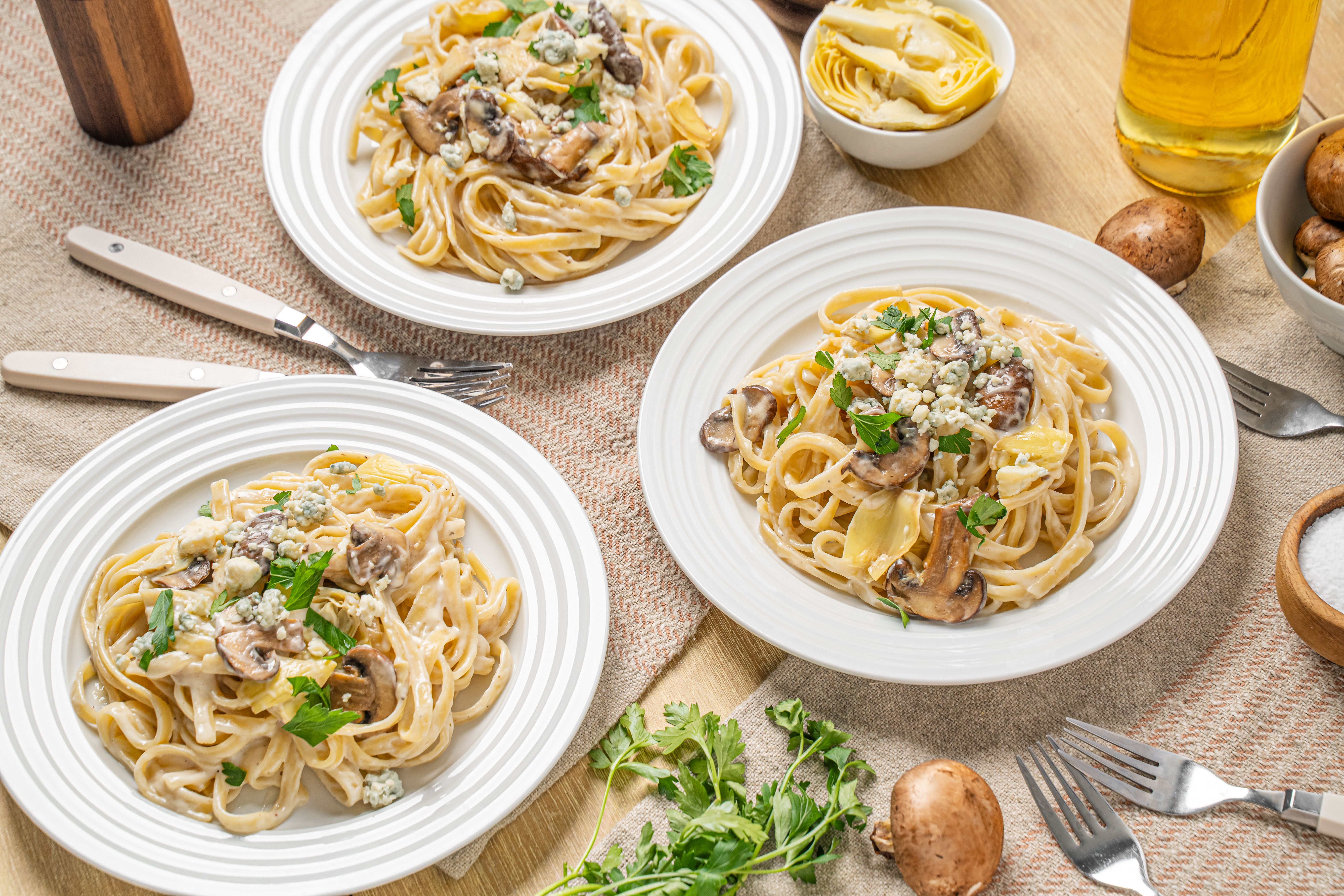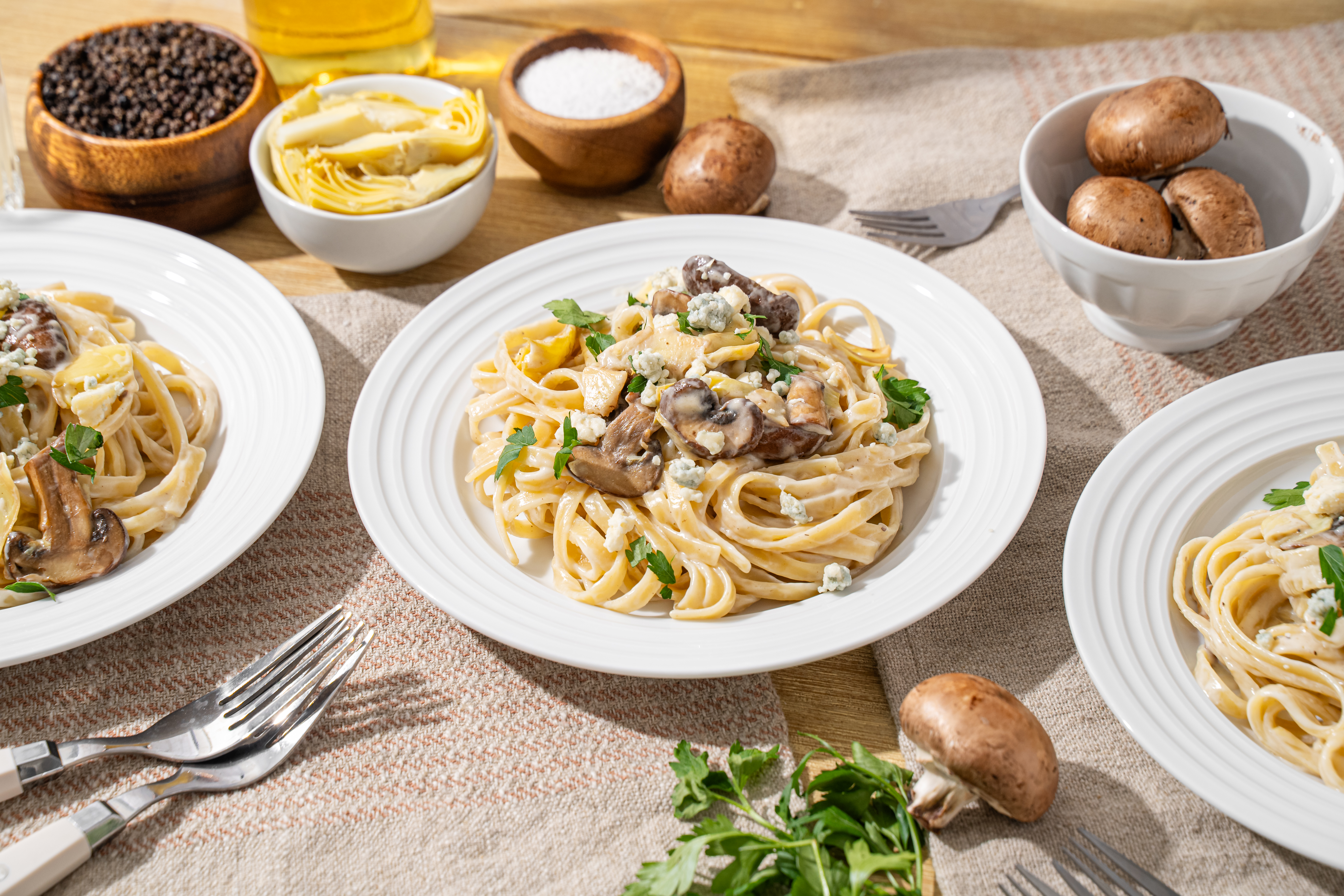 When that pasta craving hits, this is a truly must-have, beautiful creation! Creamy Artichoke Fettuccine is the perfect blend of crisp vegetables, a creamy sauce, and all-around hearty goodness. Tender fettuccine noodles are enveloped in a rich Alfredo sauce, alongside beefy mushrooms and tangy artichoke hearts for a refreshing change of pace. Sprinkled with bold crumbled blue cheese, Creamy Artichoke Fettuccine is a quick but delicious meal any night of the week!
