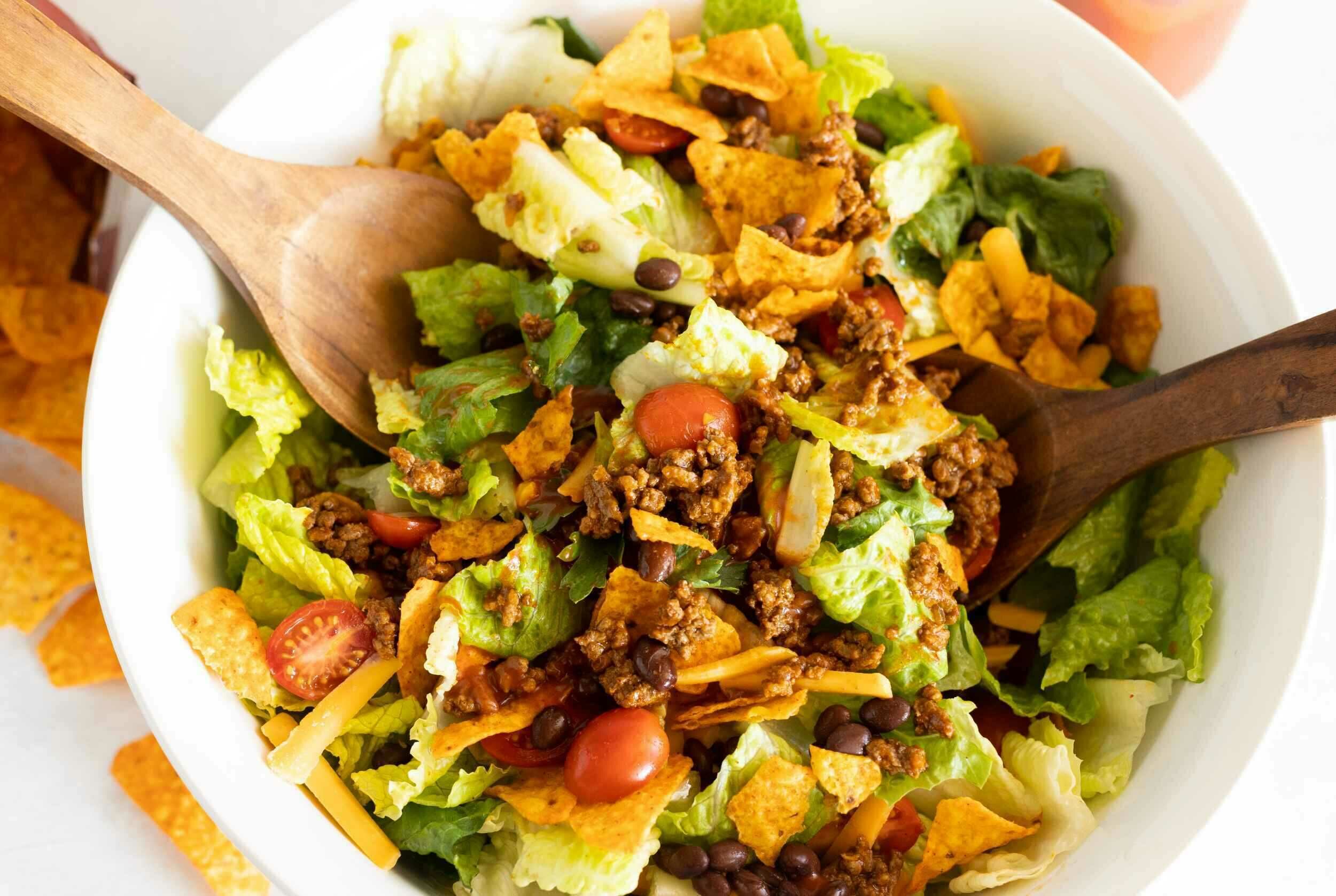 Crunchy Nacho Taco Salad is here with one goal: ensure you never eat a boring salad again. To fulfill this filling mission, it combines the fresh crispness of lettuce and the juicy brightness of tomato with savory, spicy taco meat and crunchy nacho cheese tortilla chips; they certainly put croutons to shame! Crunchy Nacho Taco Salad is so speedy to put together that you'll never reach for the caesar mix again. It brings the best of Tex-Mex snack time to your salad course.