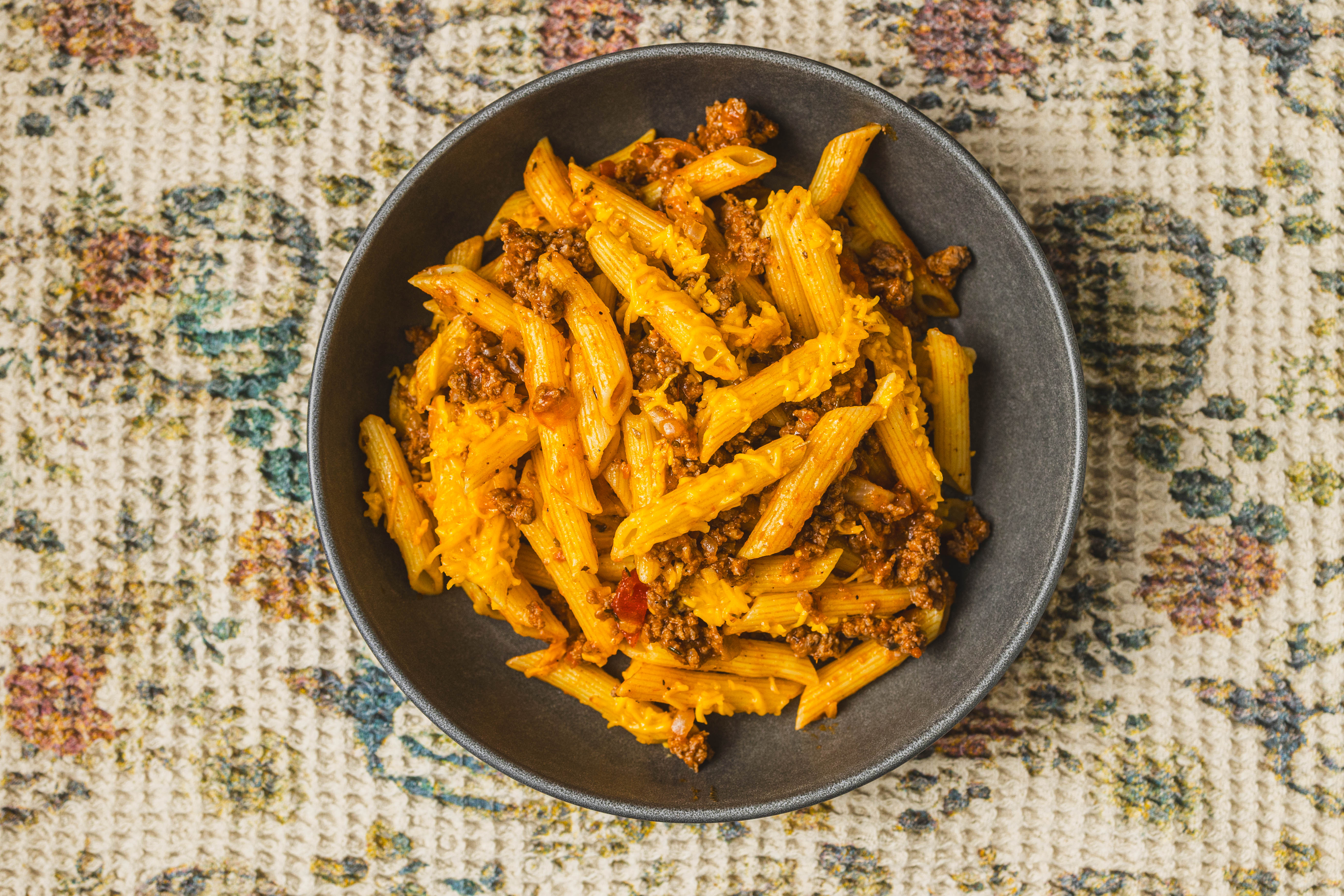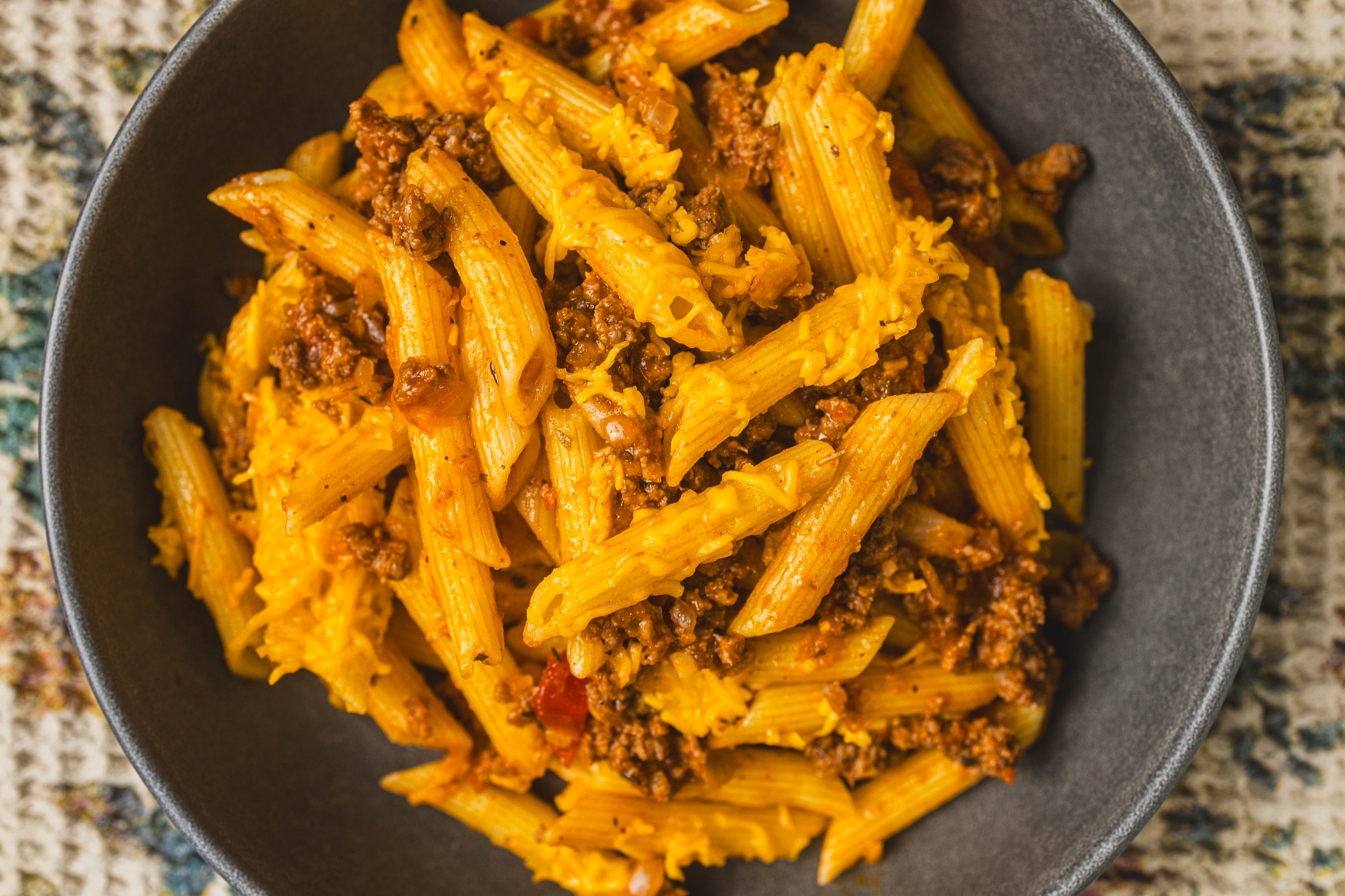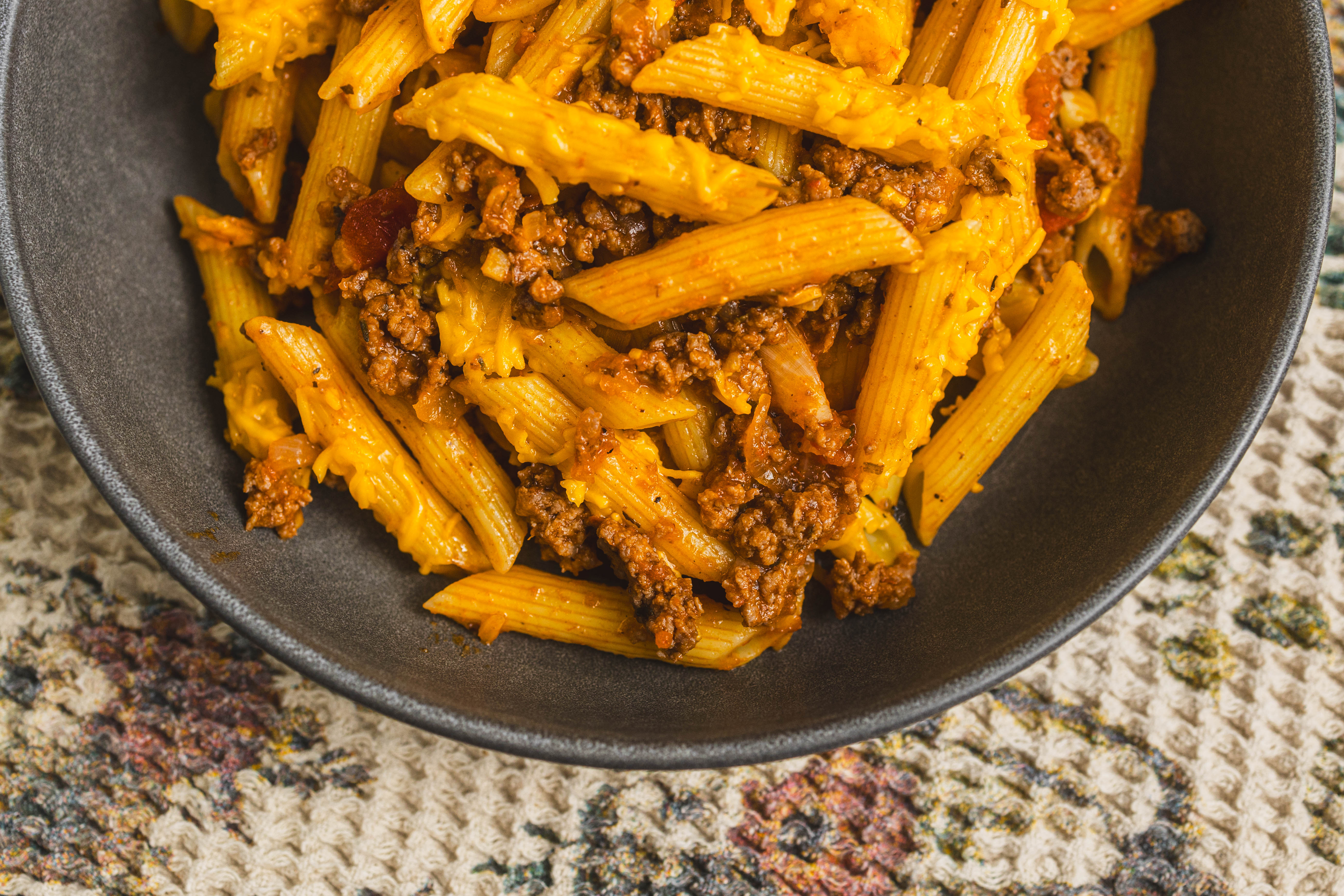 Step 9 -Evenly pour the meat sauce over the cooked penne and toss to combine.