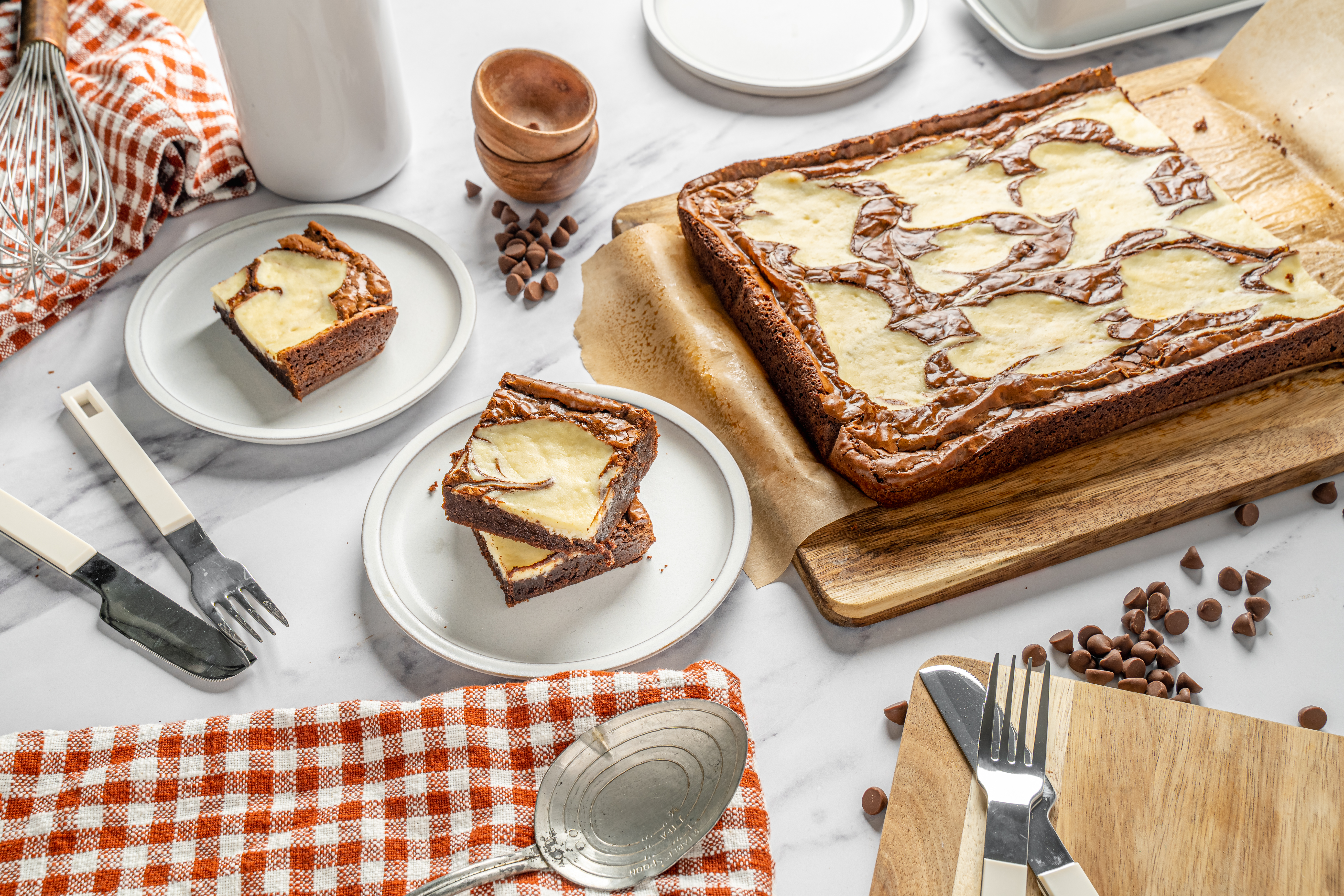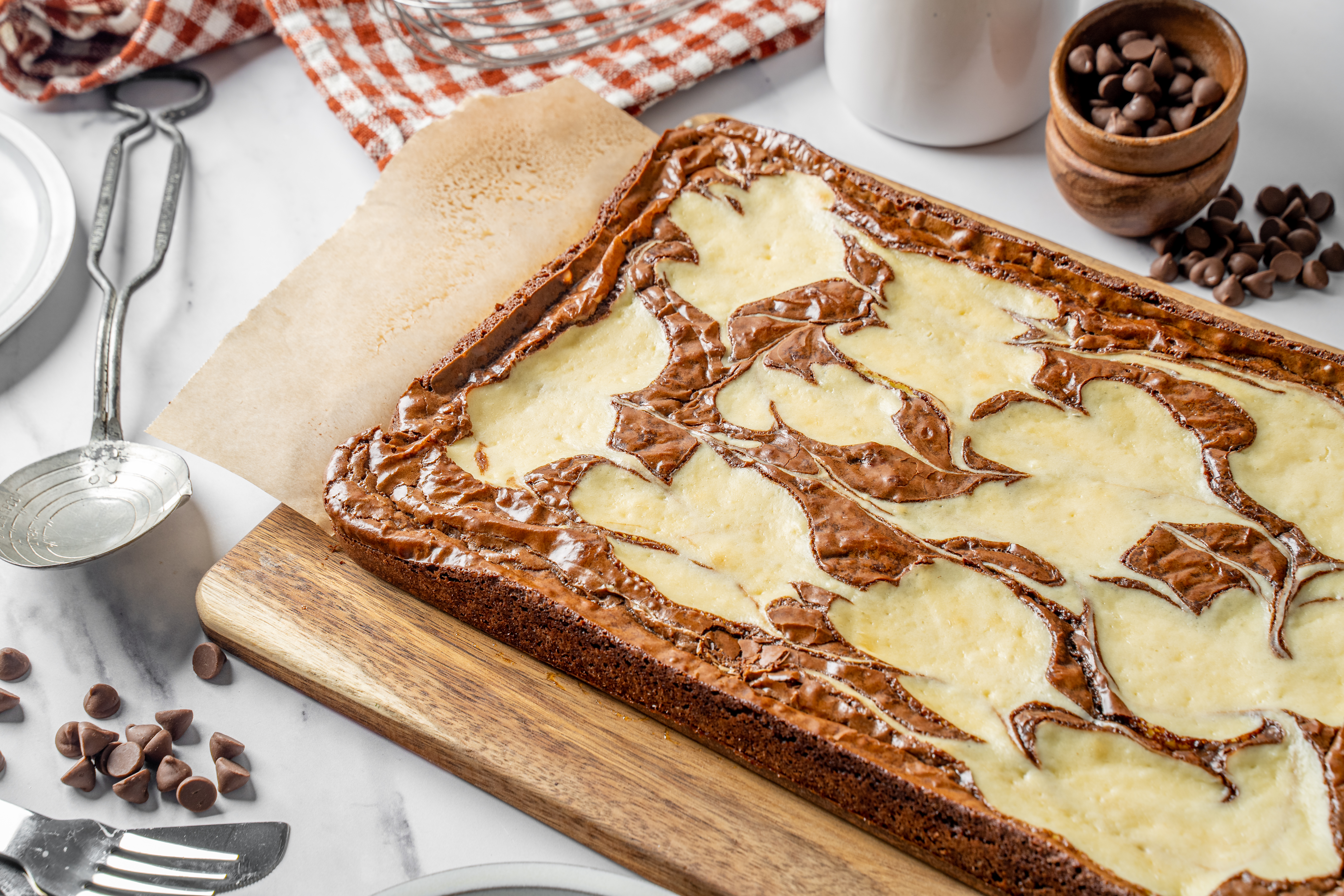 Step 14 -Using a knife, draw swirls across the surface of the cream cheese by running the tip of the knife about 1/2-inch-deep into the brownie batter as you move it around.
