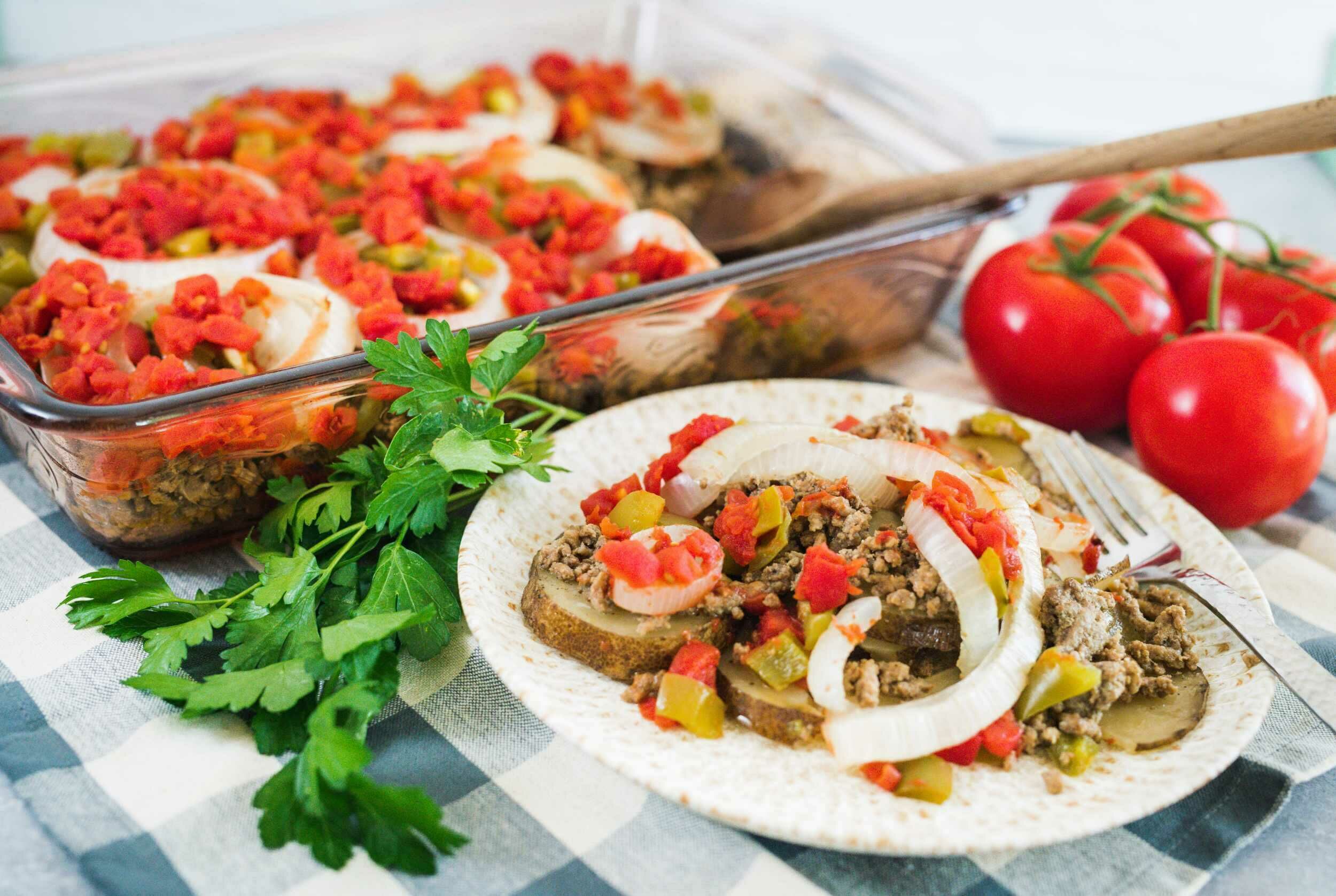 Step 6 -Layer the cooked ground beef, onions, tomatoes, and bell peppers on top of the potatoes, seasoning with salt and pepper between each layer.