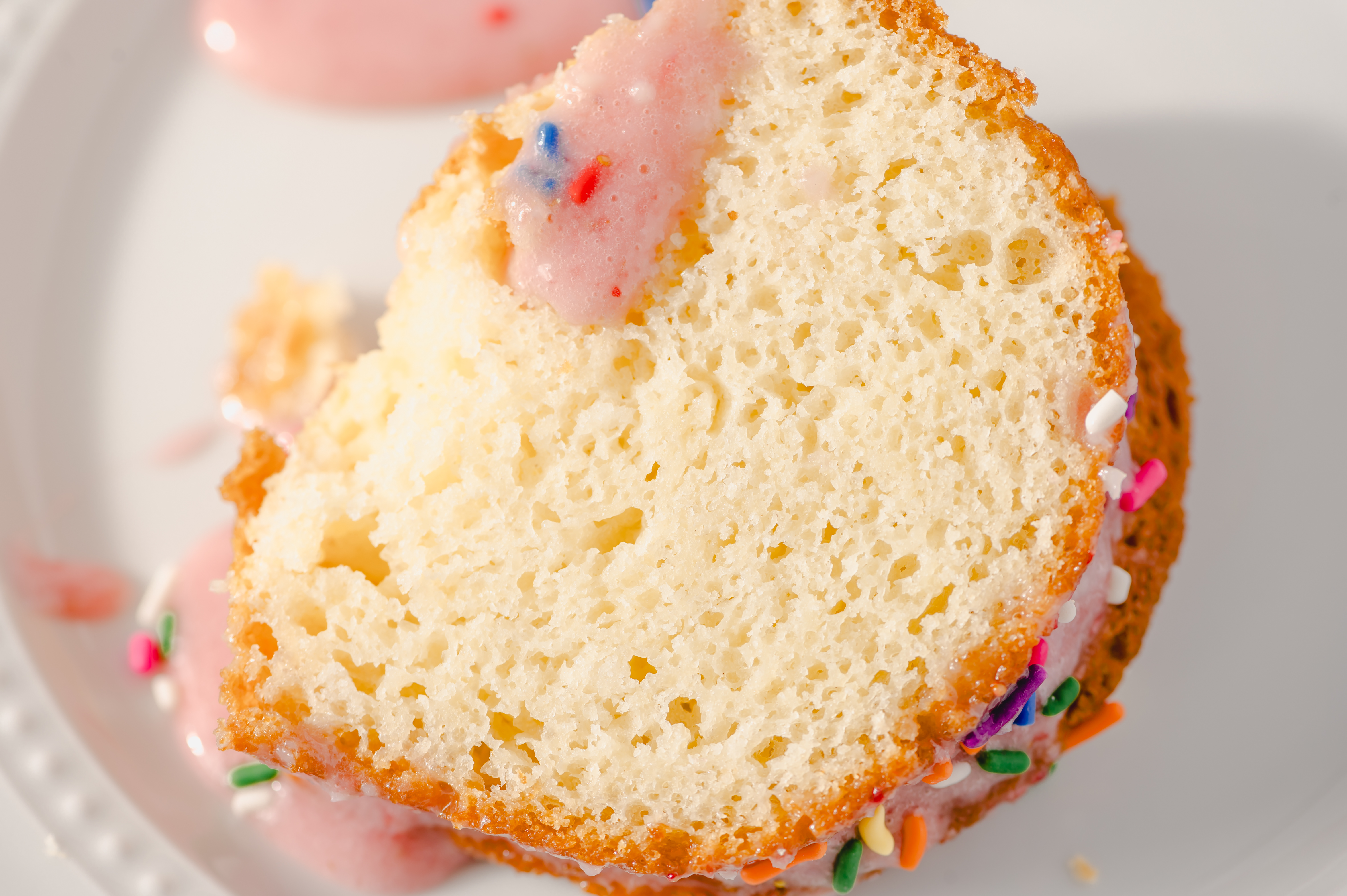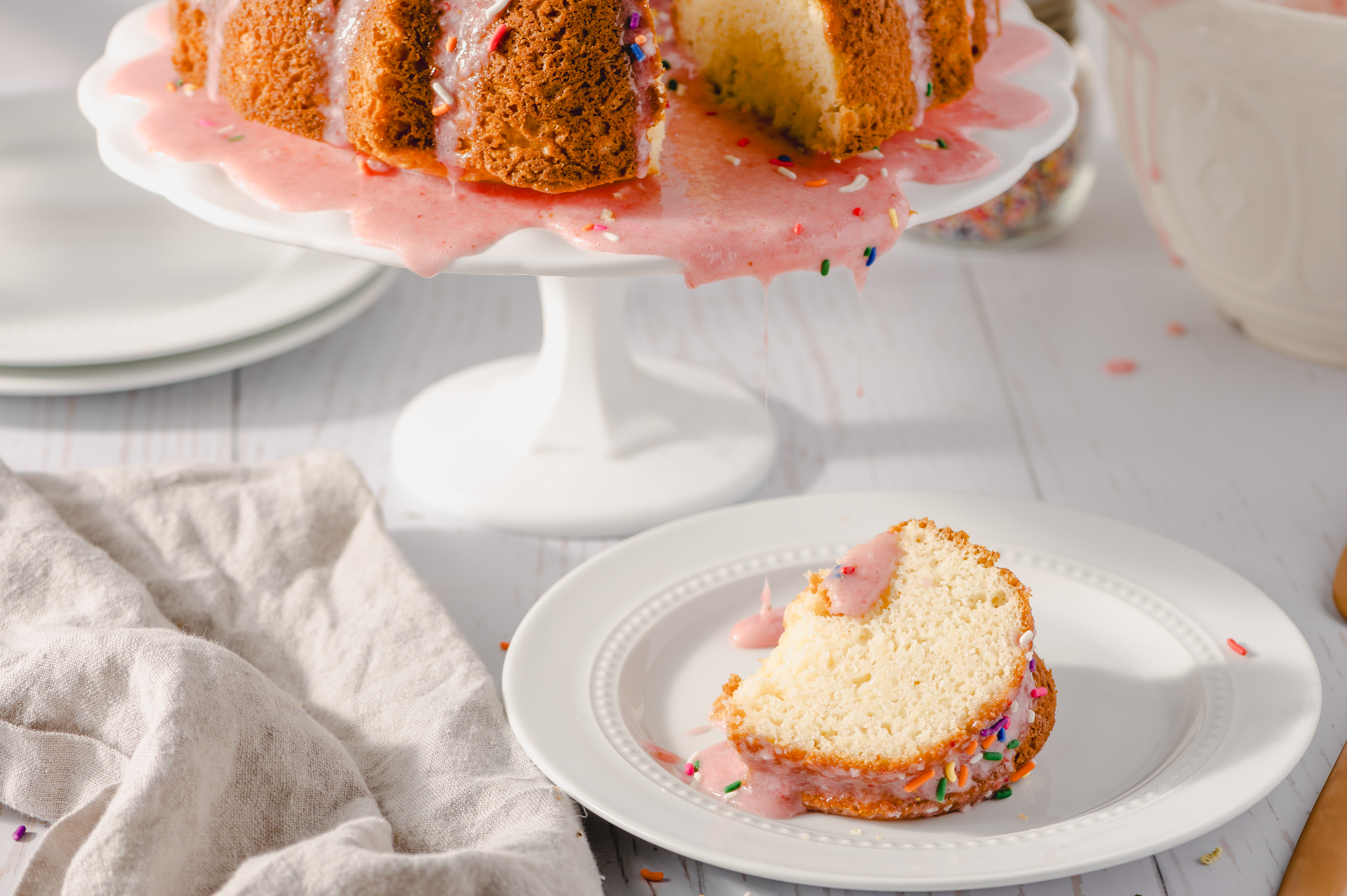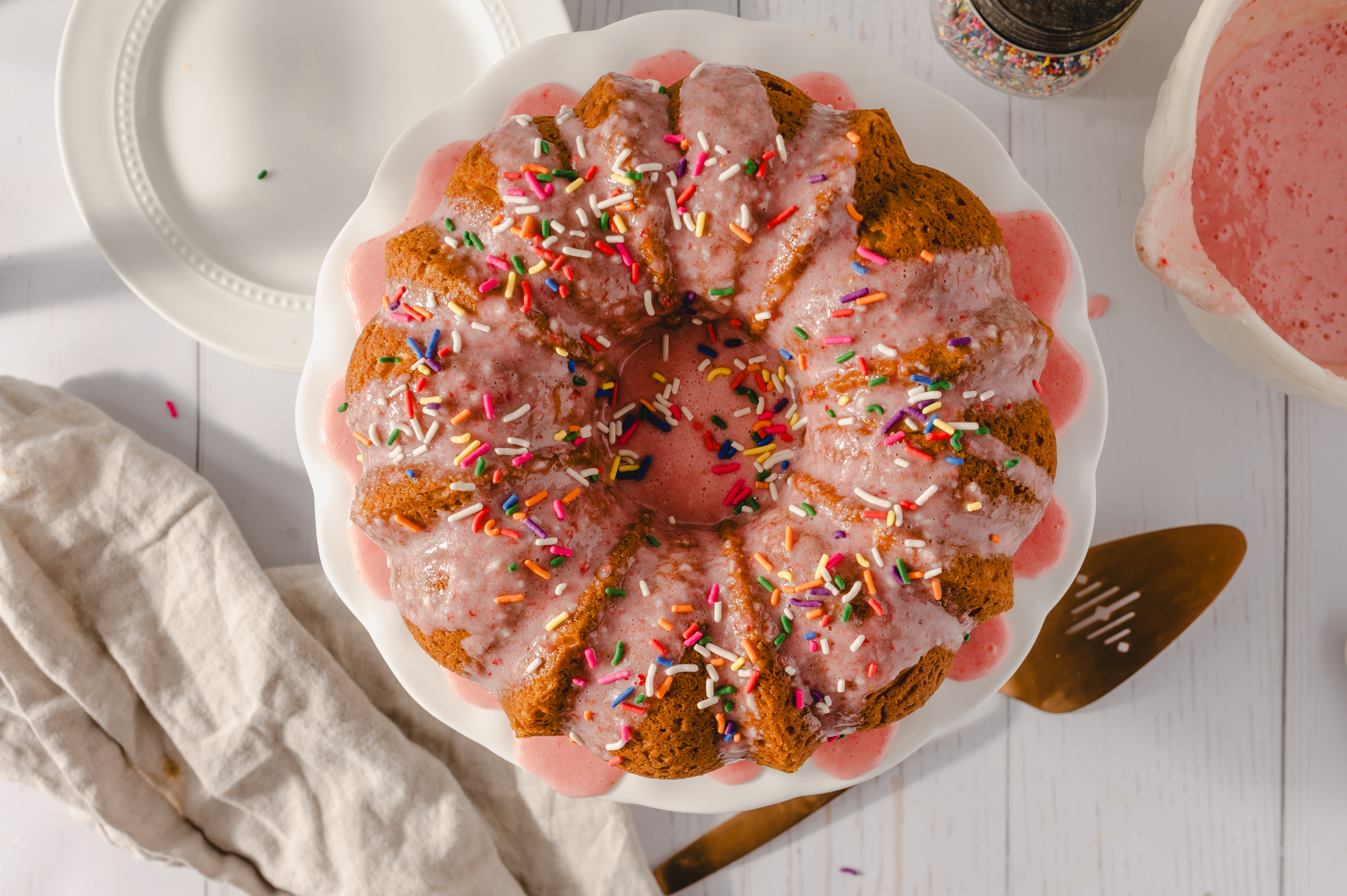 The Donut Cake takes the classic donut you think of when you hear the word and makes it into a cake! It still has that bright pink strawberry frosting and the sprinkles (have to have sprinkles, right?) and it even has the donut shape! But it's a tender, buttery vanilla cake! If you're having coffee with friends and family, the Donut Cake is the dessert you want to serve!