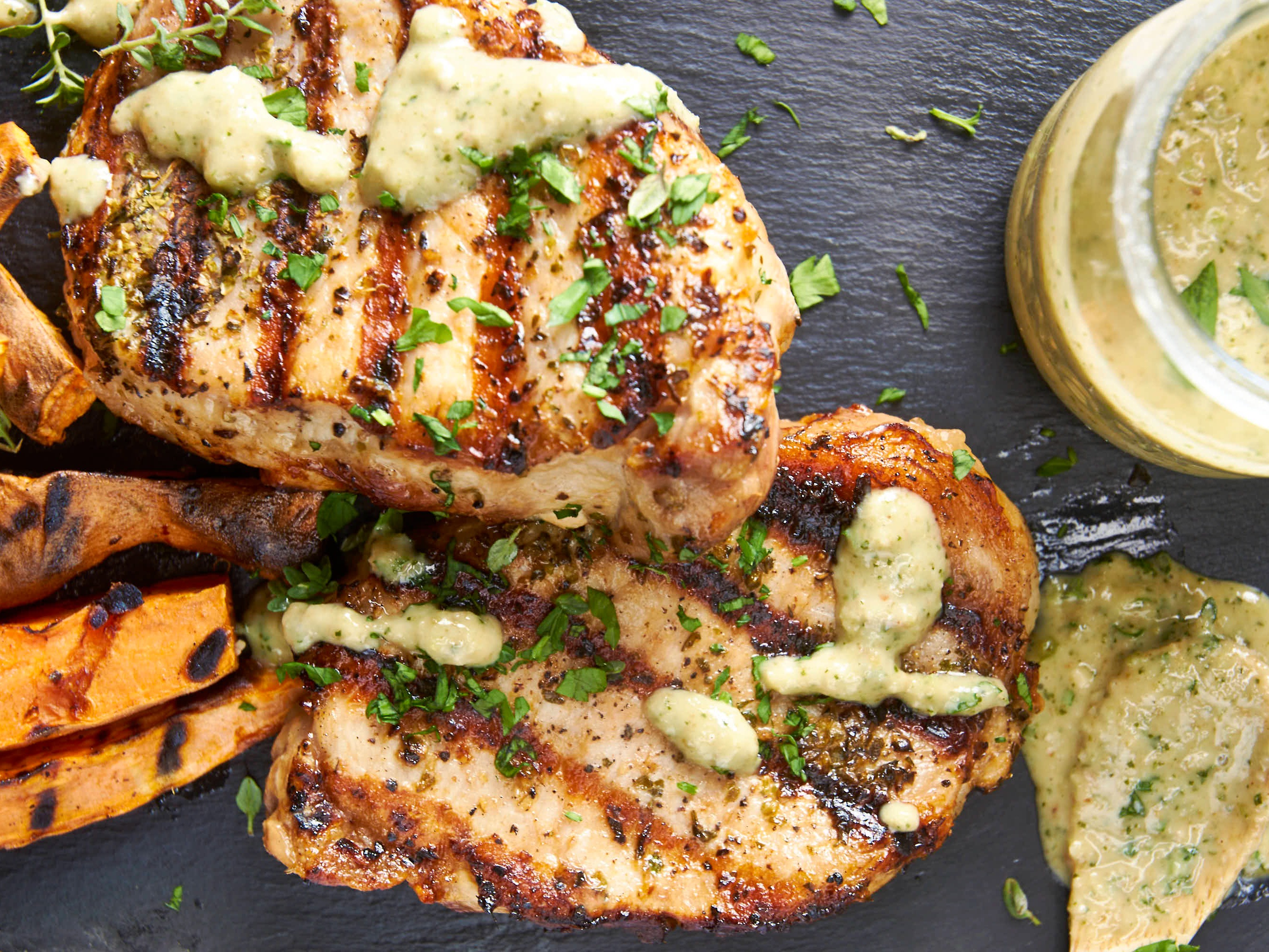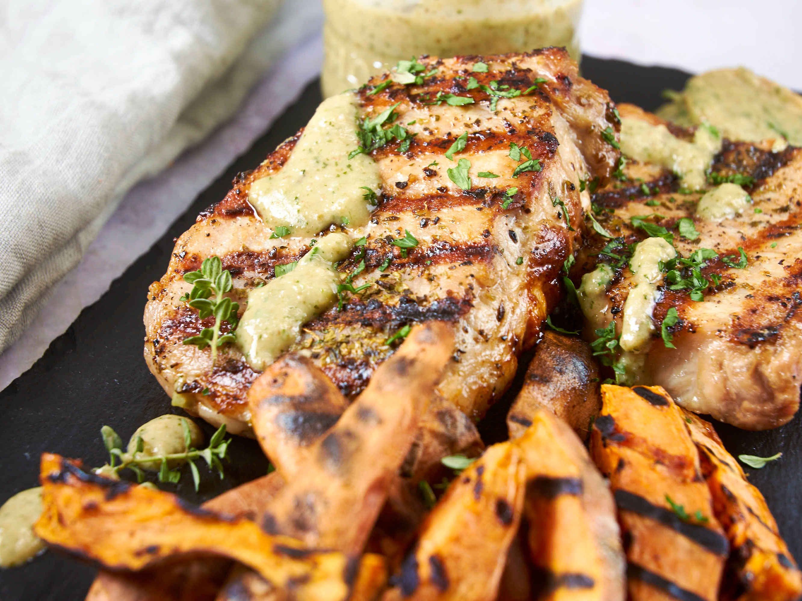 Fabulous Fall Pork pairs juicy pork chops with tender sweet potato wedges, creating a delightful balance of savory and sweet flavors emerging straight from your grill! A fresh walnut salsa verde made with fragrant and cool mint, aromatic garlic, and salty capers adds a zesty twist, making this dish perfect for any autumn gathering. A hearty, seasonal celebration on a plate, Fabulous Fall Pork brings together the best of the season's flavors for a meal that's sure to impress your guests and your tastebuds. It's simply fabulous!