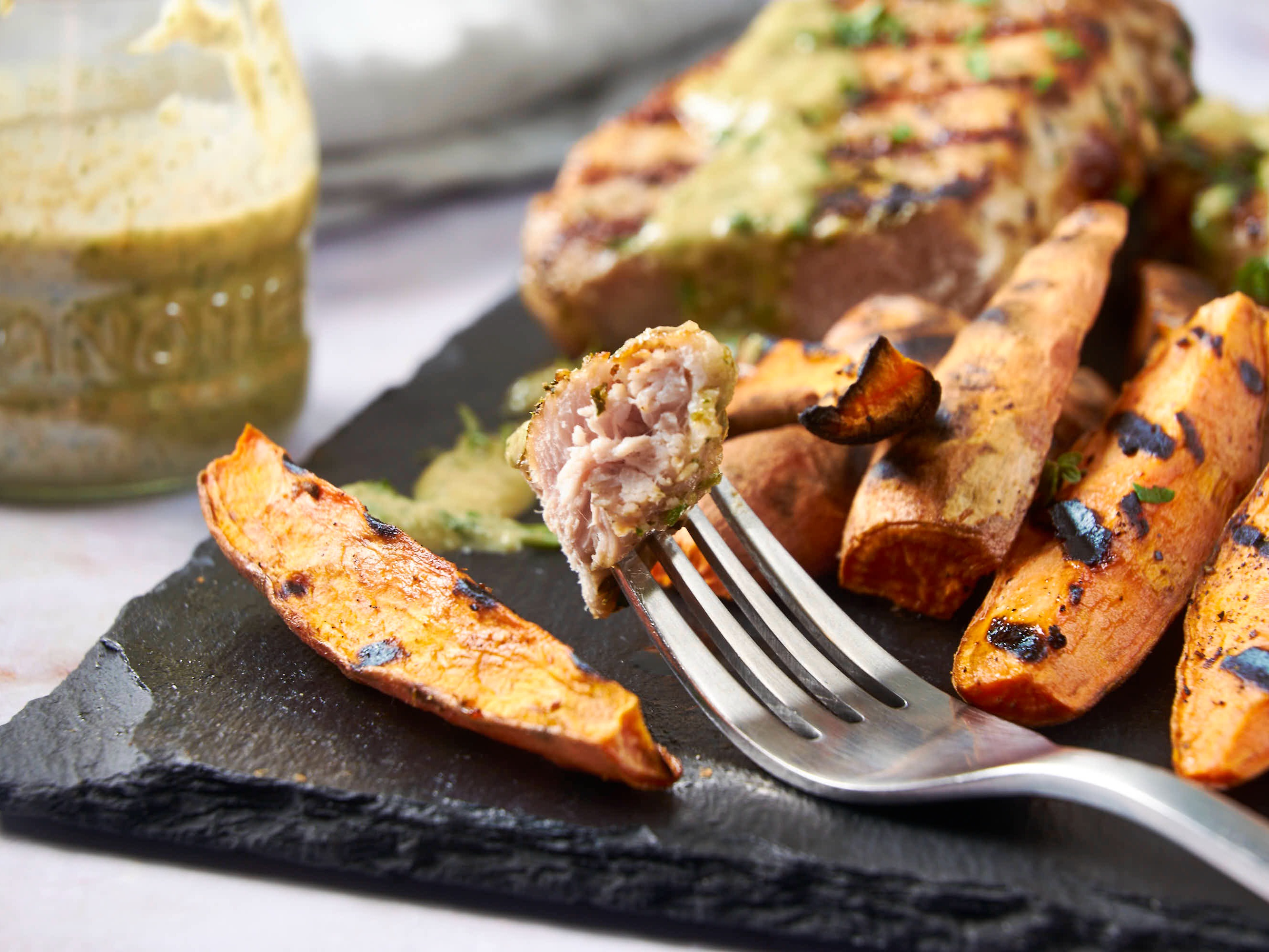 Step 8 -Serve the pork and the sweet potato wedges topped with the salsa verde.