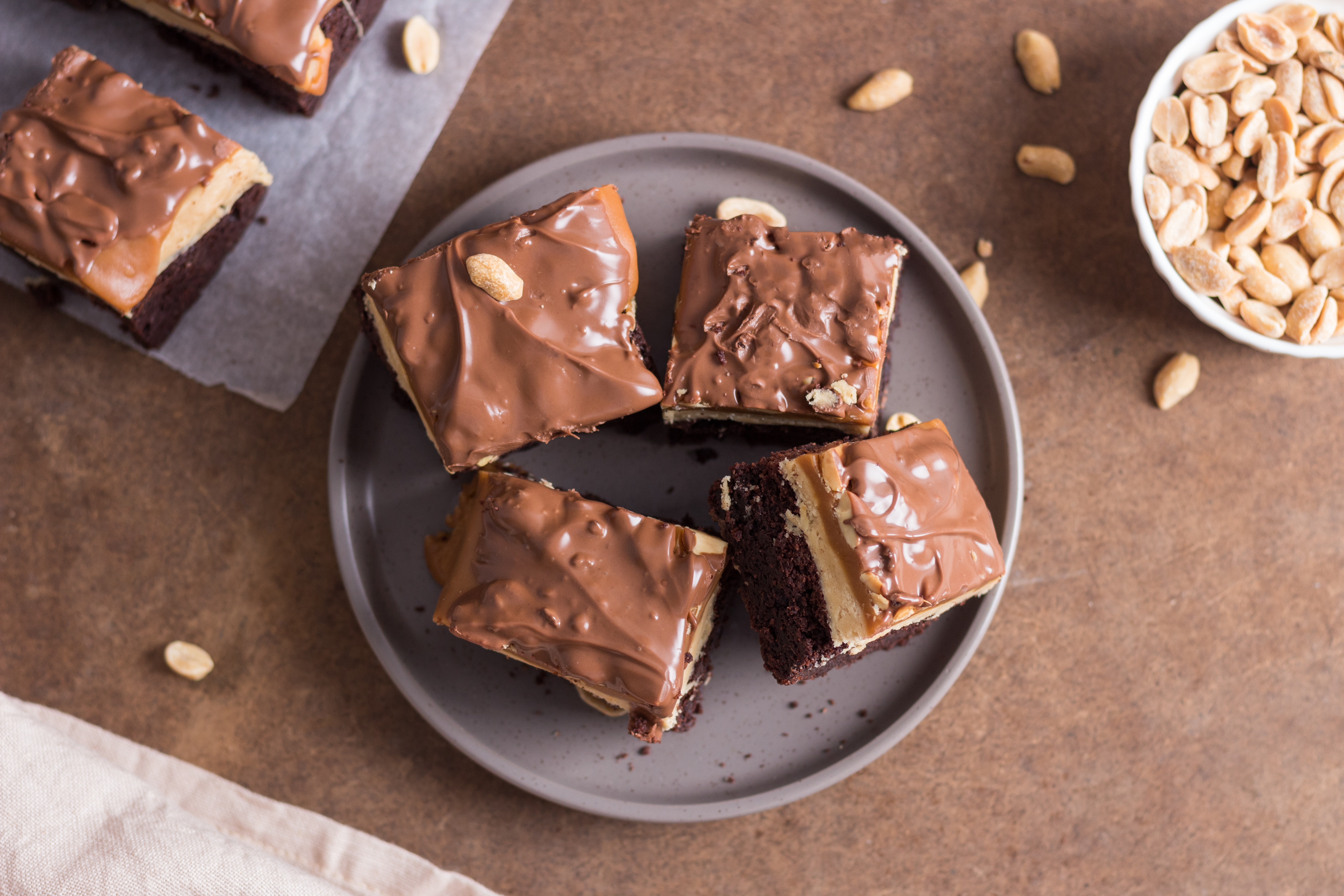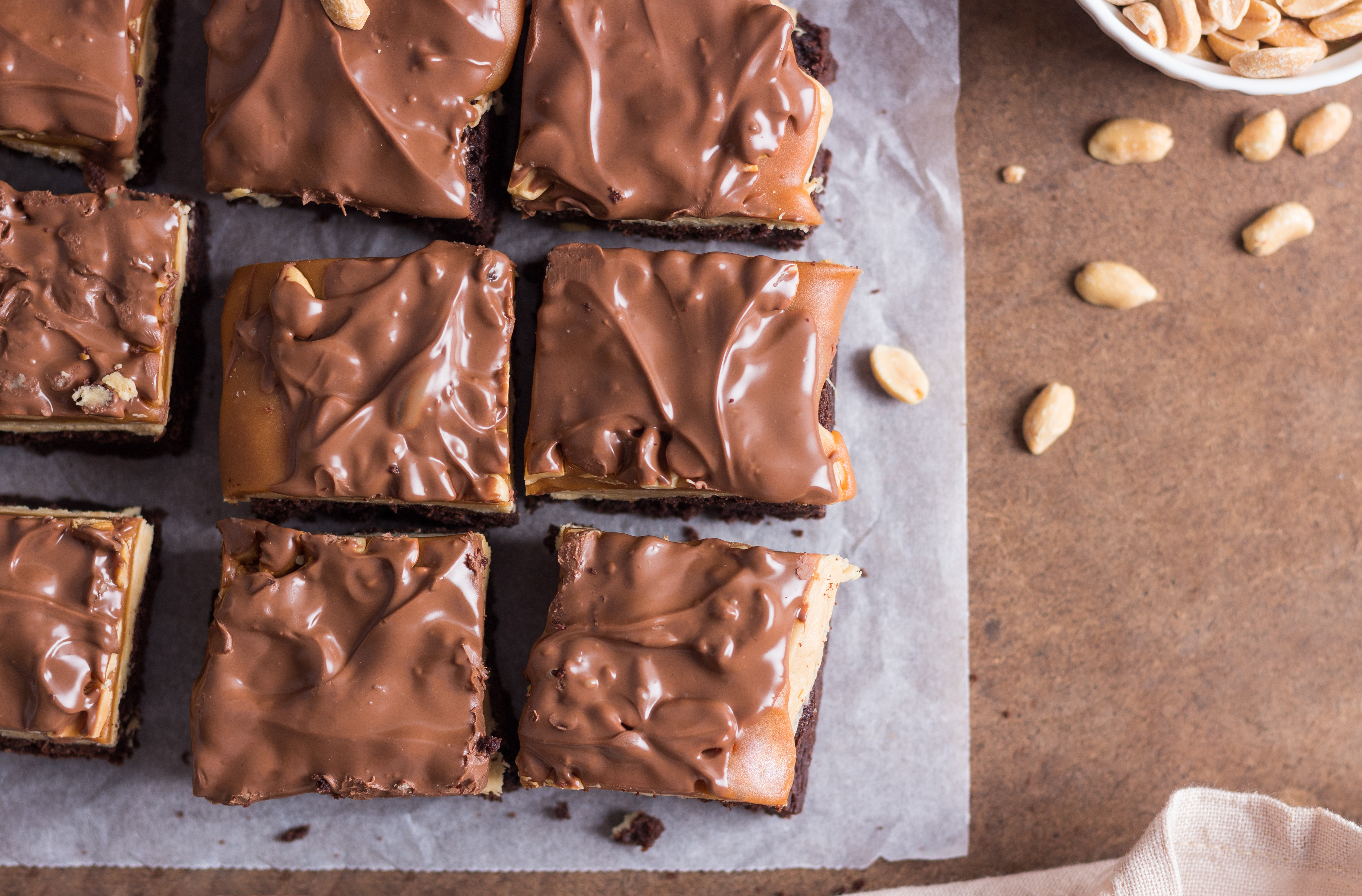 Step 11 -Pour the caramel mixture over the marshmallow-peanut butter layer and immediately top with the peanuts, pressing the peanuts into the caramel slightly.