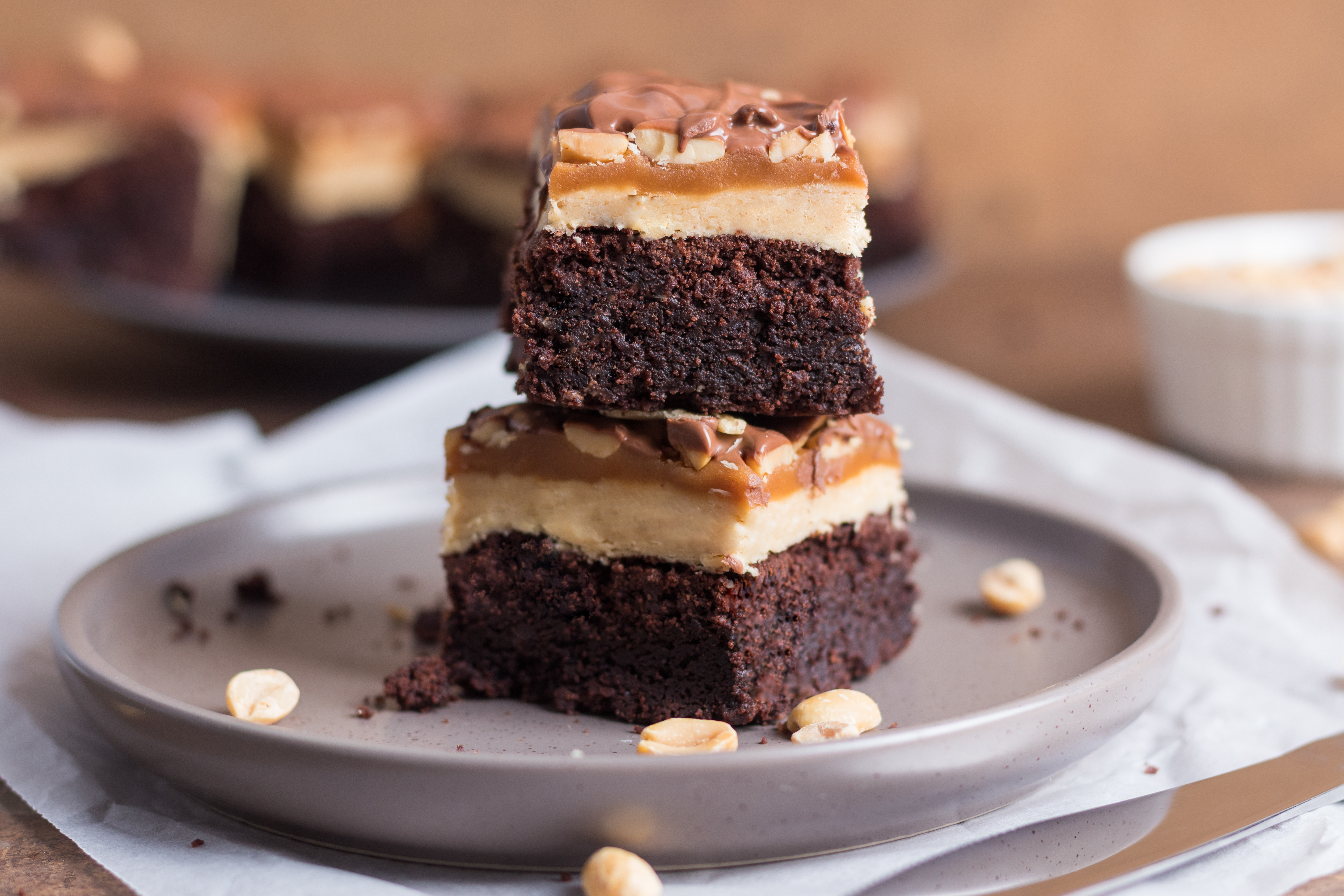 Oh, there is a lot going on with Giggle Bites and the flavor will have you giggling with delight! A fudgy brownie base holds up quite a lot of amazing treats: a fluffy, creamy peanut butter layer, crunchy peanuts, rich and salty caramel, and melted chocolate! And that's all in each bite! No wonder Giggle Bites are so delightfully merry, they inspire great feelings whenever they are served!