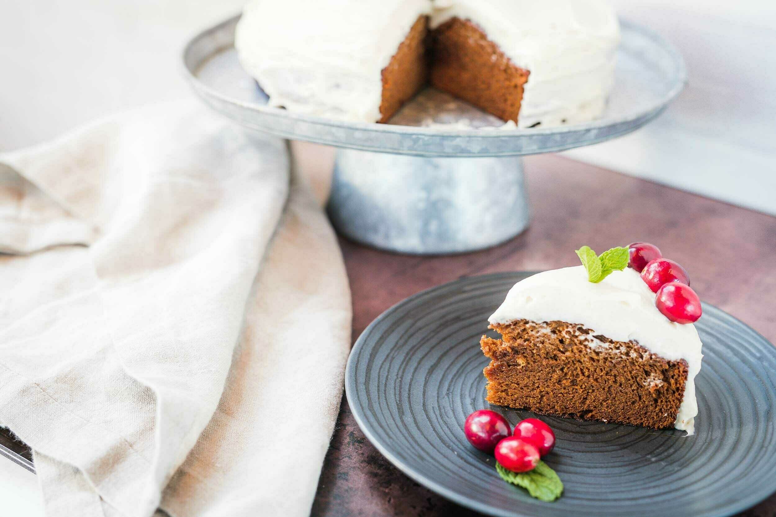 Gingerbread has been popular for literally centuries, even having its own festivals during the Middle Ages. Now, it just isn't Christmas time without a taste of that sweet and spicy flavor. Gingerbread Cake with Cream Cheese Frosting combines the bold, warming flavors of gingerbread with a fluffy and sweet frosting. Every slice of Gingerbread Cake with Cream Cheese Frosting looks as festive as the season with its cranberry and mint decorations and it tastes just as joyous as the spirit of the holidays! Have your own gingerbread festival with this wonderful cake!