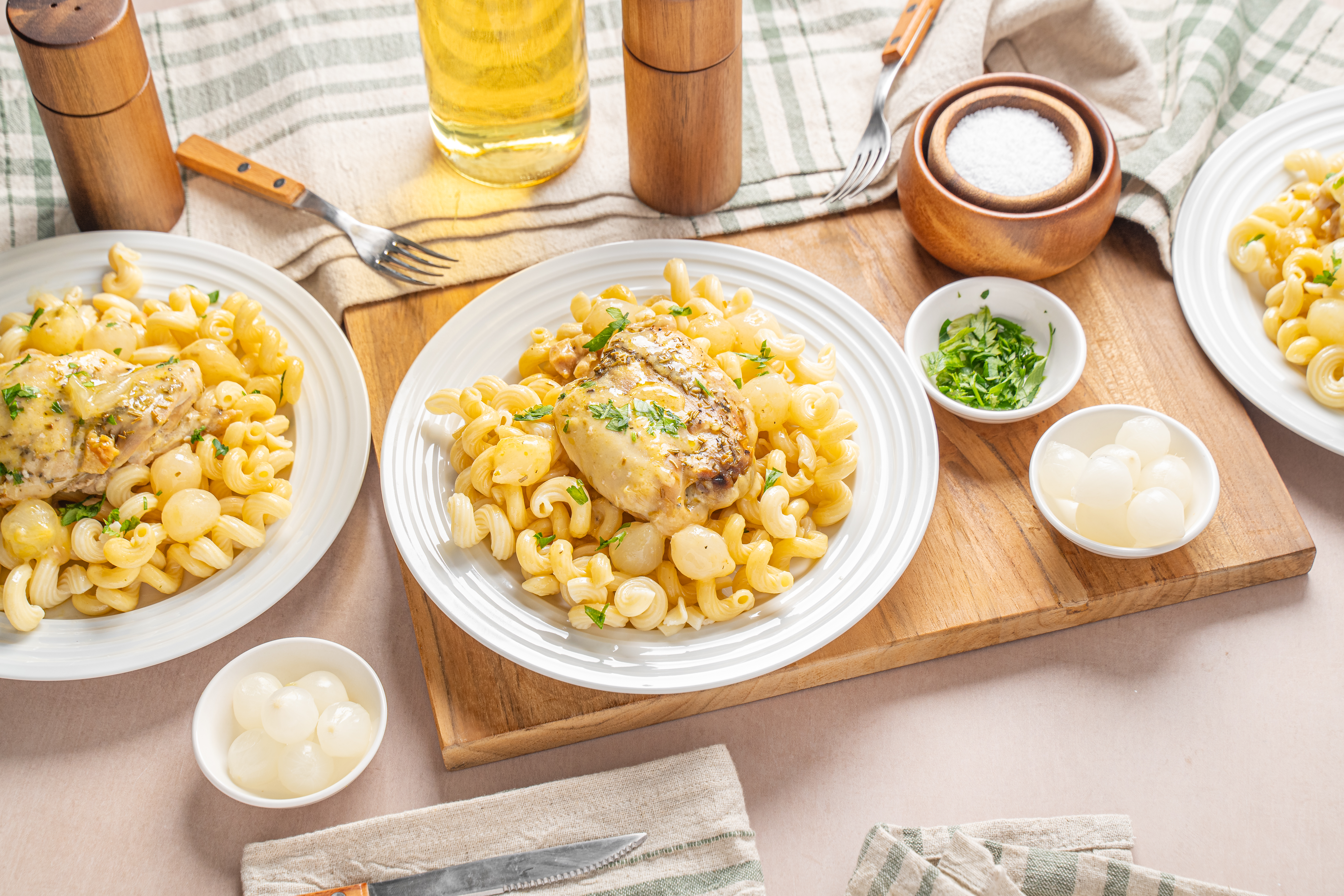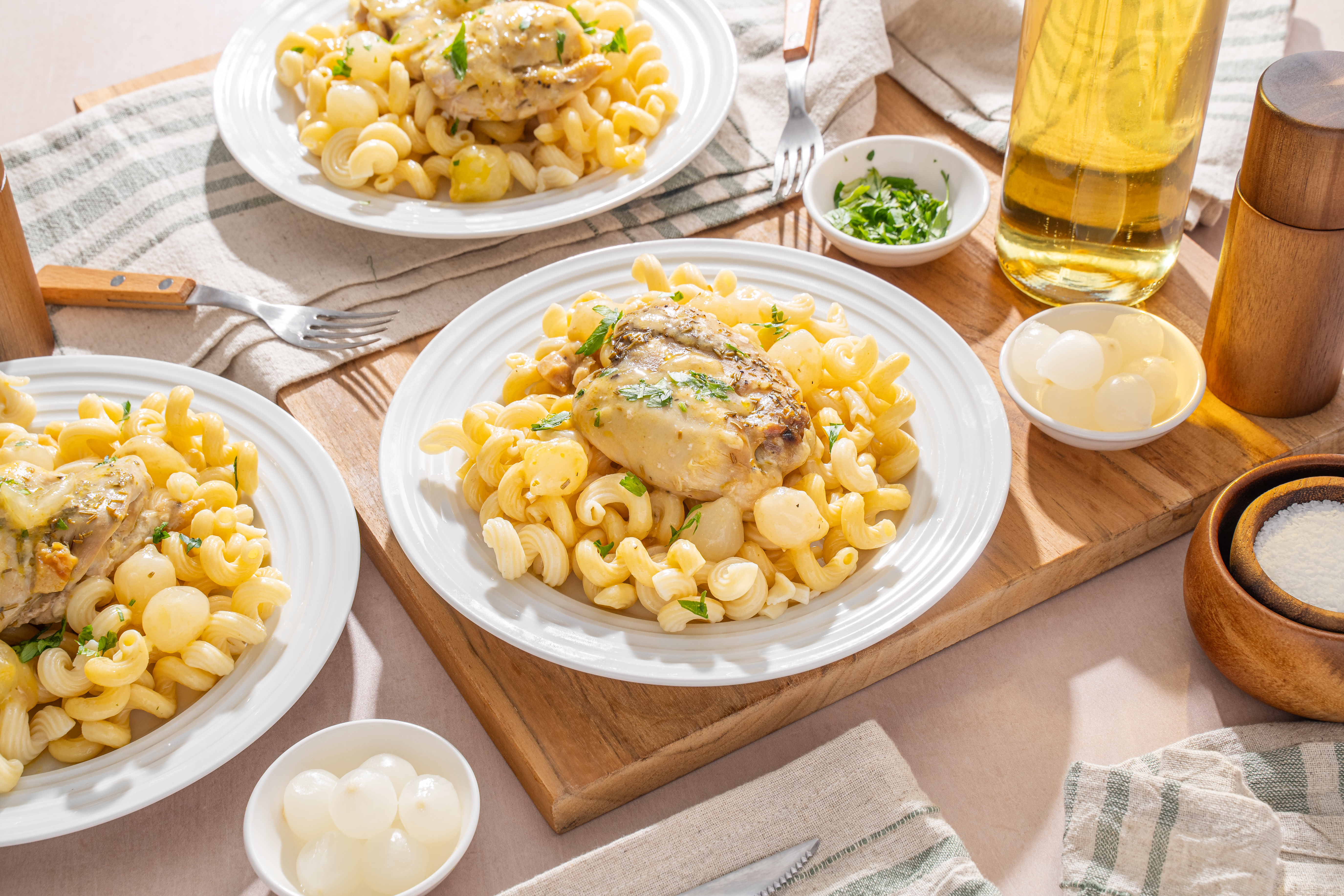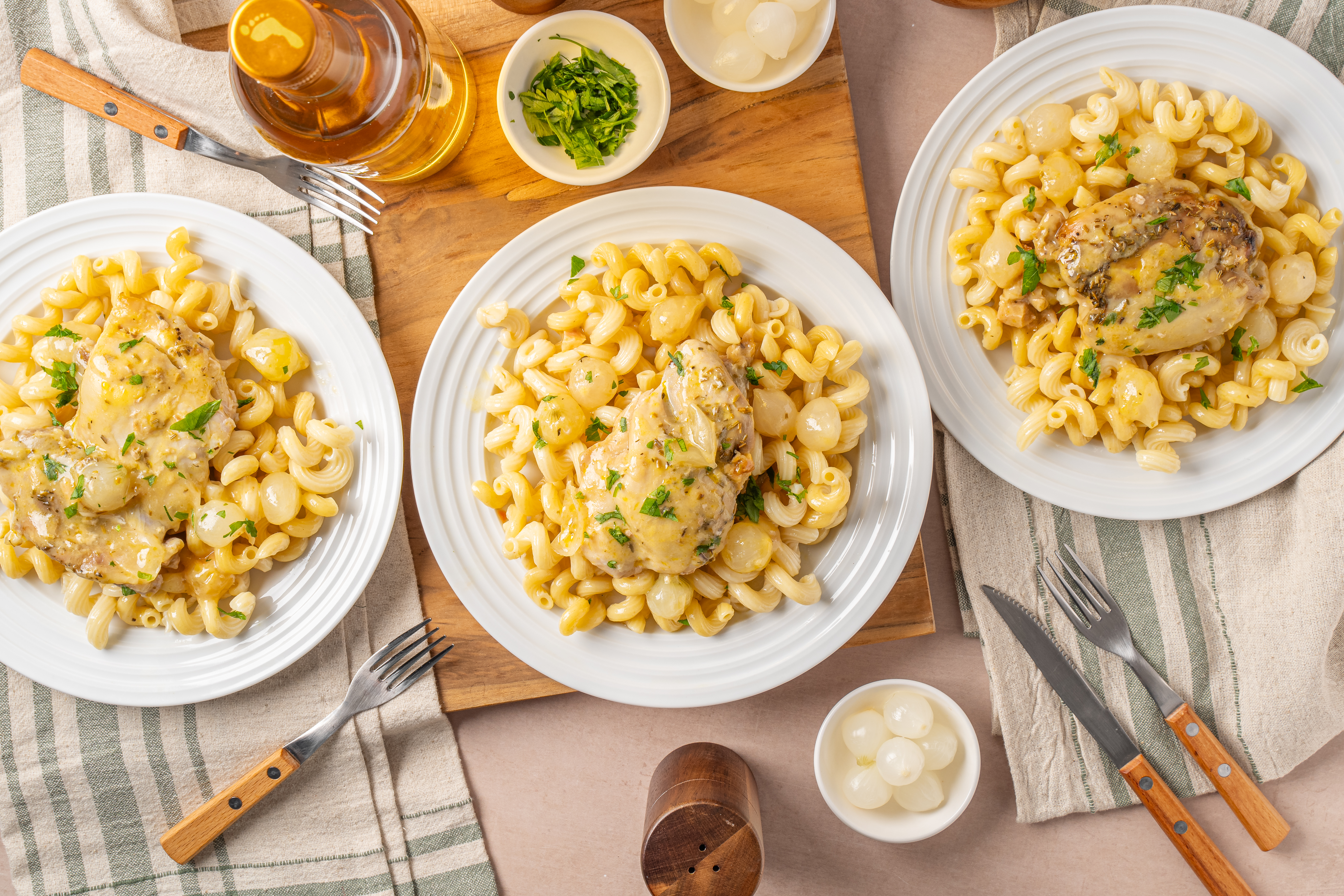 Step 7 -Serve the chicken and the cooking juices over the pasta, garnished with the extra parsley.