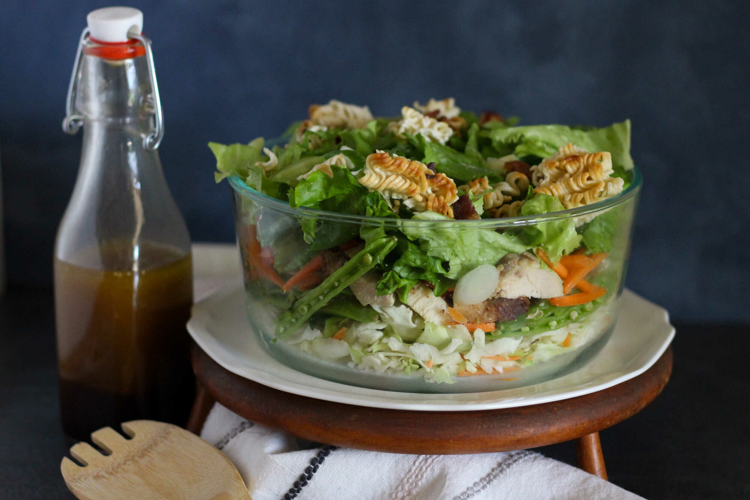 Step 11 -Layer the coleslaw mixture, the peas, the chicken, the carrots, the salad greens, the noodles, and the green onions in an 8-10-quart dish.