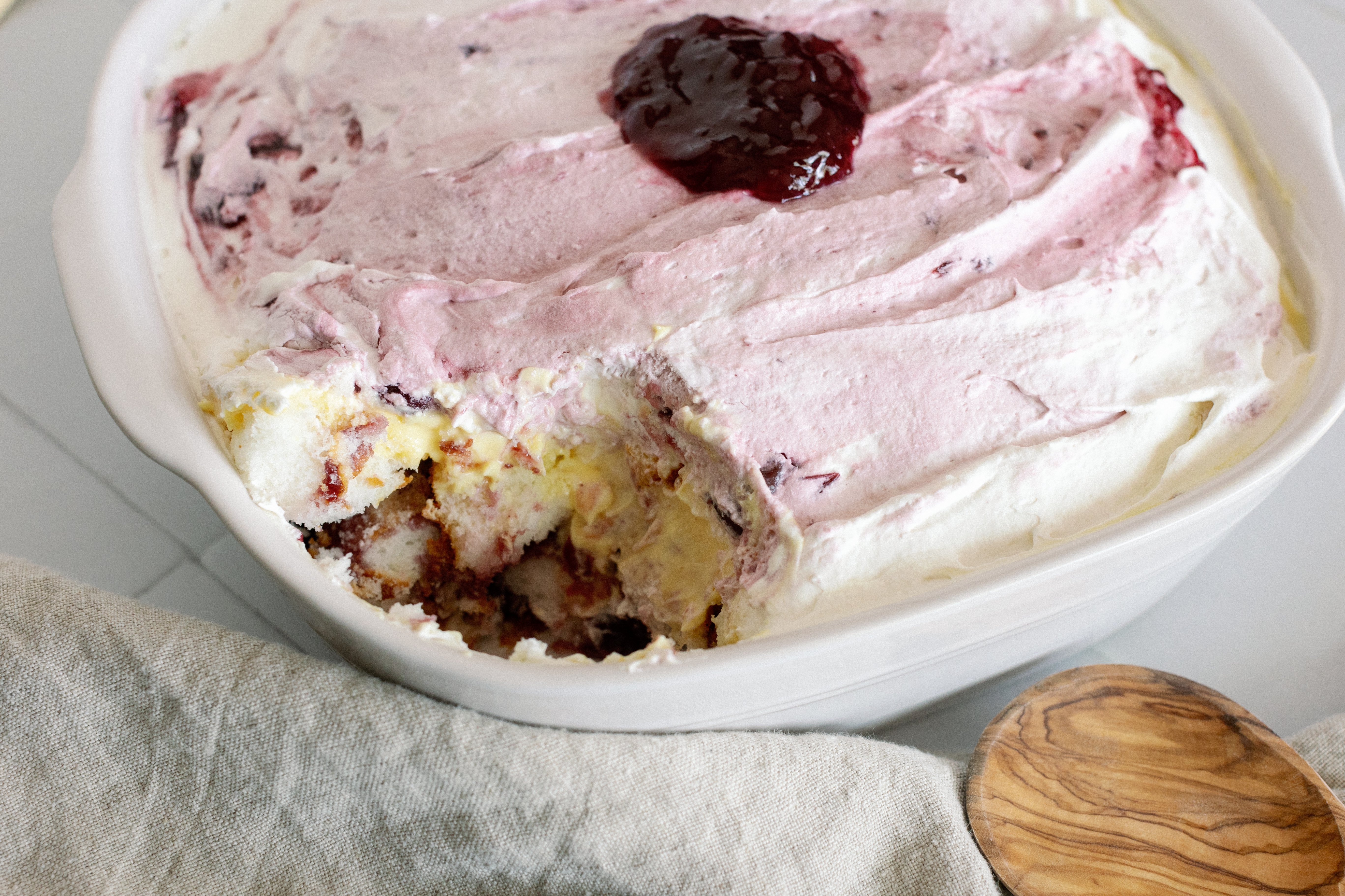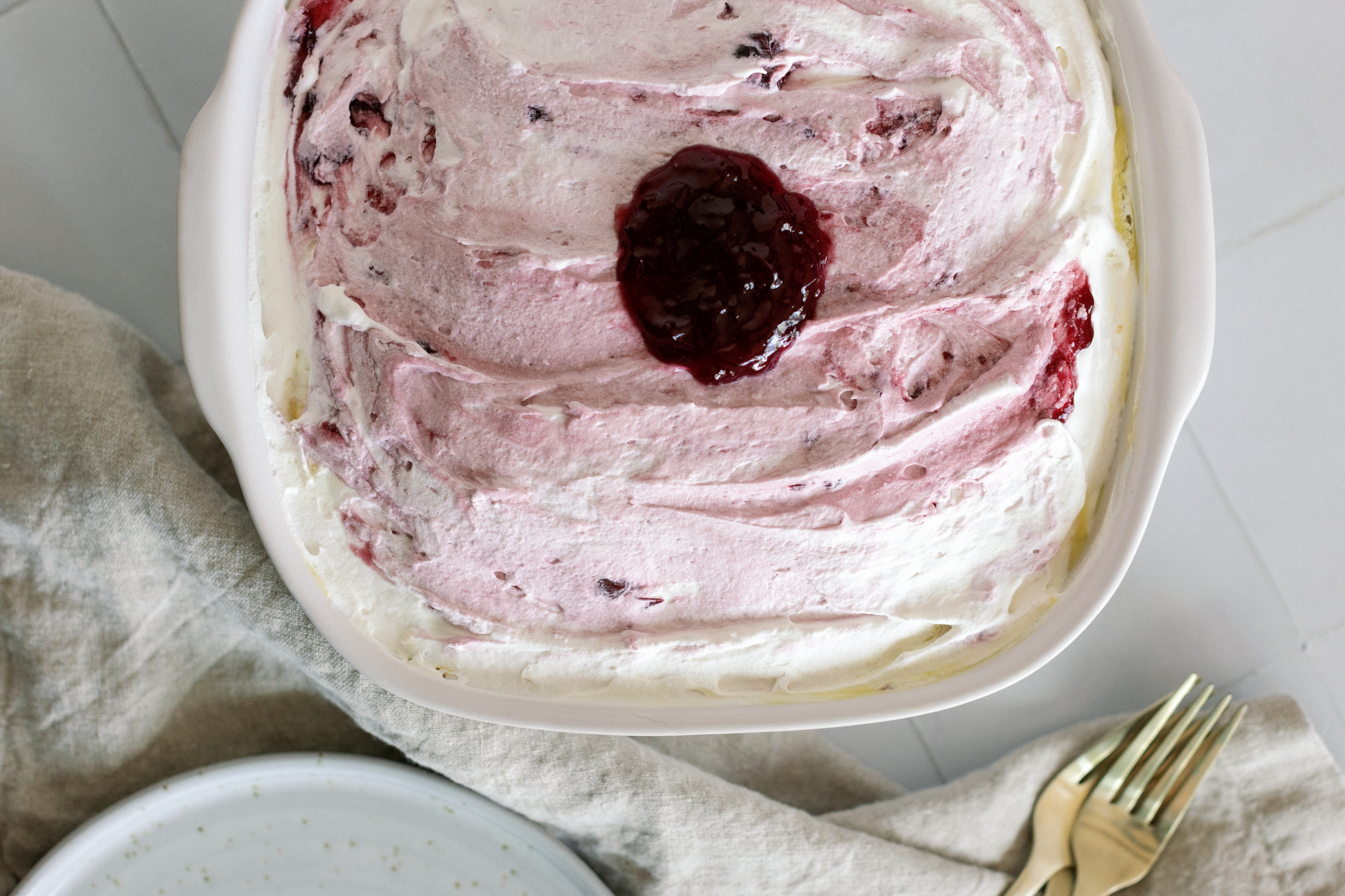 Step 8 -Spread the remaining cherry pie filling over the top of the whipped topping or center it on the cake for some decorative flair.
