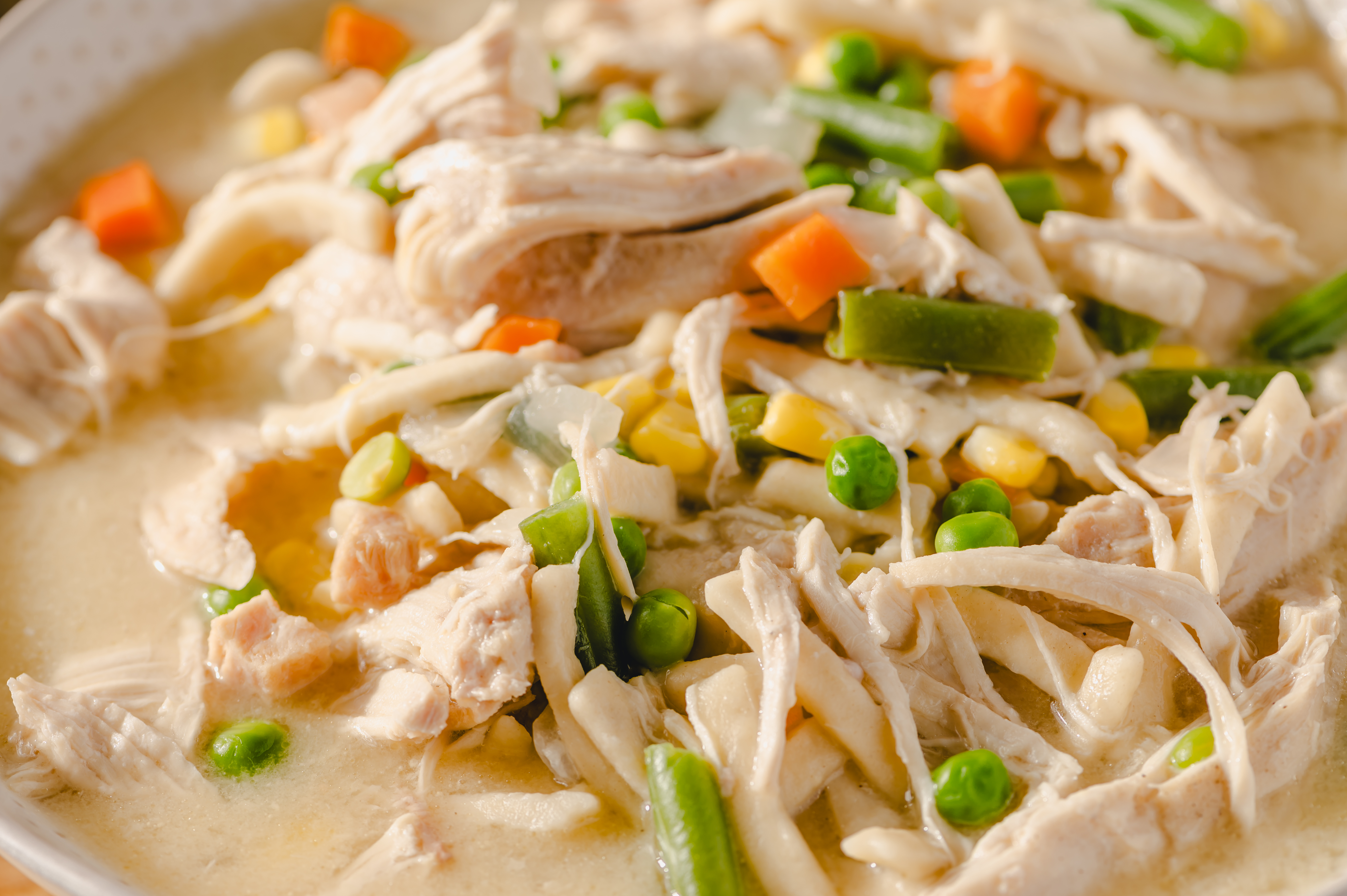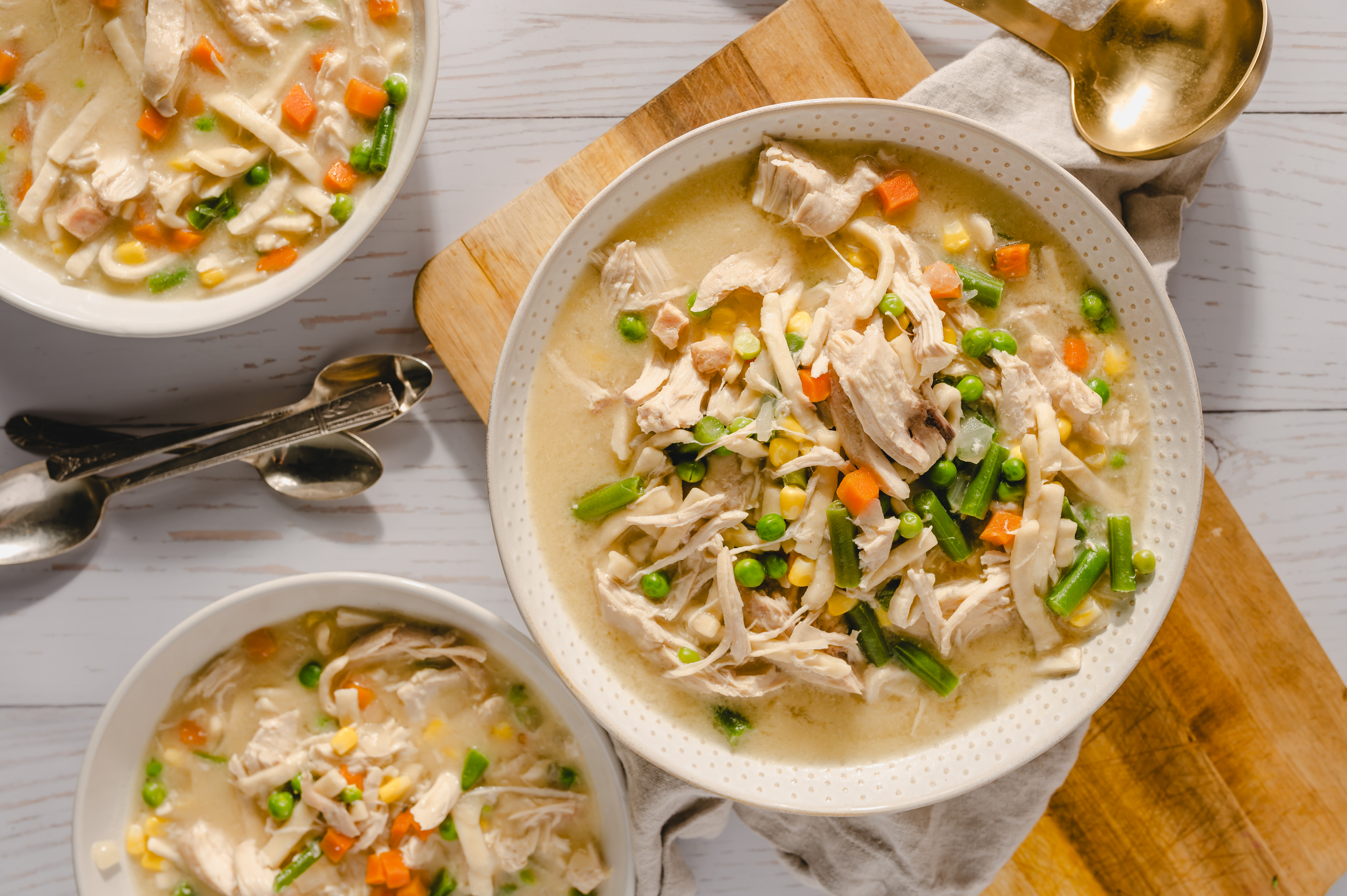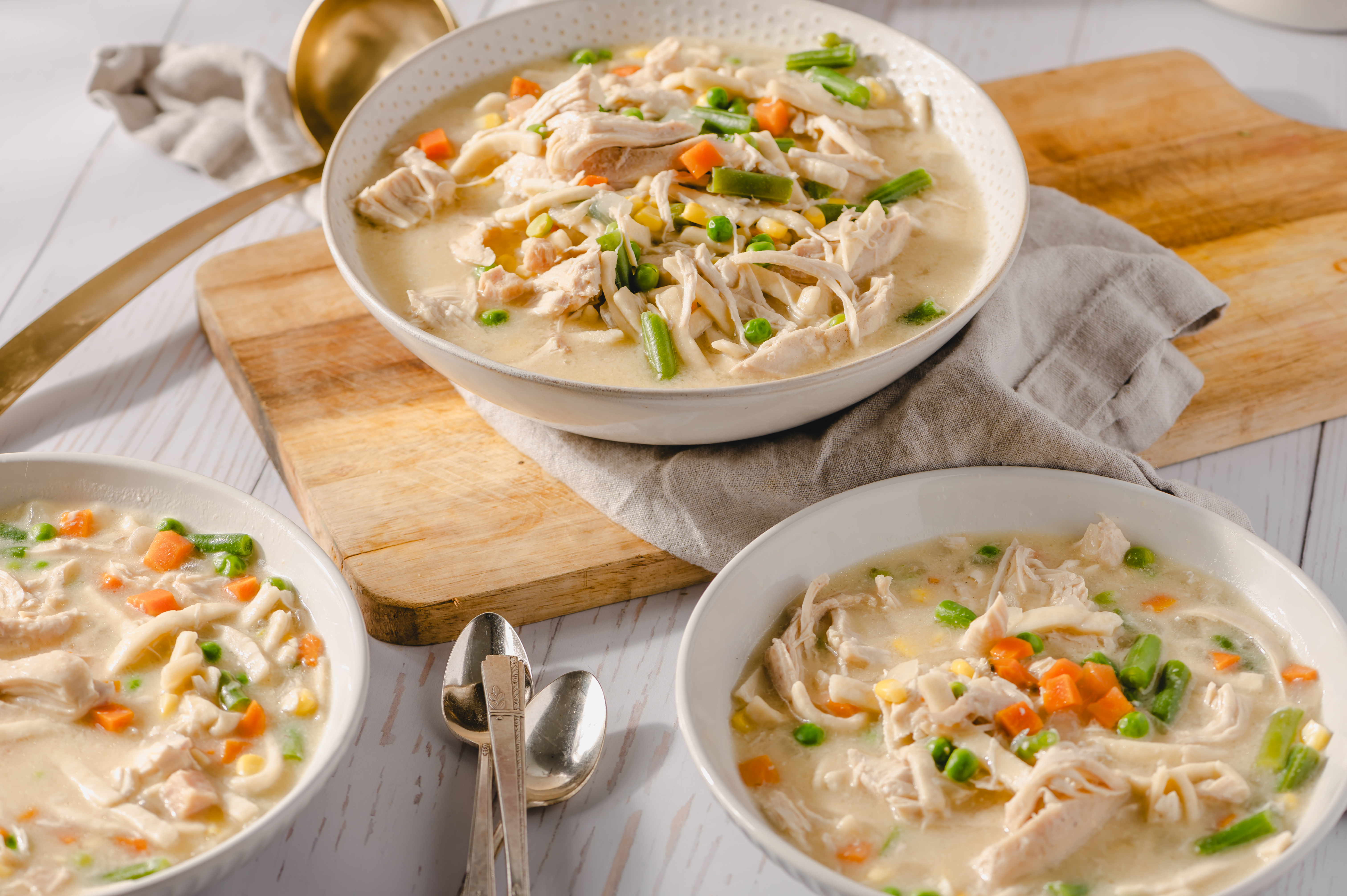 You don't have to be a grandma to make a comforting, home-cooked meal. Show her your stuff with creamy Homemade Chicken Noodles! Slow cooked shredded chicken breasts and homestyle noodles come together in the most delicious thick broth for the outstanding warmth and welcome only Grandma could create... until now! Don't let her get all the glory; make some Homemade Chicken Noodles and your family will get to join in on all her delicious secrets!