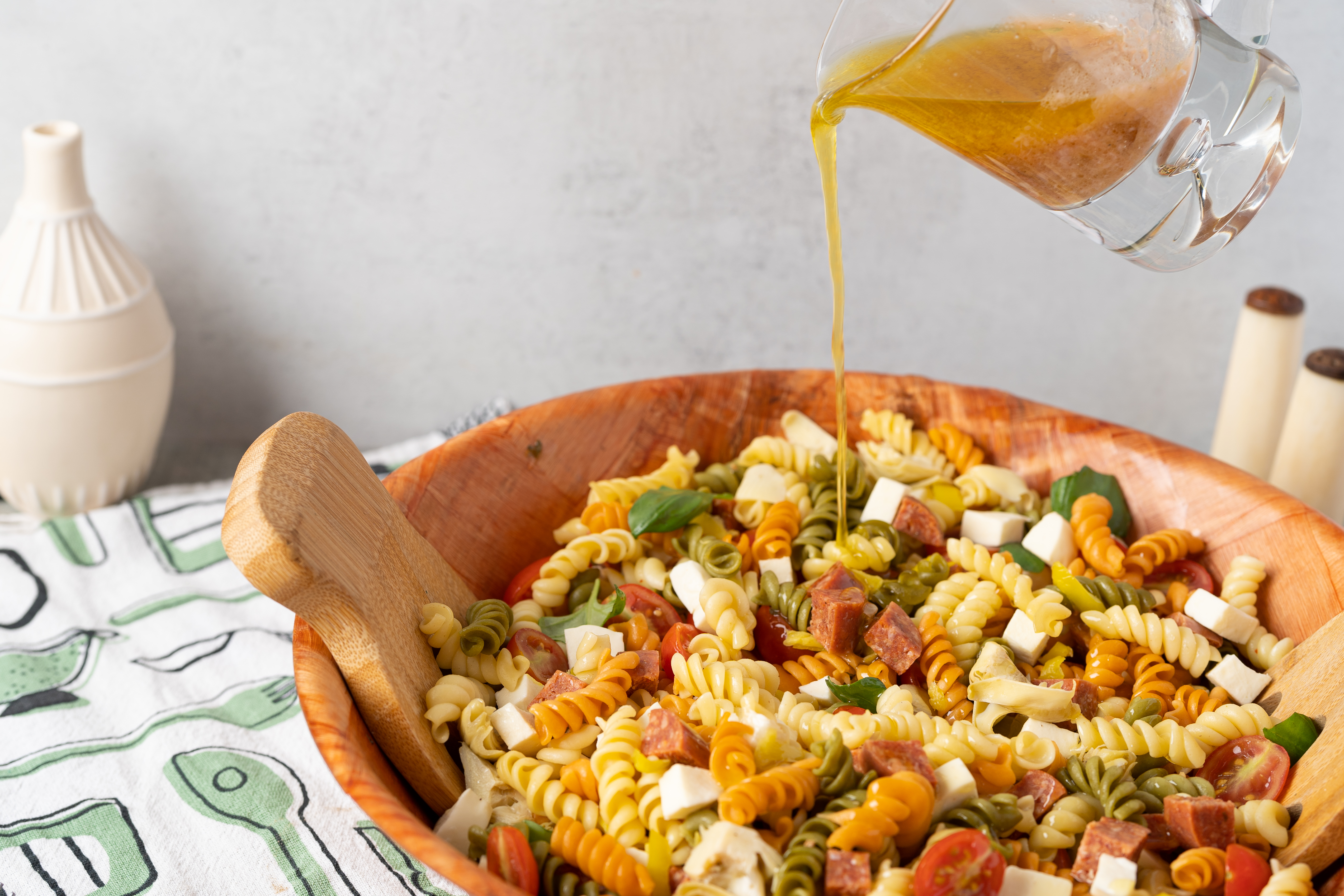 Step 6 -Pour the dressing over the pasta and toss to coat.