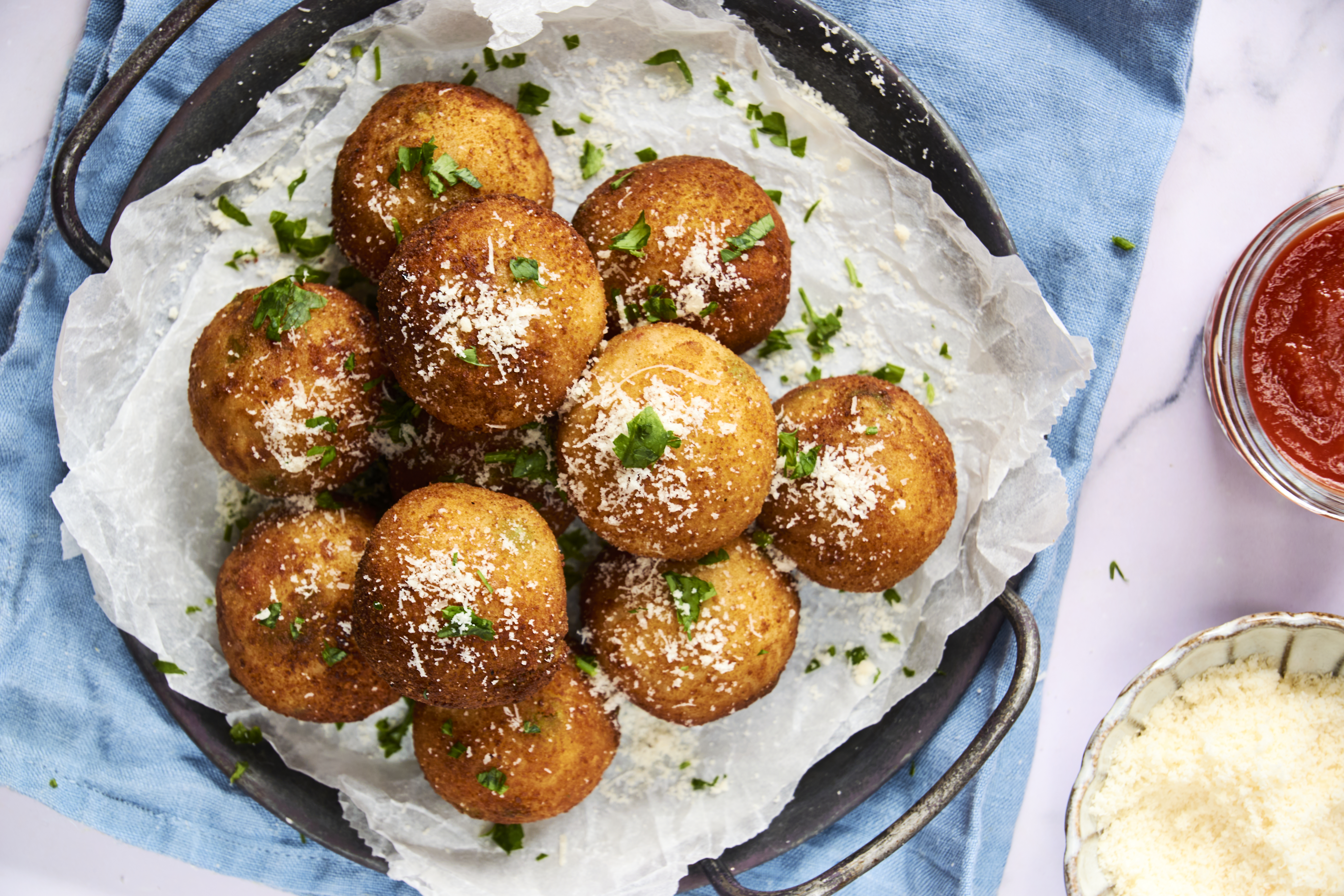 Italian Rice Balls, or arancini, are the side dish (or snack) that's so hearty you might just want it for the main course! These golden, deep-fried rice balls are crisp on the outside and stuffed with tender, seasoned rice and melty cheese. With a little marinara on the side for dipping, Italian Rice Balls are a fair food that is fabulous, pure and simple!