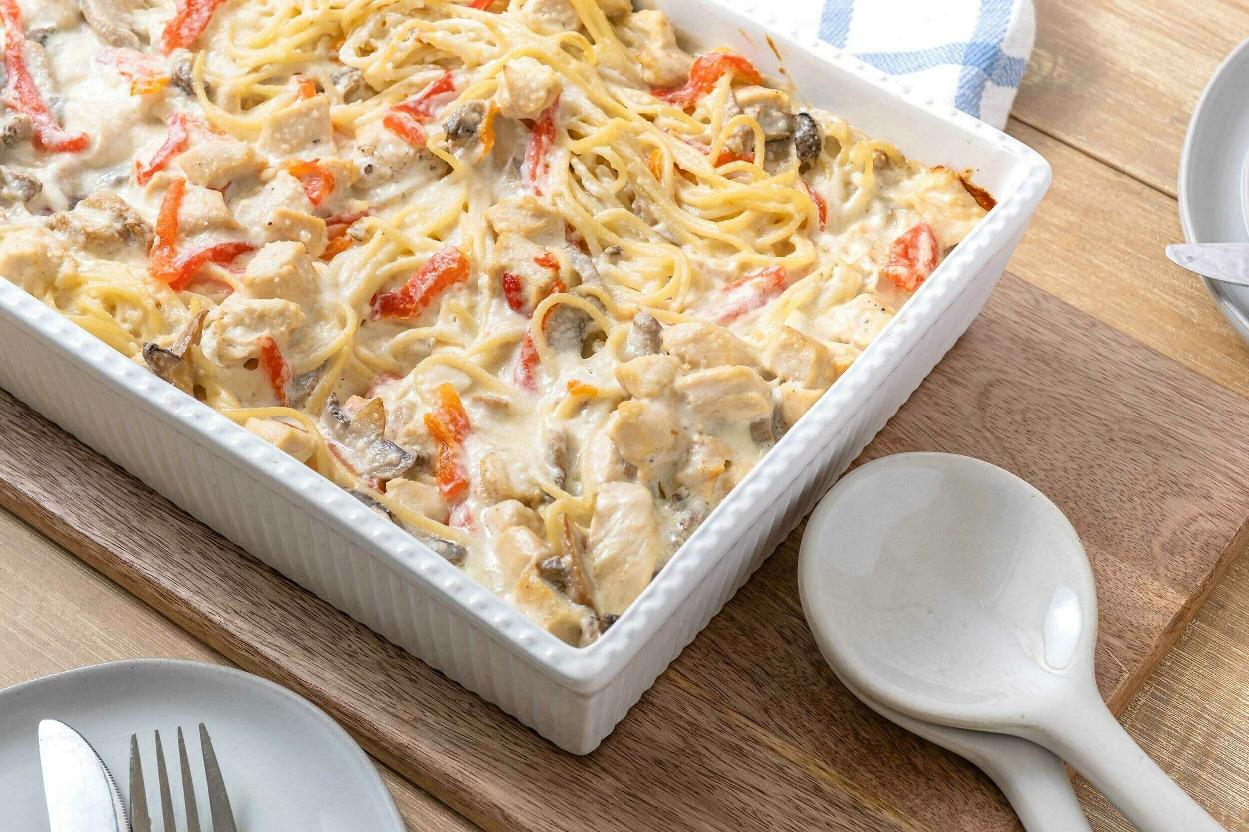The name of this dish says it all; you can literally get two complete dinners ready in less than an hour! Makes 2 Chicken Tetrazzini features chicken and spaghetti cooked to tender perfection in a creamy, savory, white sauce. Made extra meaty with mushrooms and with a touch of heat from pimentos, Makes 2 Chicken Tetrazzini is a buttery beauty of a main course perfect for weekday meal prep or for potluck dinners. If you're feeling generous, you can even give one to your neighbor or a friend!