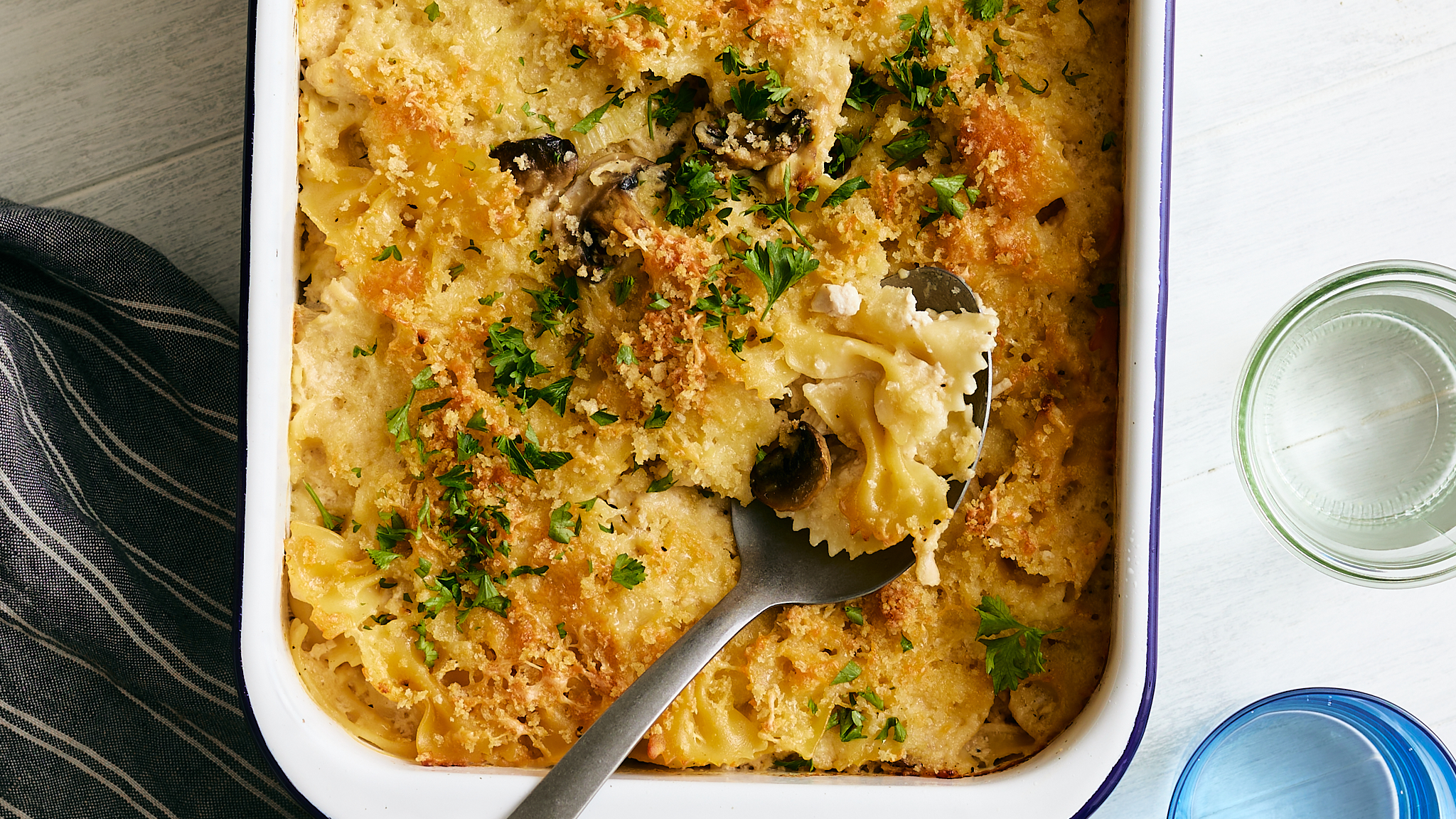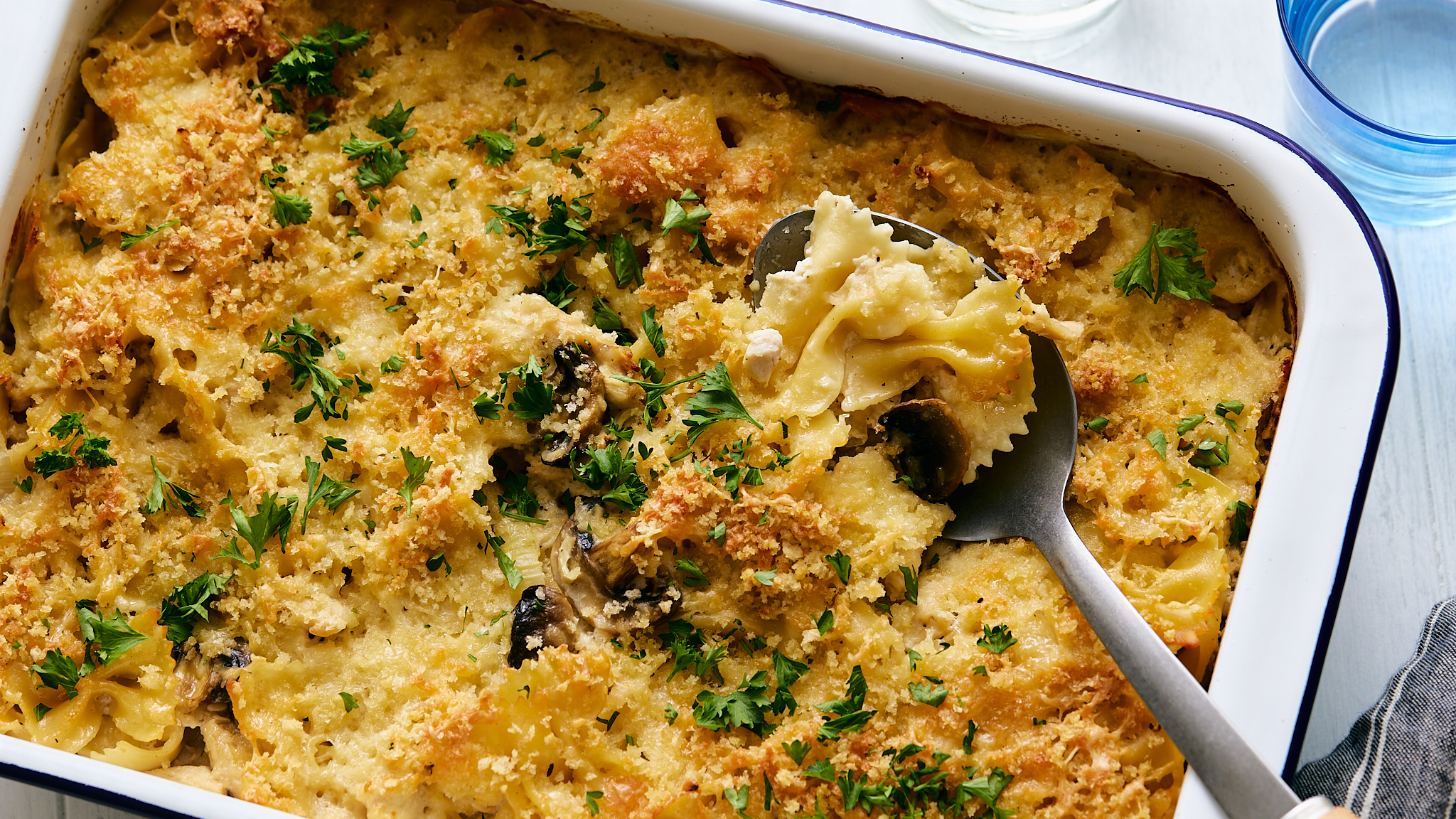 This is one casserole that will make you jump(man)! Mario Brothers Bake is no pipe dream and no mystery box; it's just good flavor all the way down! Tender bow tie pasta honors the heroic plumbers' Italian-American heritage, and then gets mixed together with juicy, savory chicken in a creamy, tangy sauce. Oh, and there are plenty of mushrooms! Can't have a Mario Brothers Bake without beefy mushrooms! Sorry if you have any upbeat video game themes stuck in your head!
