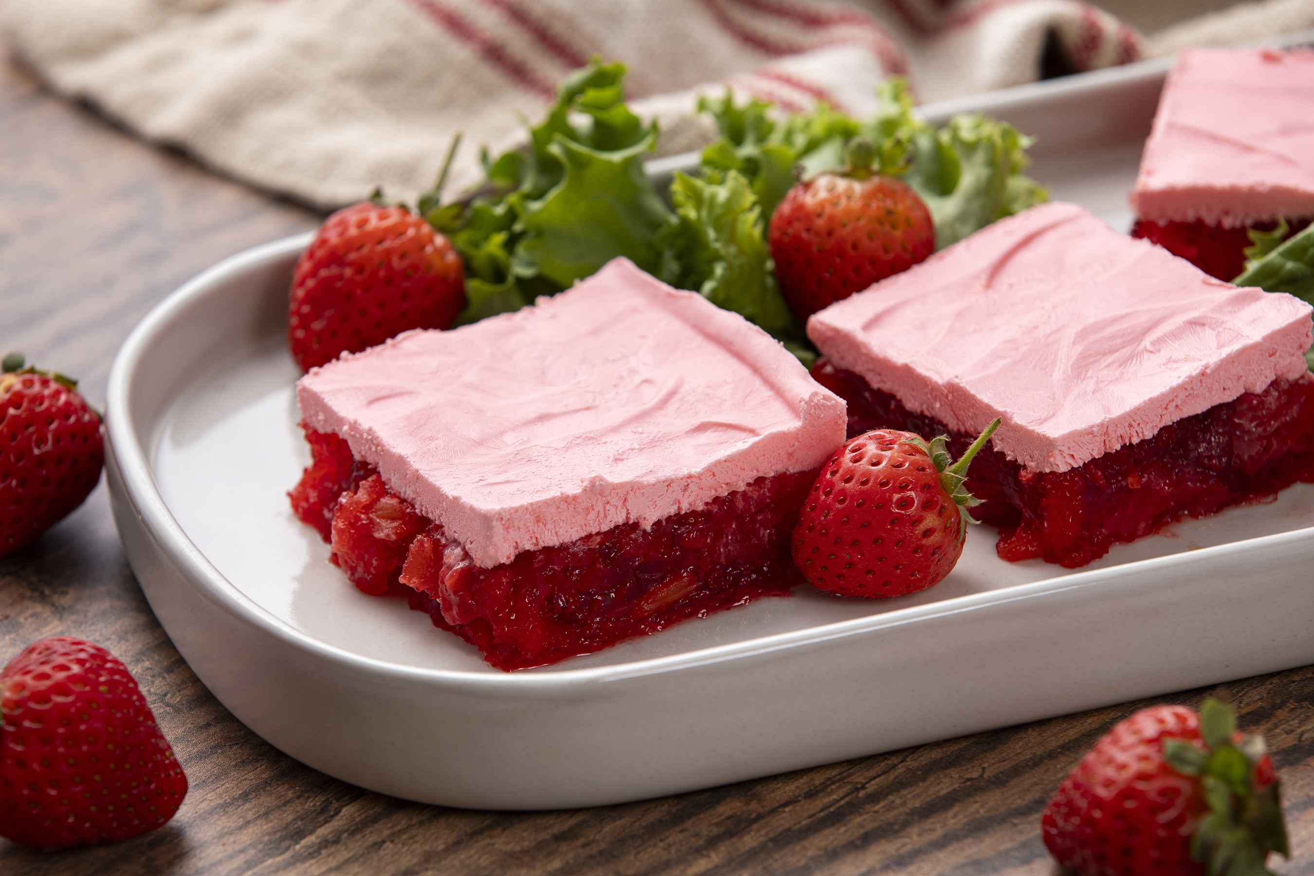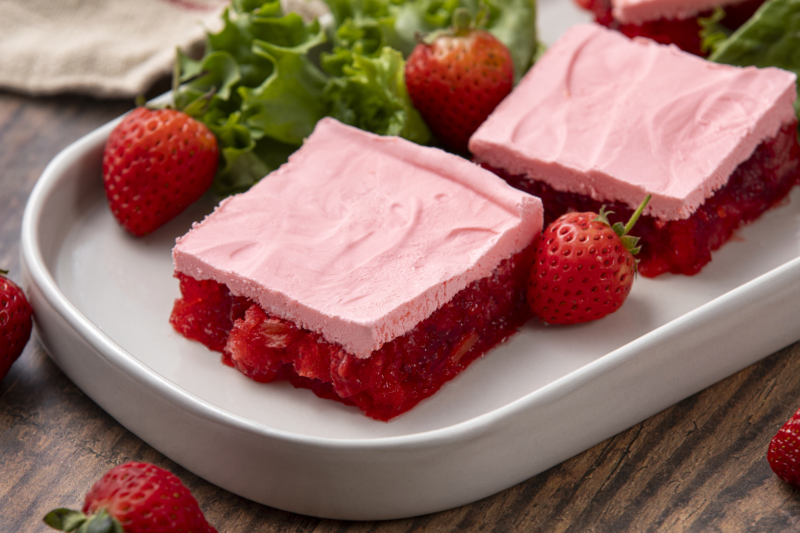 If you're hosting a pretty, little lunch, then you need a pretty, little treat to tie things up with. As the ladies are finishing off their tea sandwiches, they'll be strolling over to the dessert table to nibble on some of this Molded Strawberry Salad. They'll love it because there will be sweet, fruity flavors that'll remind them of what their mothers once made. They'll be equally amazed by just how perfect this squared version is for serving at quaint social events. Best believe it, this Molded Strawberry Salad will certainly be the center of any soirée that it is served at!