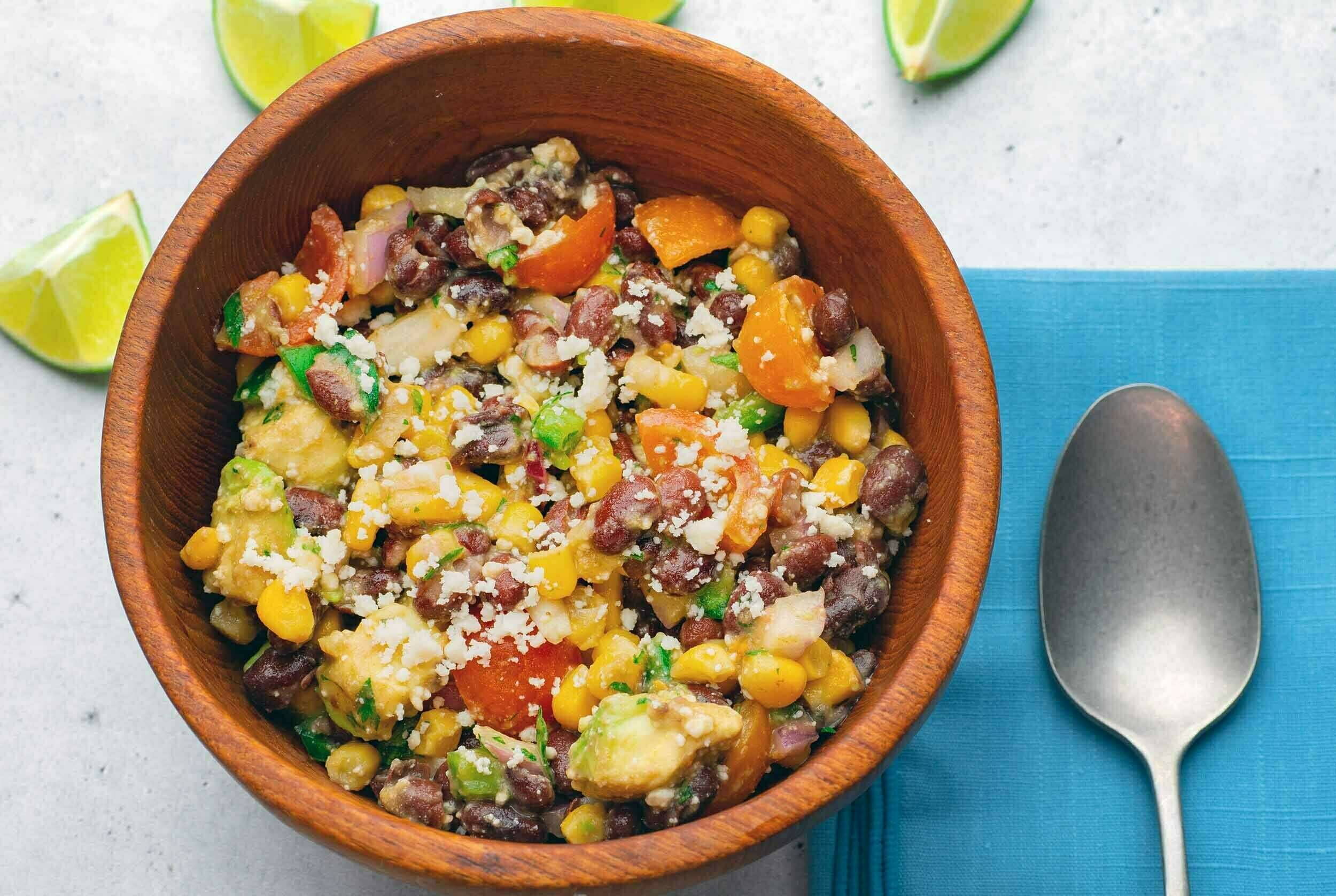 You can always count on your momma for great advice and even better recipes. She's got you covered the next time you're heading to a food-focused gathering with her fast, fresh, and flavorful Mom's Summer Potluck Salad. The people will love the nutty black beans, summery sweet corn, hearty ripe avocado, spicy chopped jalapeños, juicy sweet tomatoes, crunchy red onions, fresh cilantro, and creamy cotija crumbles all mixed together and coated with a sweet, garlicky dressing. Everyone's tastebuds will agree that she knows best as they dig into Mom's Summer Potluck Salad!