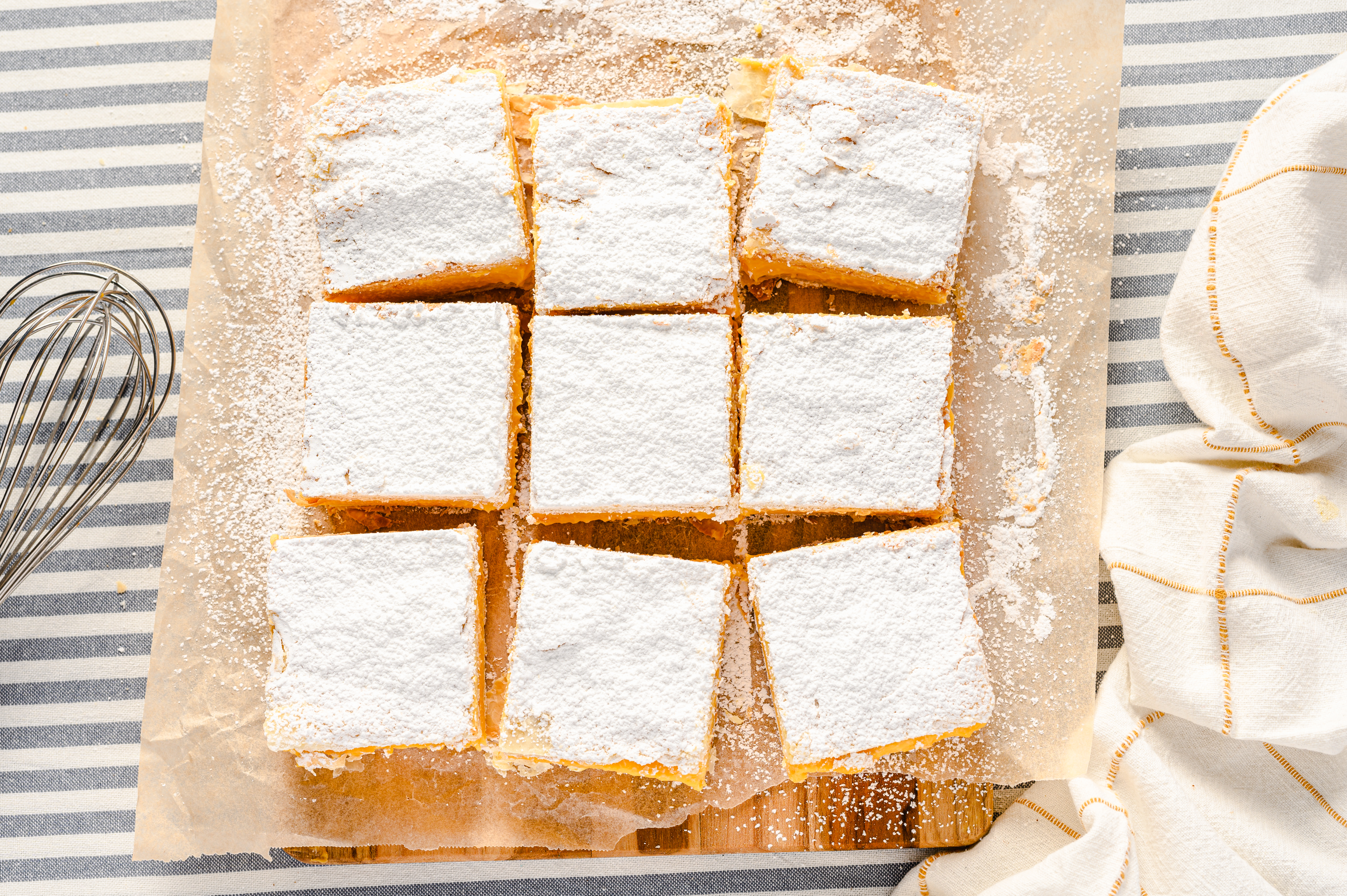 Step 24 -Use the overhanging parchment paper to transfer the custard square from the pan.