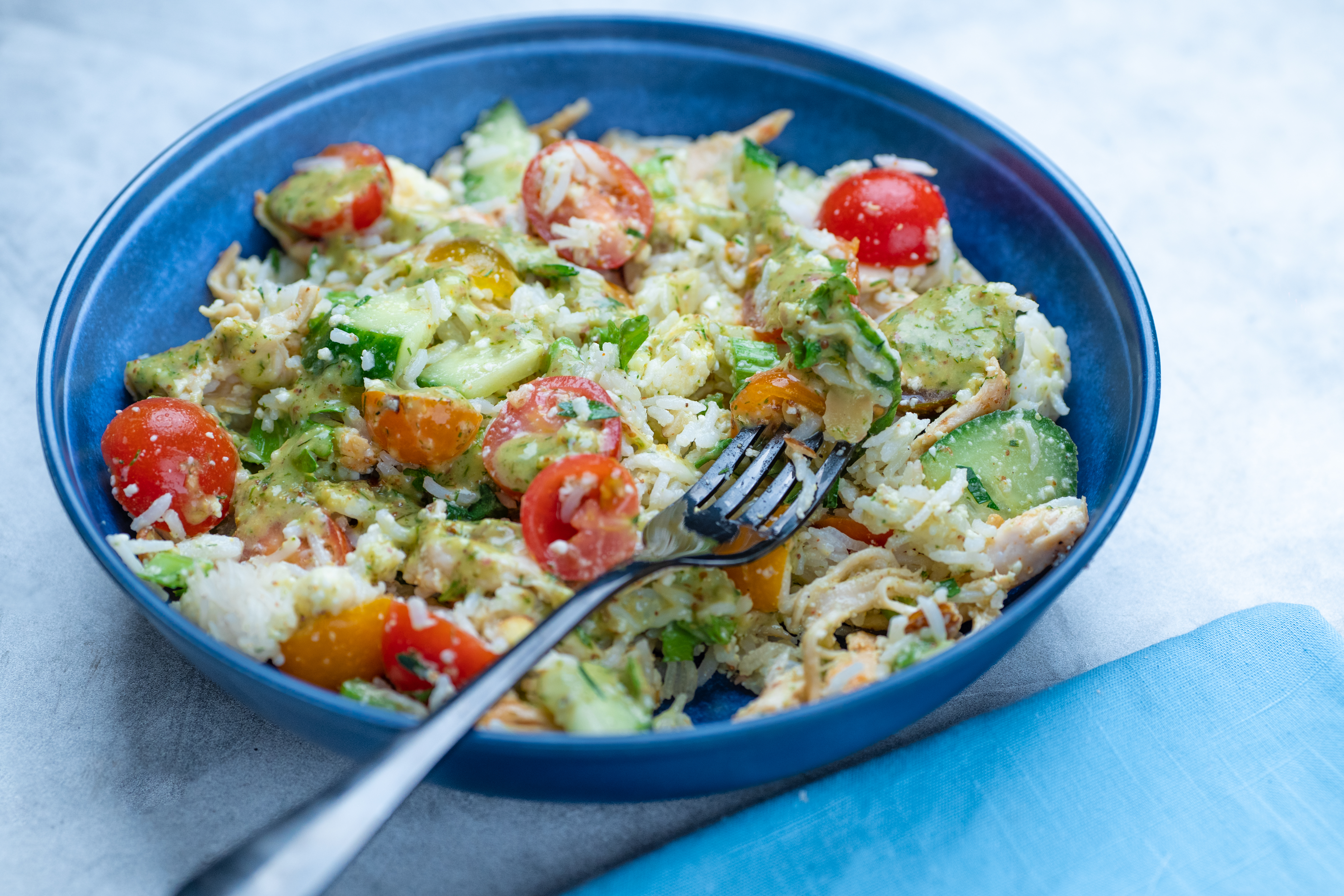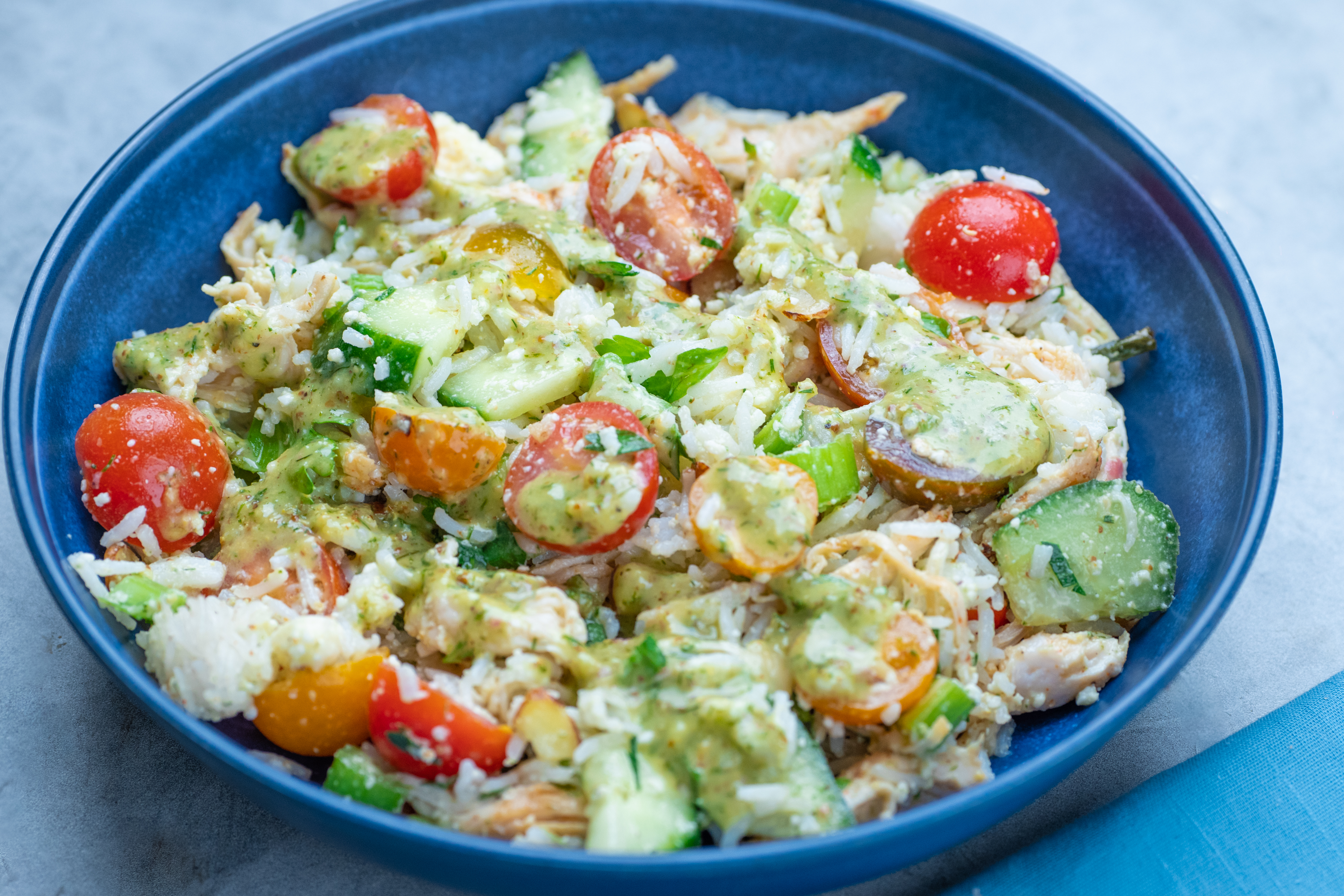 You know when the temperature is just right - it's not too hot or too cold, and the sun is shining but there's a nice breeze to keep you cooled off - yeah, that's our favorite kind of day. Those kinds of days always have us craving Perfect Weather Salad. Right before we grab our picnic blankets and head out to enjoy it, we make a big bowl of these leafy greens to really top off the experience. Who doesn't love basking in the refreshing sunlight while crunching on this veggie-packed dish, filled with hearty chicken, tender basmati rice, and a creamy, tangy homemade dressing?! That's what perfect weather was made for! Whip yourself up a bowl (it doesn't take long at all) and soak up every drop of the Perfect Weather Salad!