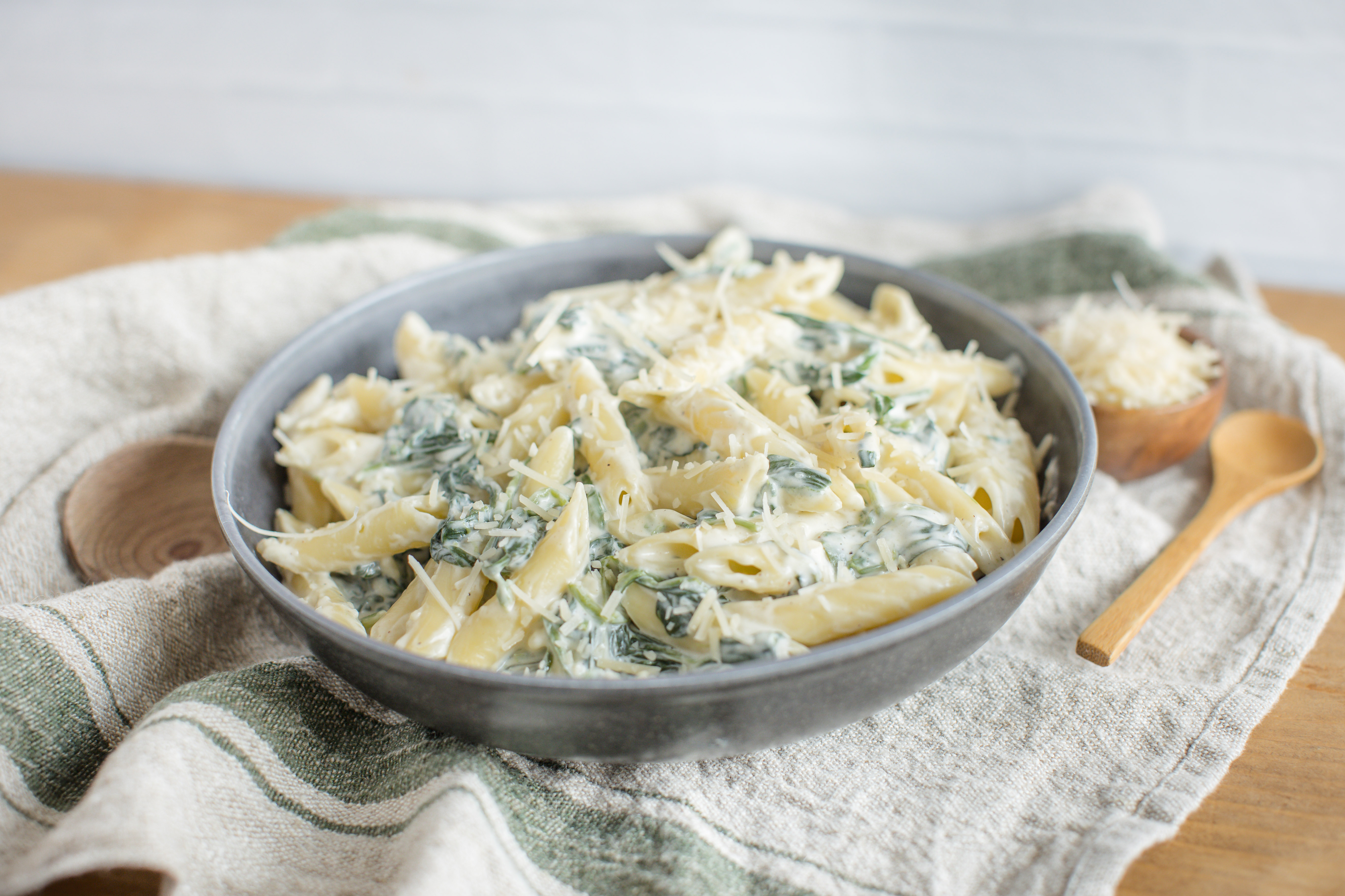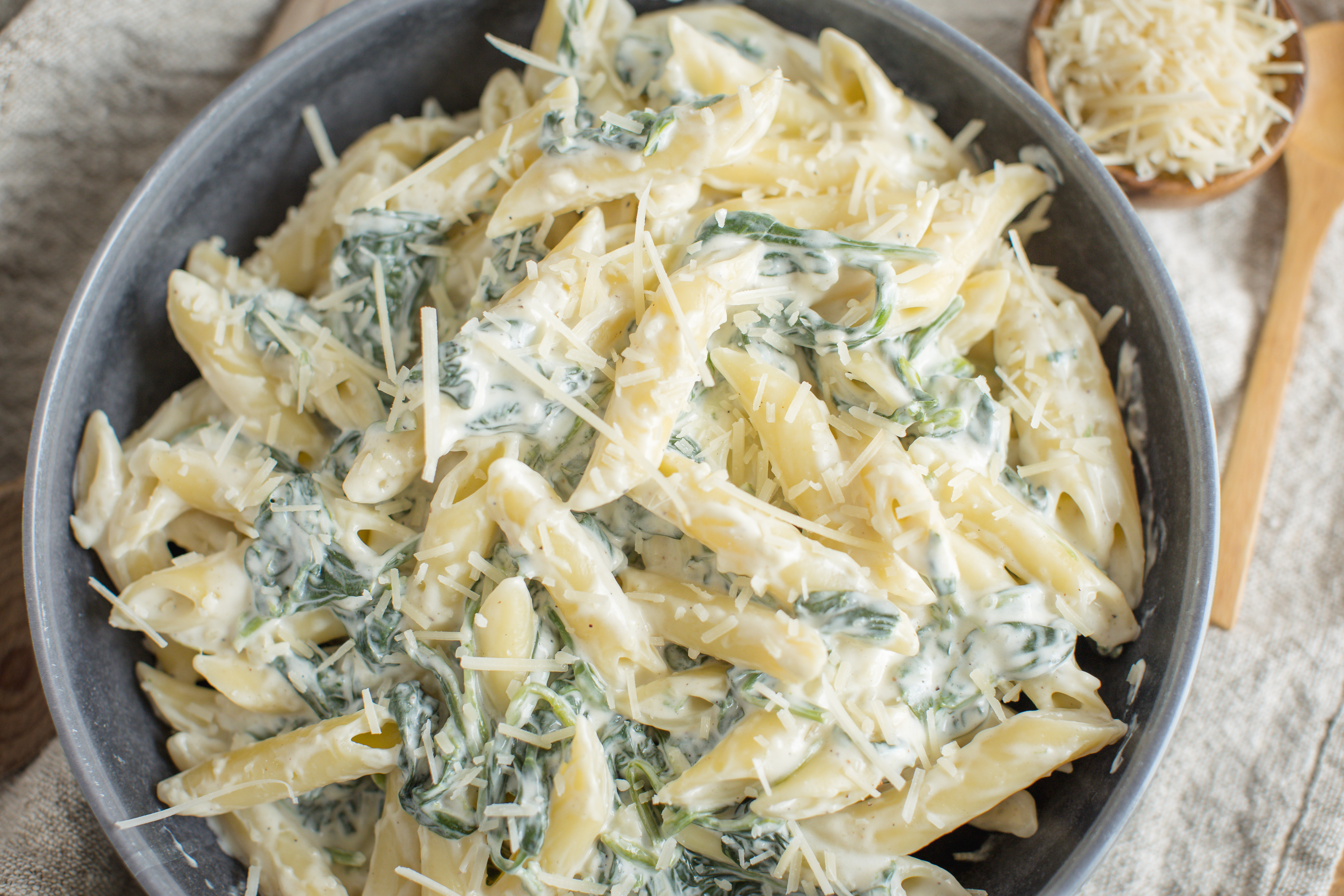 Everything these days is done rather quickly... like oil changes, online shopping, and communicating. But cooking a good meal really doesn't adhere to this rapid, we-want-it-now kind of lifestyle. Most delicious meals come with a cost... of time, that is. Well, that was the case until we found this lightning-fast solution; Quick Spinach Pasta. The get-rich-quick creamy and cheesy spinach feverishly attaches to the slow-going al dente pasta for a quick-fire family favorite you will race to eat again and again. So, cut to the chase and quit wasting time, try Quick Spinach Pasta for an expressway type of meal the whole family will love! Being quick-on-the-draw for your next meal gives you time to haul (or relax, but that didn't rhyme)! Hurry up and take your sweet time... then enjoy!