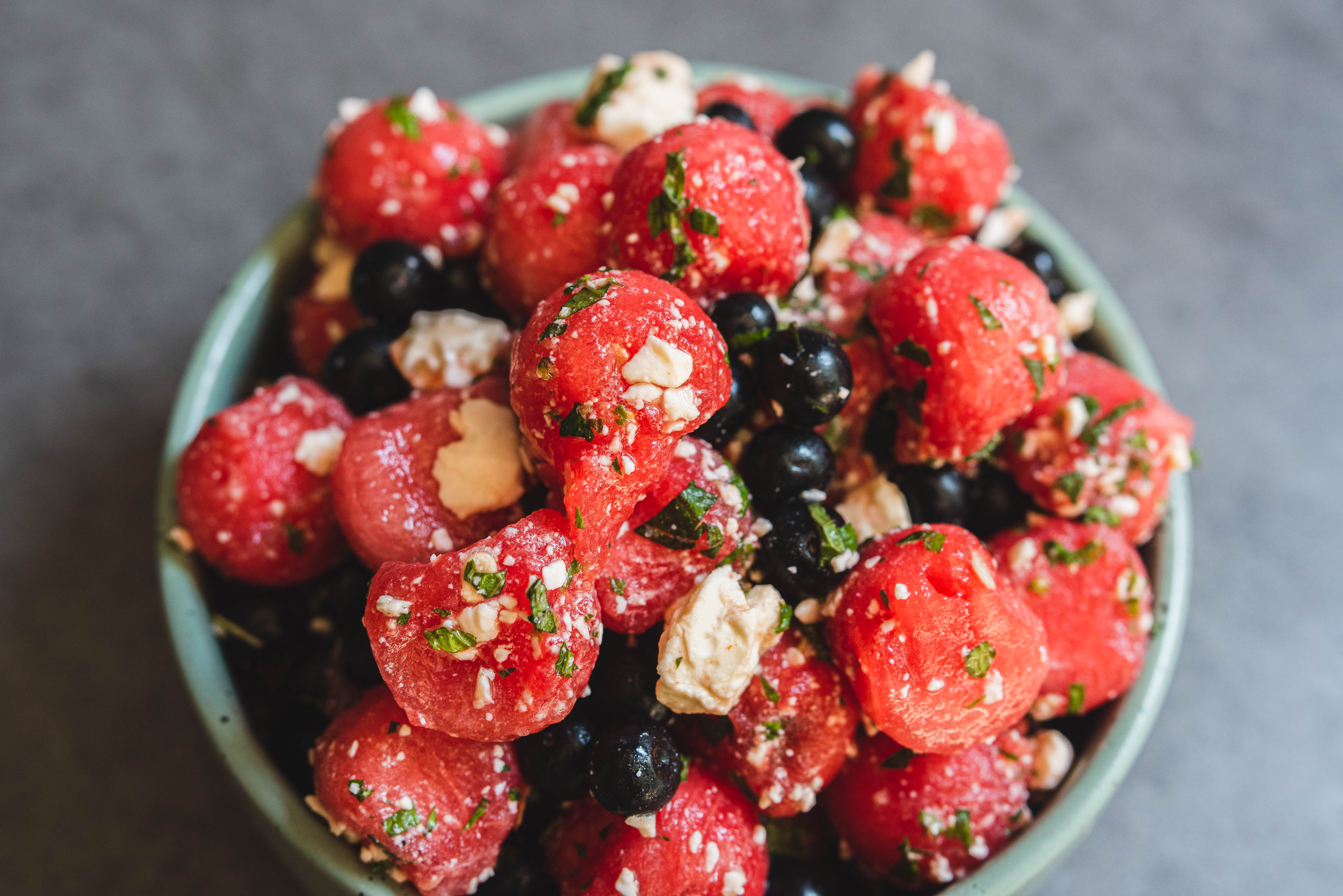 It's patriotic! It's refreshing! It's refreshingly patriotic! It's the Red, White, & Blue Salad! A summery mix of juicy watermelon, bright blueberries, and crumbly, sharp feta cheese... Red, White, & Blue Salad balances the perfect mixture of sweet and savory! A drizzle of floral honey and cool mint really helps this salad embody all the best parts of the season! Raise it high!