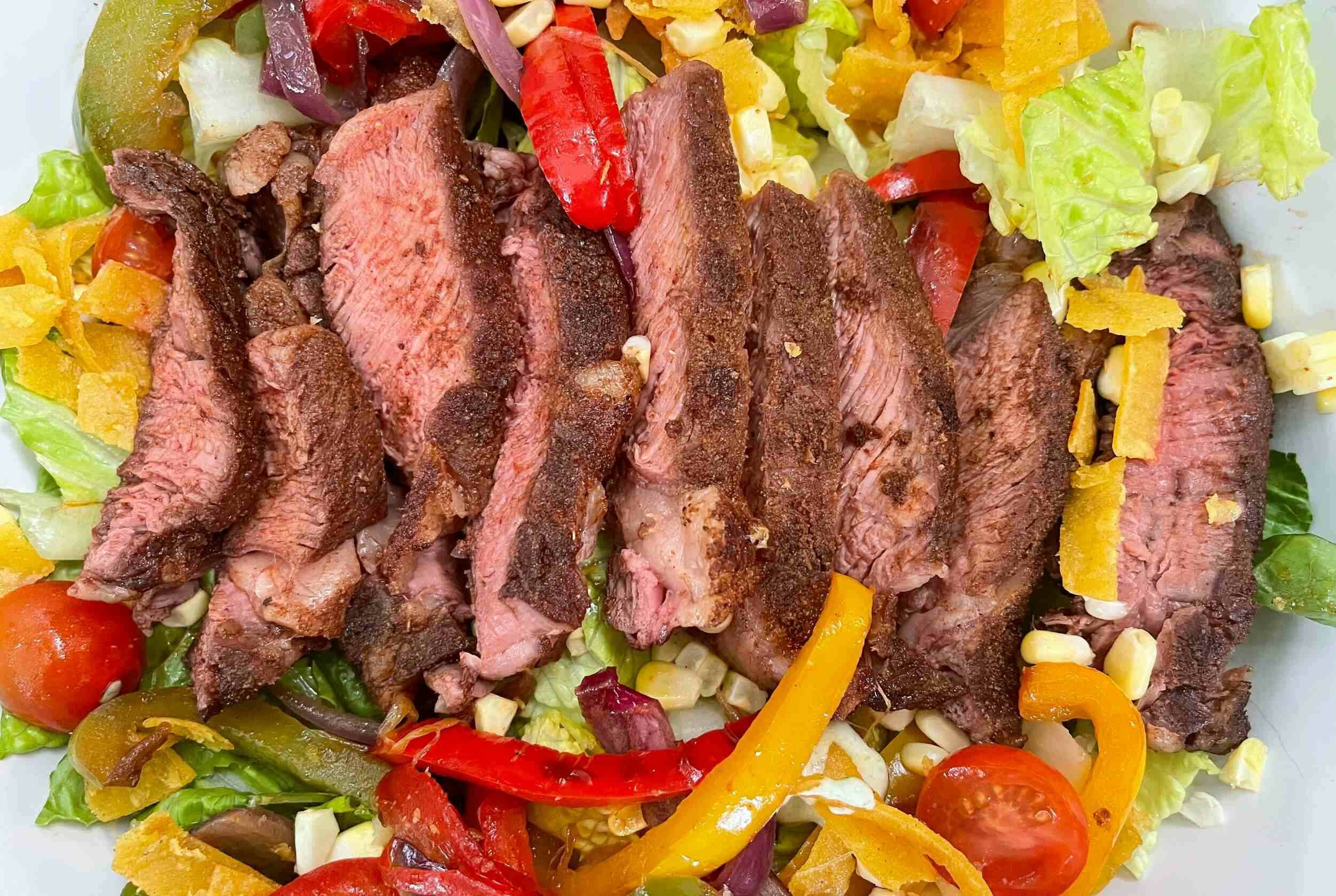 Step 20 -Slice the steak and add it to the top of the salad, along with the onions, peppers, corn, tortilla strips, and tomatoes.