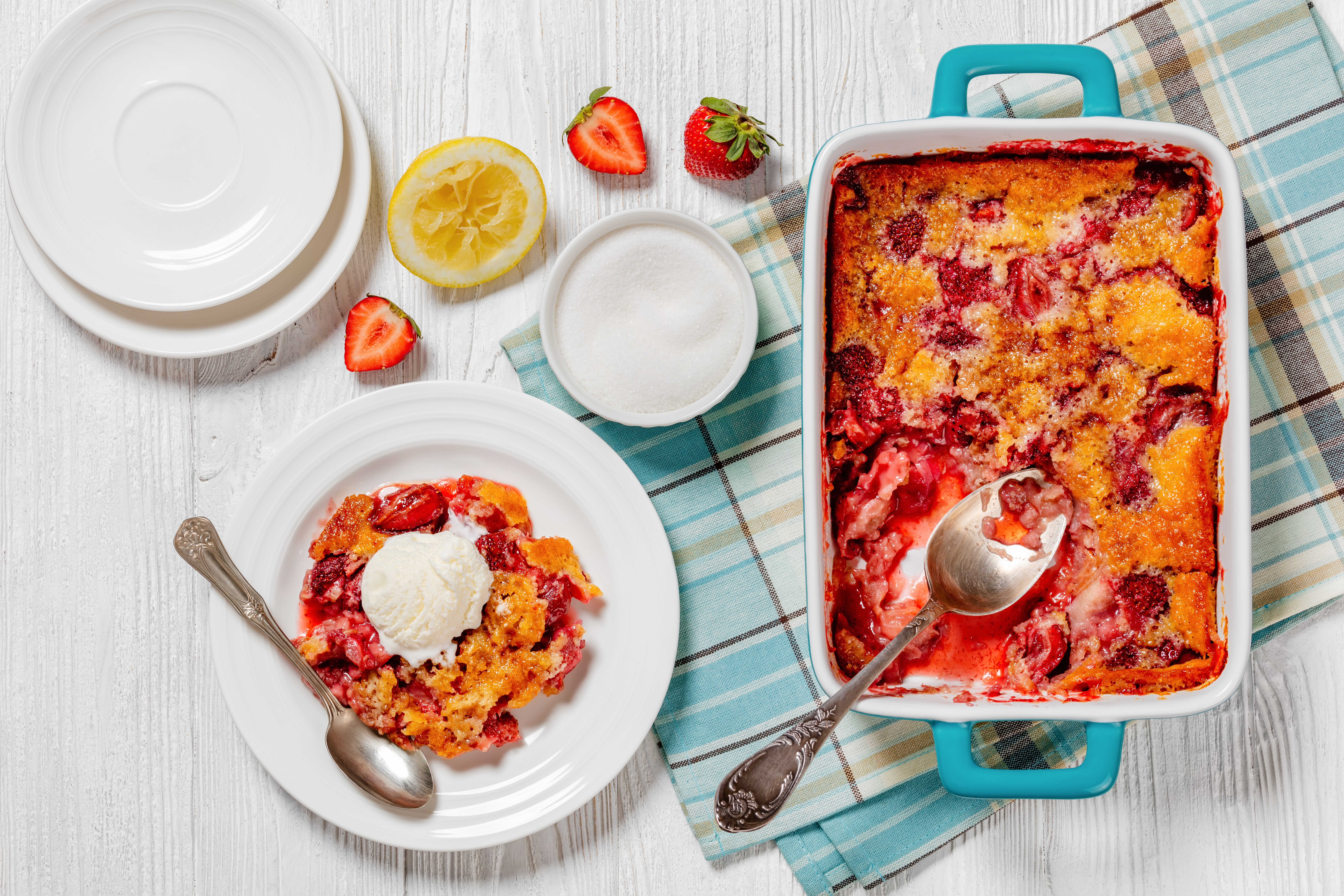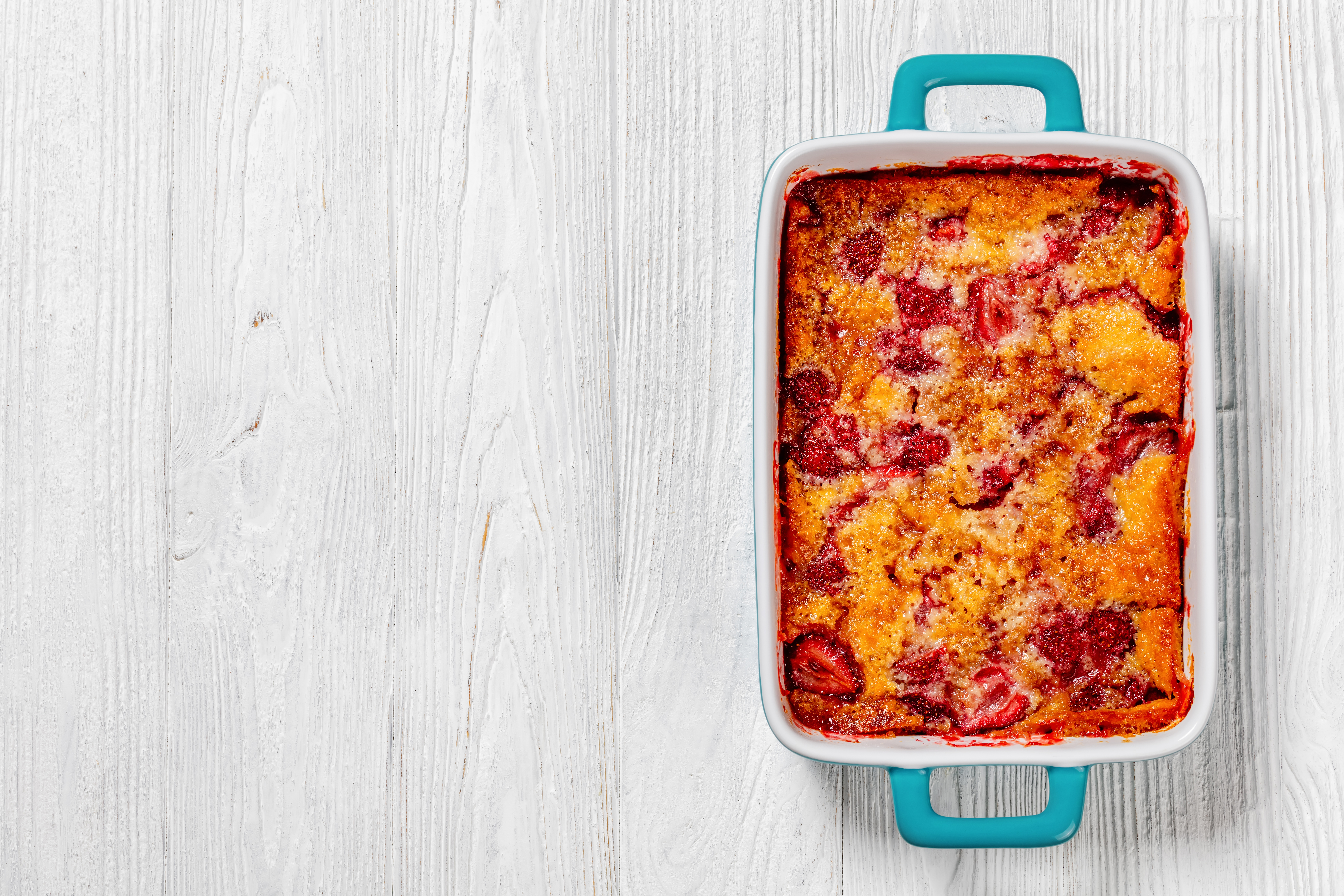Summer deserves to be sweet, doesn't it? The Strawberry Cake Bake certainly thinks so! This buttery, tender cake bakes the summery, bright, juicy strawberries right into it, so each bite is sweet and delectable. Served with rich cream, whether whipped or ice, the already-incredible Strawberry Cake Bake becomes something else: the whole promise of summer in a dessert!