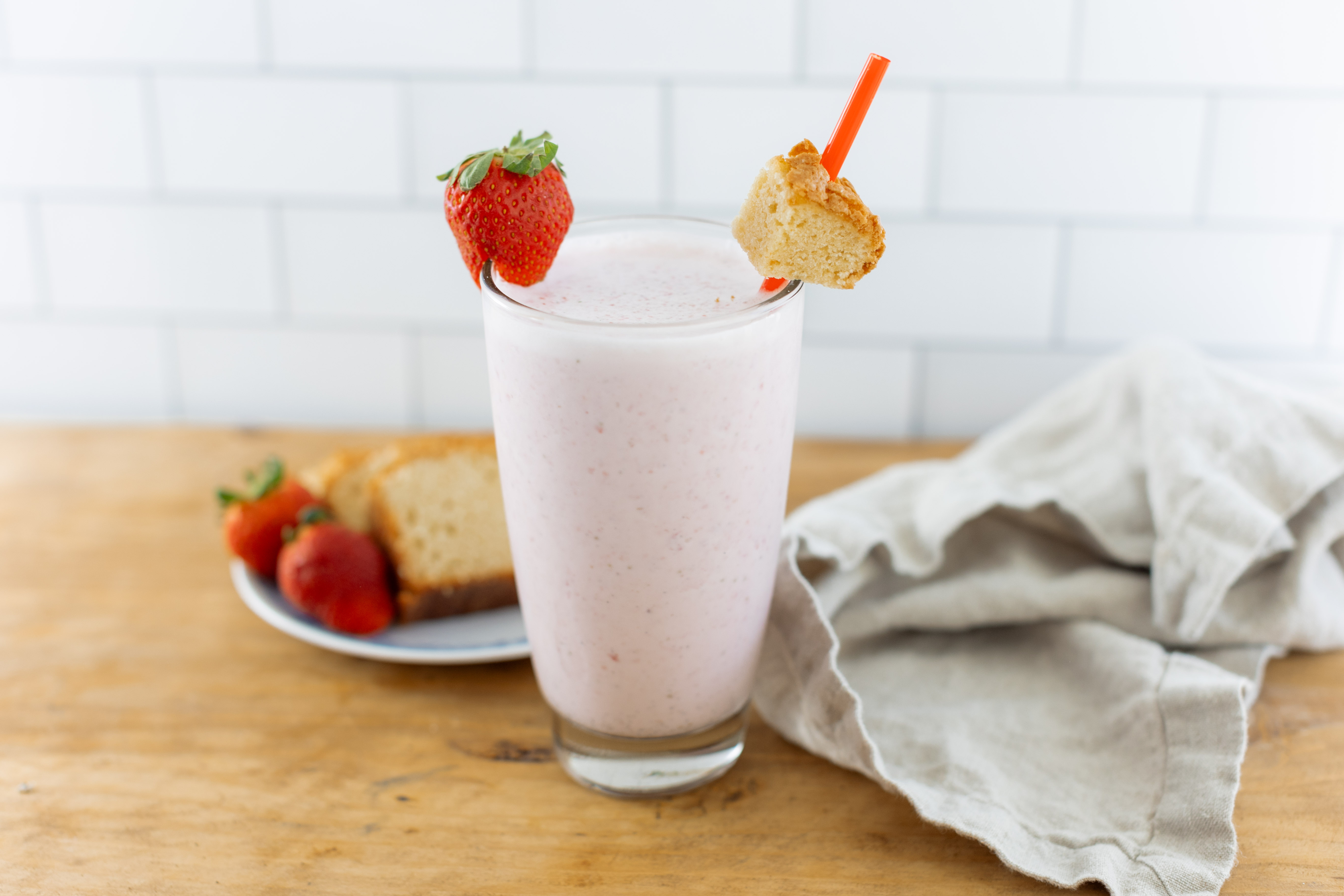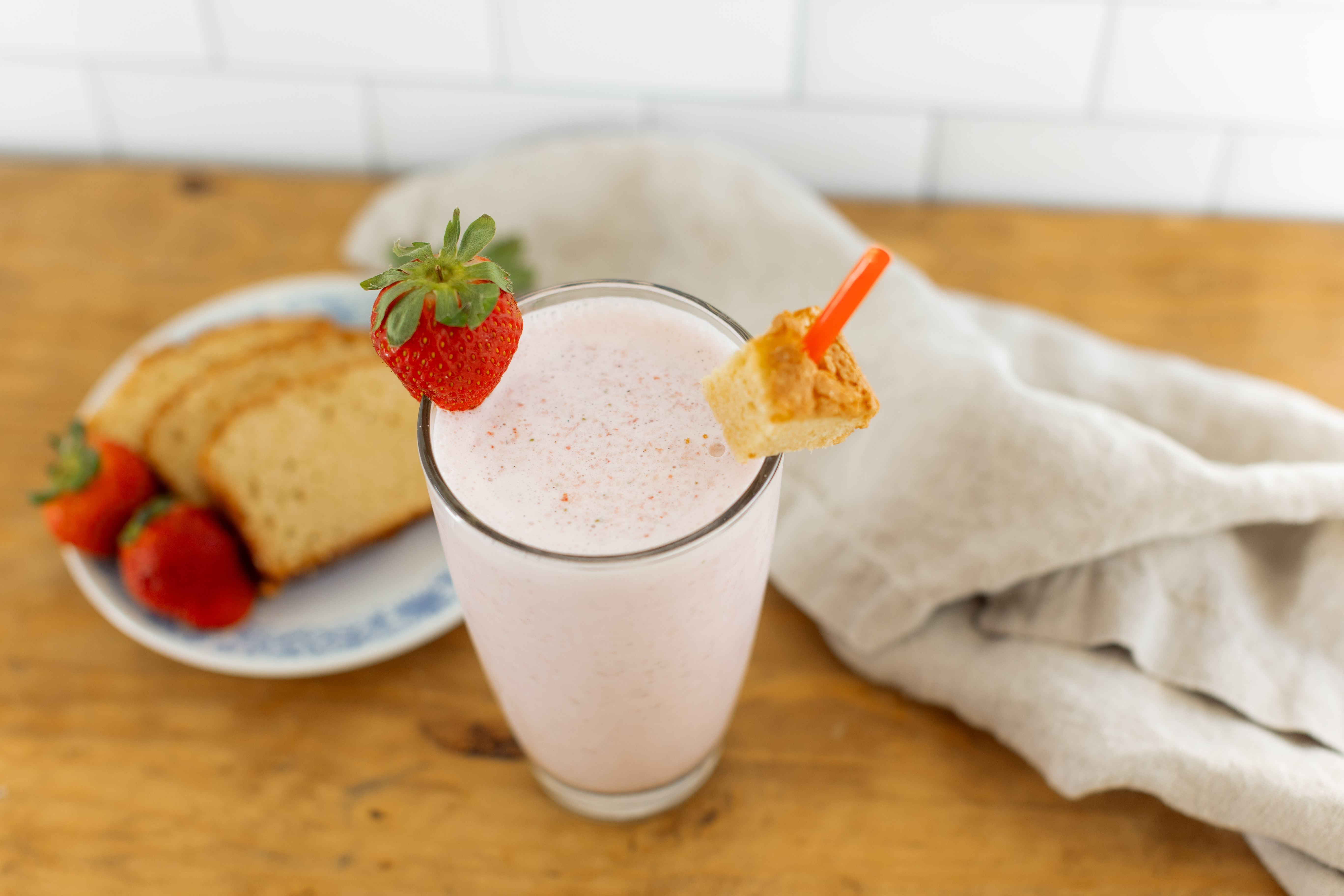 Step 3 -Serve the milkshake garnished with the extra whole strawberries and the pound cake cubes.
