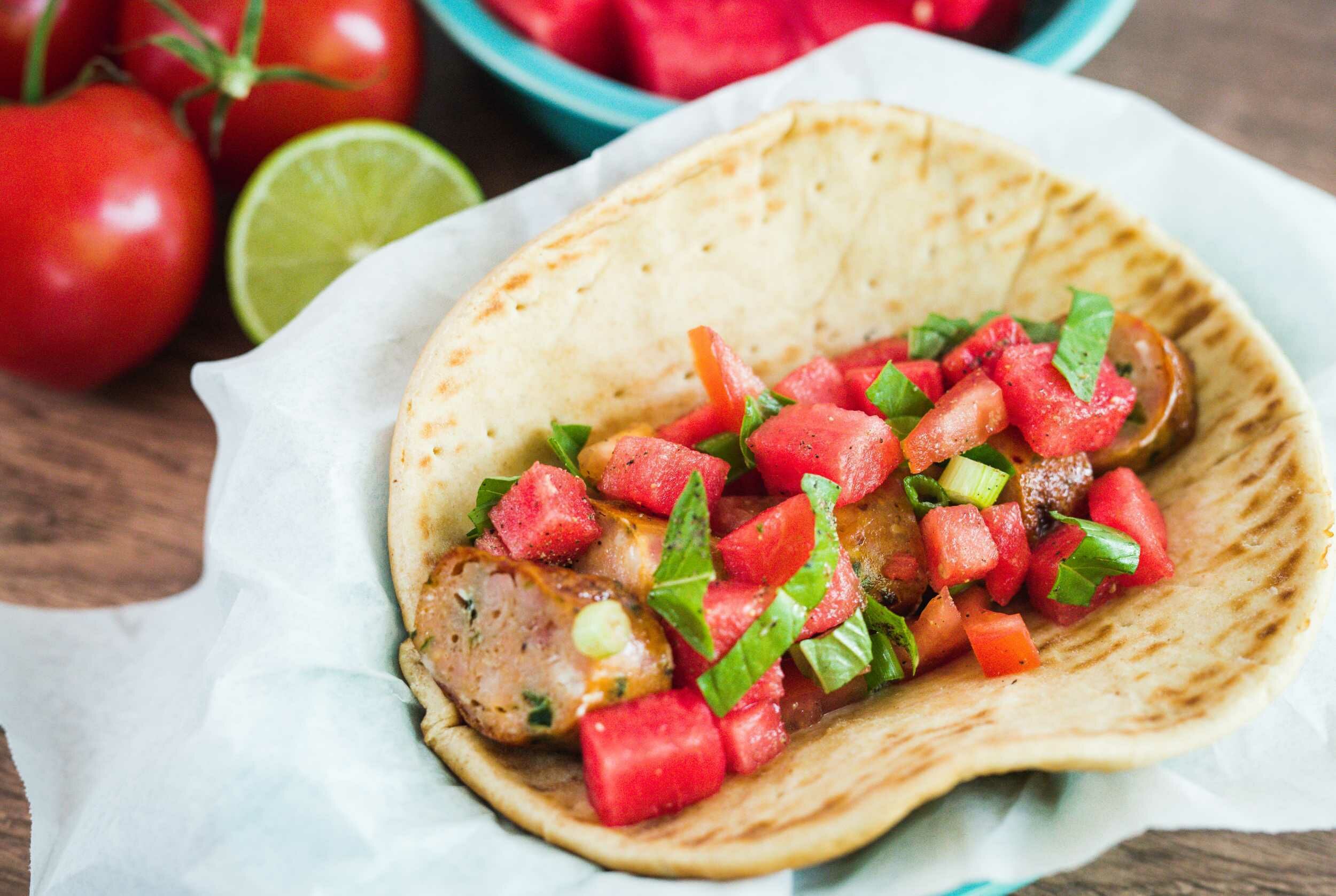 When summer rolls around and the sun starts shining bright, you shouldn't be munching on just plain old turkey sandwiches! You should be enjoying sandwiches just as vibrant as the weather! The Summertime Sandwich knows exactly how to get into the spirit, with a juicy and refreshing watermelon salsa packed with aromatic herbs and bright lime flavor. Grilled sausages capture the savory fun of summer cookouts, and toasted flatbread adds a firework level of crunch! The Summertime Sandwich is an invitation to embrace the season to its fullest, so grab one and hit the great outdoors!