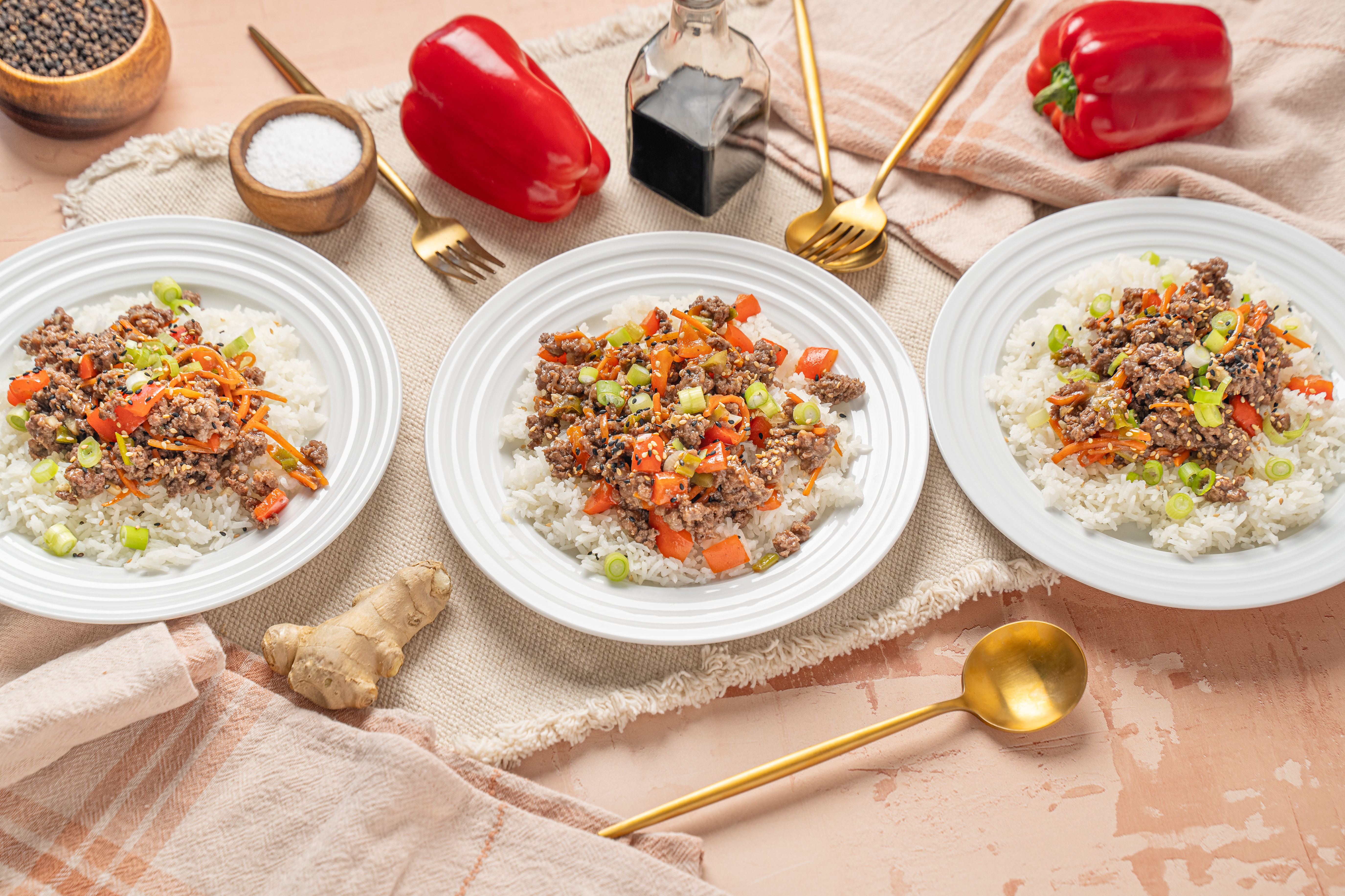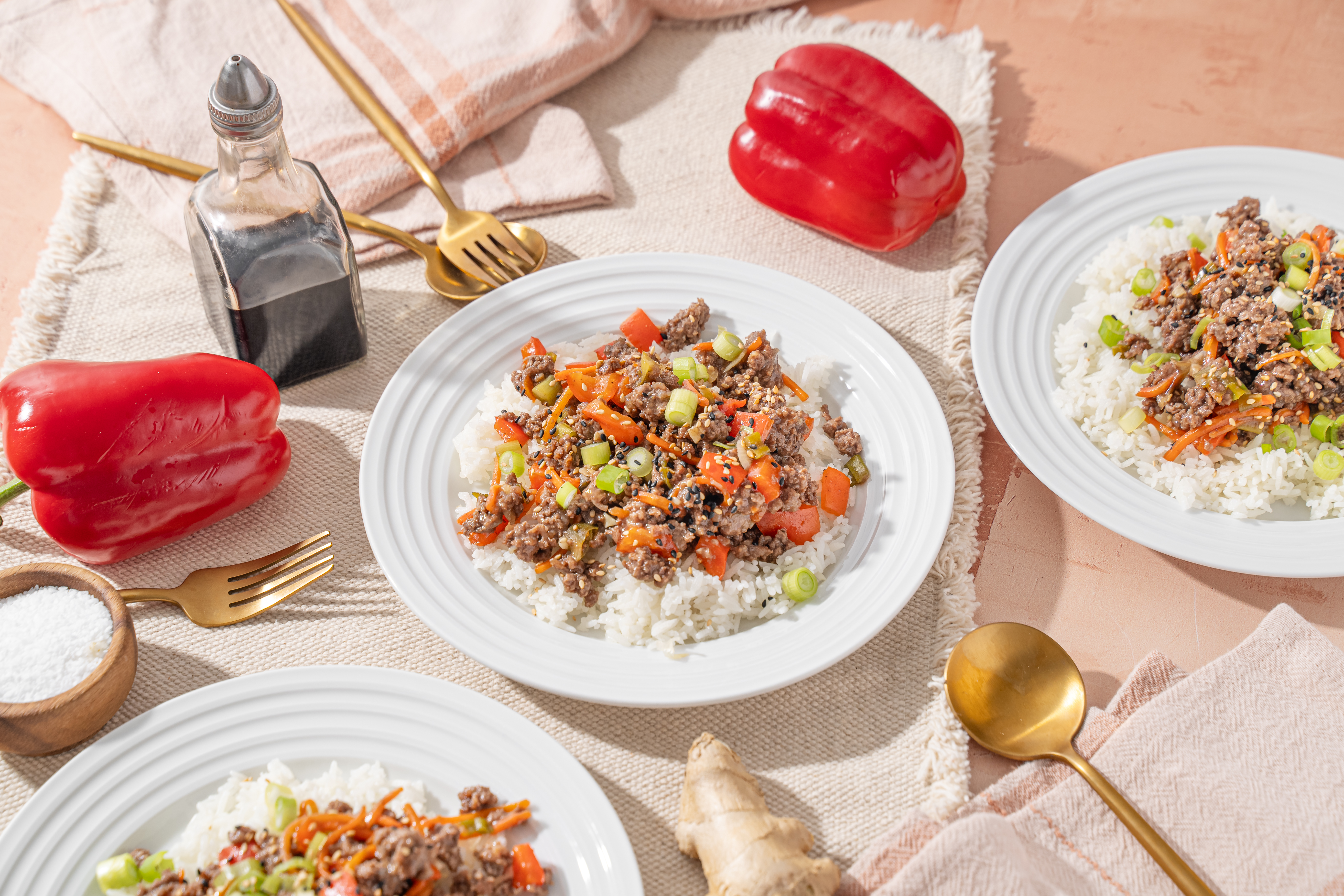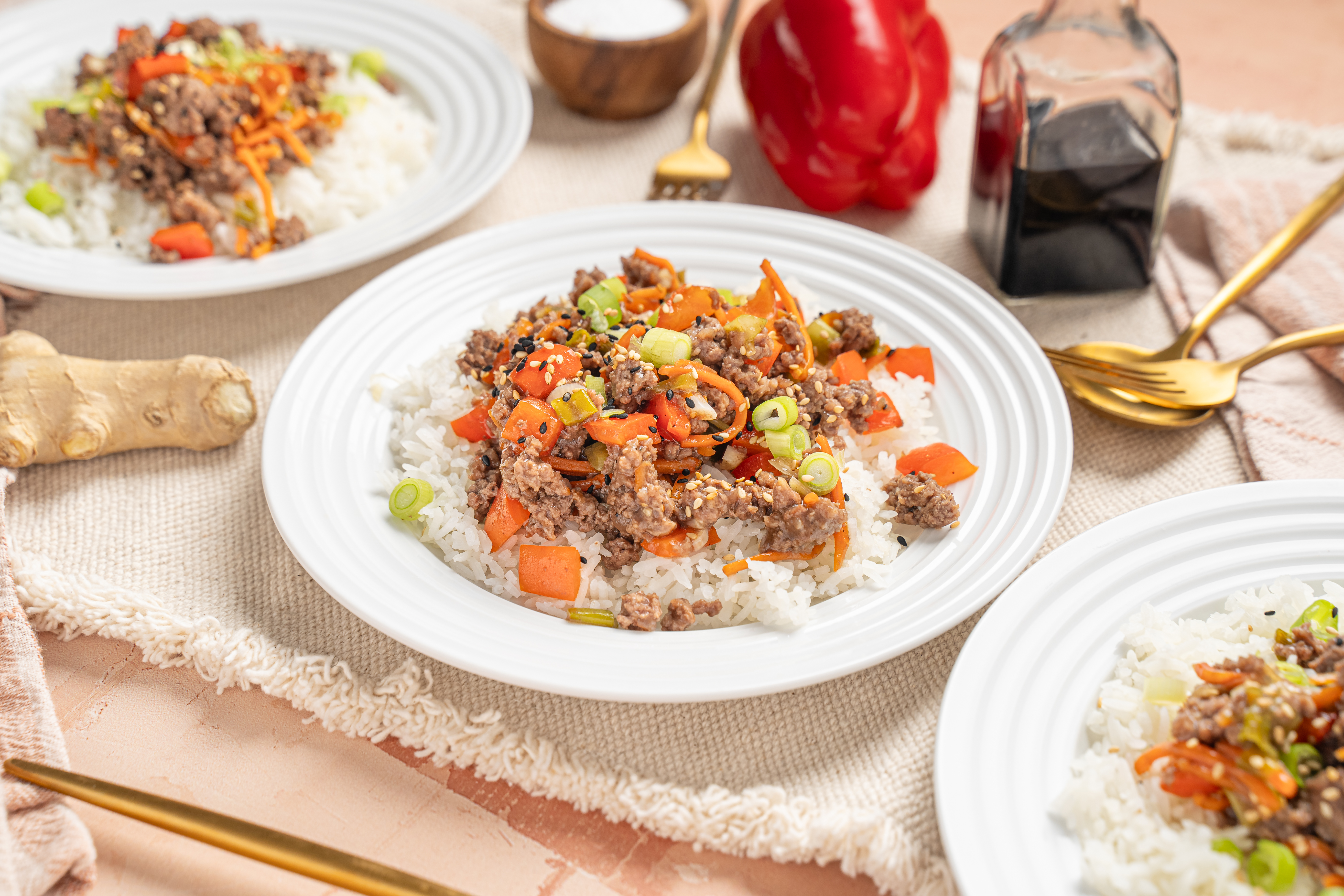 Tia knows how to make a speedy, scrumptious lunch without much effort! Tia's Teriyaki Bowls are just an example, but they are an incredible example! Served over hot white rice, Tia's Teriyaki Bowls are a stir-fry of juicy, savory ground beef, crisp scallions, bright red bell peppers, and refreshingly sweet carrots. Everything is coated in a homemade teriyaki sauce that has all the umami flavor you could ask for! Mmmm, Tia's Teriyaki Bowls are the kind of lunch we'll be wanting all the time!