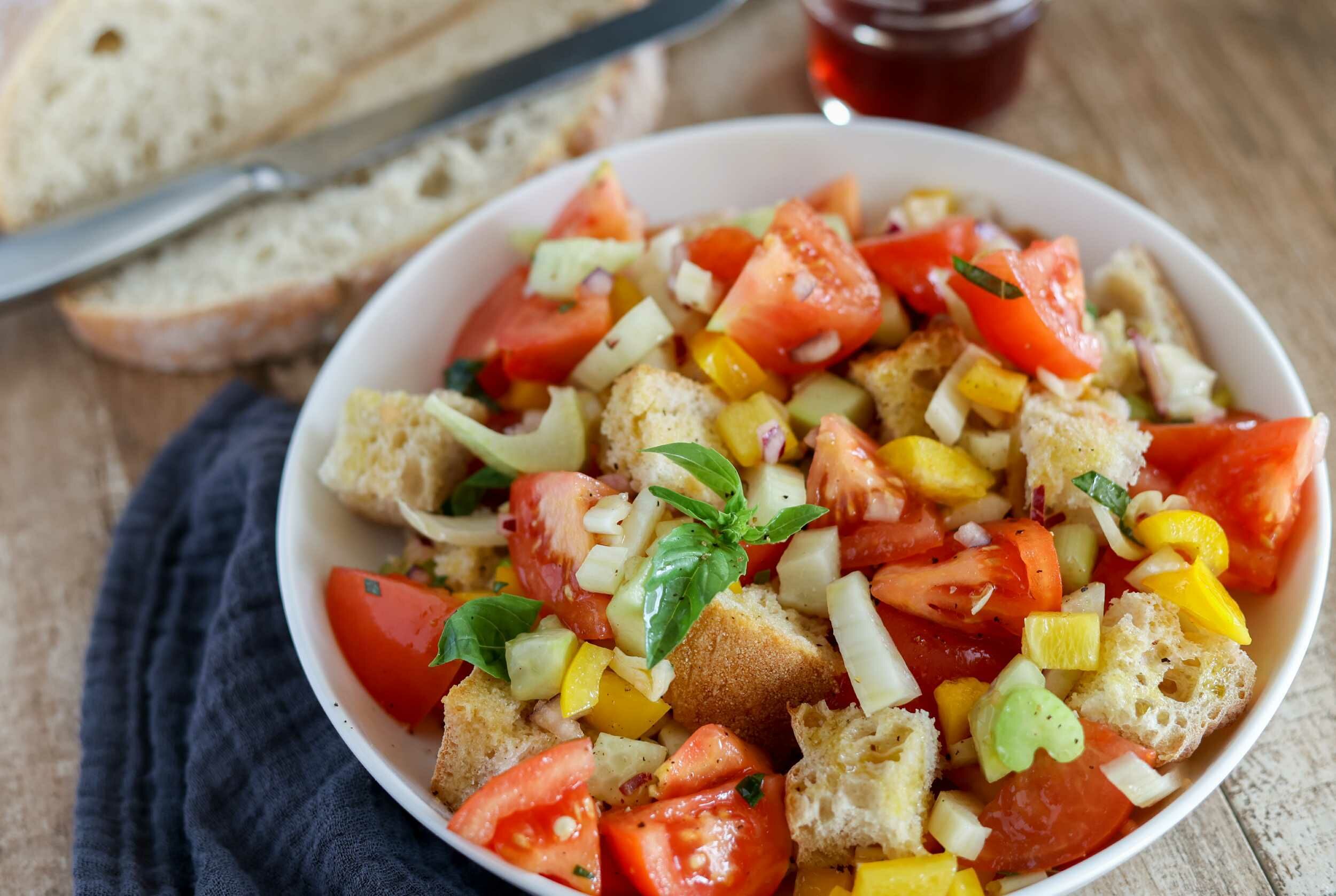 Tuscan Panzanella asks the question we've all had at one point: "What if a salad made the croutons the star of the show?" Instead of tiny bites of bread, Tuscan Panzanella features half a rustic Italian loaf soaked in tangy vinegar, garlic, and olive oil! Mixed in with bright tomatoes, refreshing cucumber, and juicy yellow pepper, these bread pieces are hearty and full of flavor! Tuscan Panzanella shows a new and exciting side to salads that you'll be eager to share with everyone!