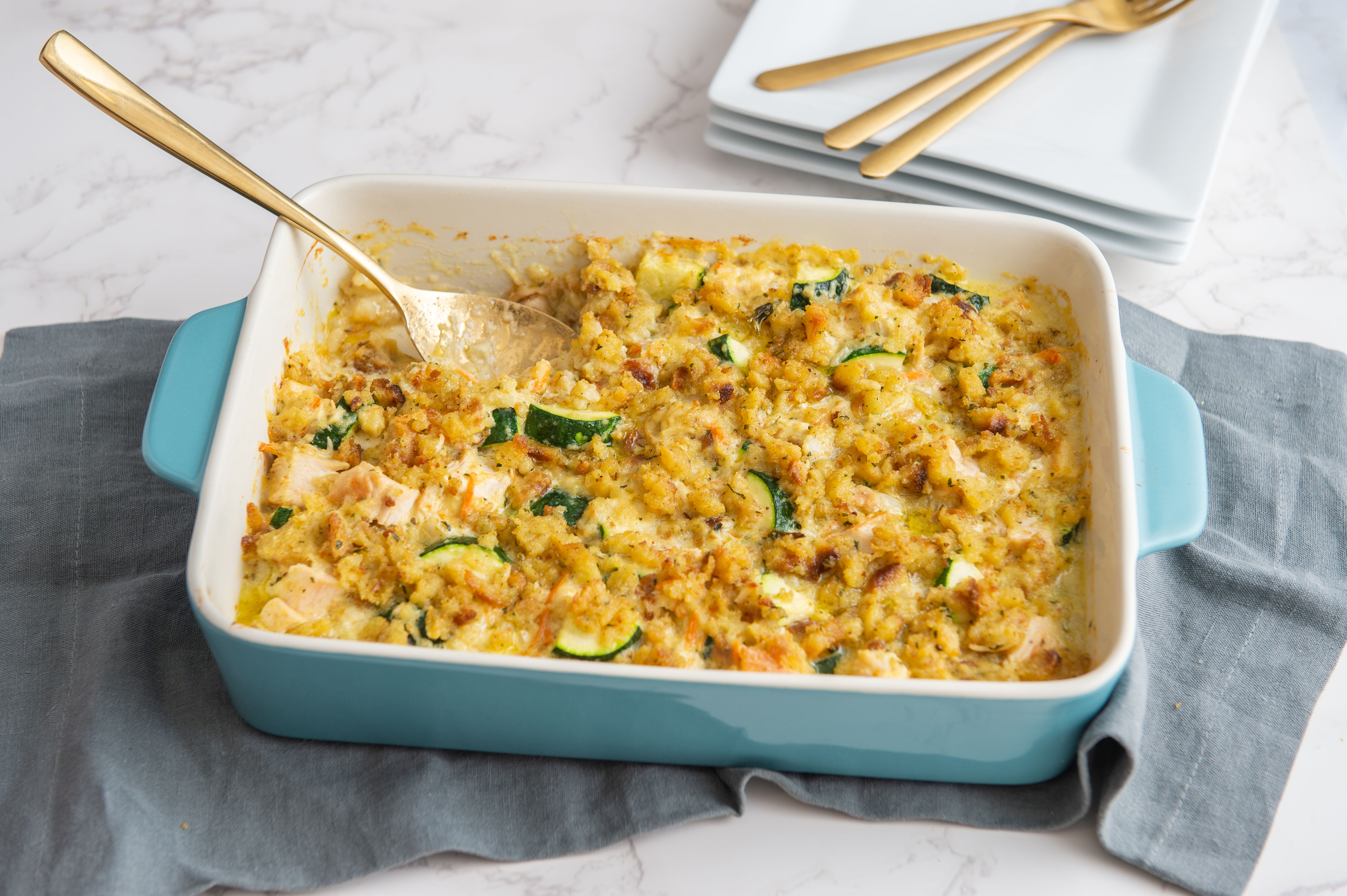Step 5 -Add the zucchini, the chicken breast, the cream of chicken soup, the carrot, the onion, and the sour cream to the remaining stuffing mixture and mix well.
